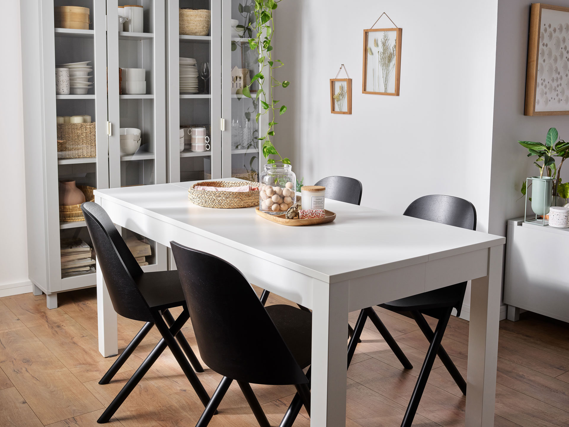 Jeśli domowników jest sporo, szczególnie dobrze sprawdzi się prostokątny model. Podczas rodzinnych uroczystości niezastąpiony okaże się podłużny stół z kolekcji Simple z nowoczesnymi prowadnicami i dodatkowymi nogami, ukrytymi pod blatem. Może przybrać kilka różnych oblicz. Przy złożonym stole wygodnie usiądzie 6 osób, a przy maksymalnie rozłożonym – aż 14.
