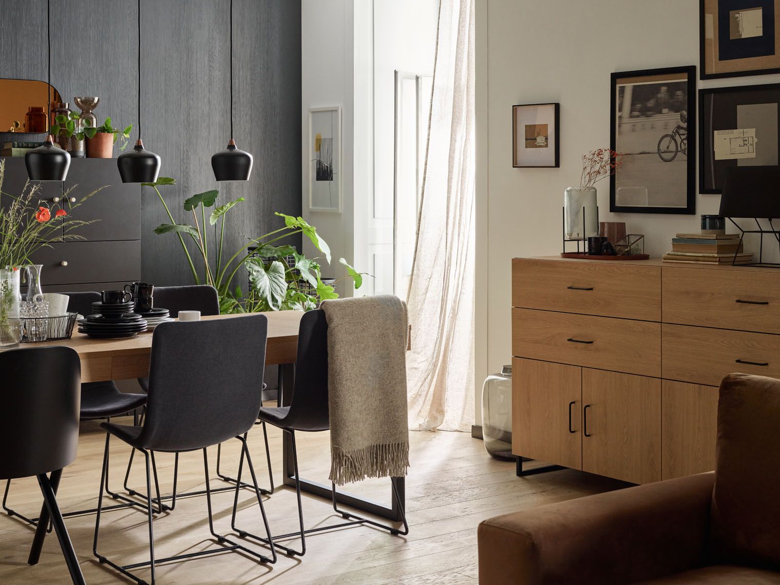 Ozdoby mogą pełnić także funkcje praktyczne. Uroczym akcentem w małym salonie będą porcelanowe talerze z ciekawym wzorem czy drewniana patera na słodkości. Dobierając dekoracje, warto zwrócić uwagę na to, aby współgrały ze sobą zarówno kolorystycznie, jak i stylistycznie. Jeśli nie mamy wolnej przestrzeni na liczne drobiazgi, zawieśmy nad blatem lampę Ball o nietypowym kształcie, która będzie stanowić ozdobę samą w sobie. Na stole wystarczy ustawić wtedy okrągły, szklany wazon Gunnar i wypełnić go świeżymi kwiatami, a mebel zyska spójną oprawę.