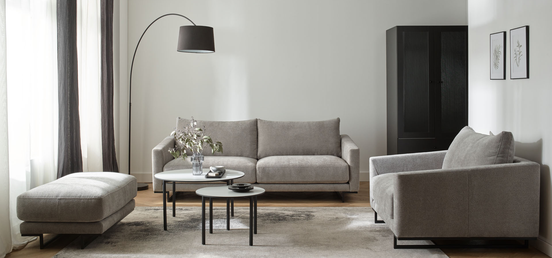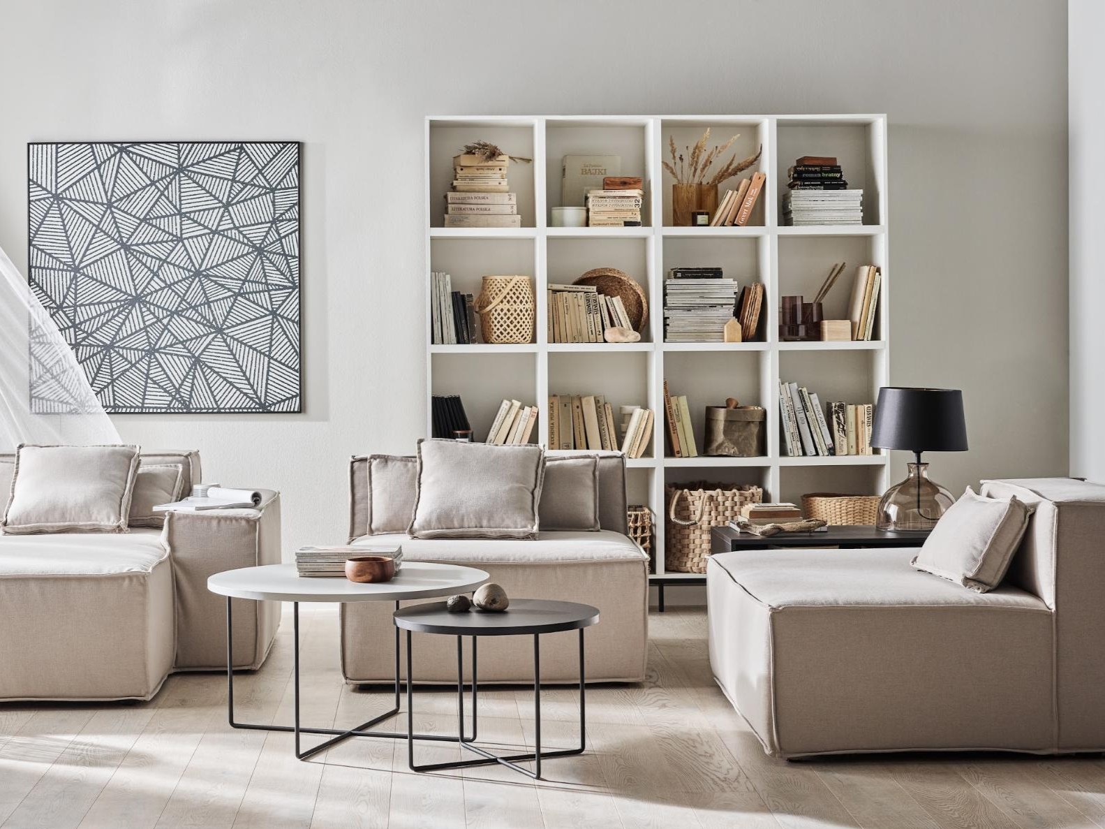 Takie rozwiązanie pasuje między innymi do nowoczesnego salonu. Wszelkie przedmioty warte wyeksponowania możemy poukładać na wysokim regale Creative z metalowymi nóżkami. Spójny efekt osiągniemy, jeżeli postawimy obok prosty stolik kawowy, wykonany z tych samych surowców. Podobne kolory i gładkie faktury mogą powtórzyć się w detalach, takich jak lampa komodowa Haga czy rama monochromatycznej grafiki Web. Oryginalny akcent wniesie wówczas miękka, pozbawiona nóżek kanapa złożona z modułów Chill.