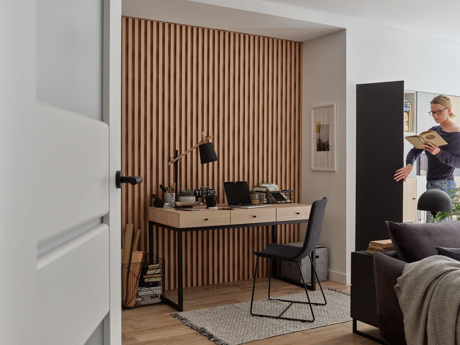 Dzięki naszej kreatywności wnęka może stać się niemal niezauważalną częścią salonu lub też, wręcz przeciwnie, akcentować swoją odrębność. Jeśli do dyspozycji mamy jedynie niewielkie wgłębienie, warto zabudować go regałem lub witryną. Mebel wtopi się w otoczenie, gdy wybierzmy bryłę dopasowaną do koloru ściany czy elementów znajdujących się nieopodal. Czekoladowe panele lamelowe Linerio będą harmonijnie korespondować z brązowym regałem skonfigurowanym w systemie Creative i przy okazji optycznie podwyższą pomieszczenie. Jasna ściana stanie się z kolei neutralnym tłem dla półek w białym kolorze. W utrzymaniu porządku pomogą specjalne pojemniki. Te wykonane z trawy morskiej doskonale dopełnią aranżację pełną naturalnych materiałów.