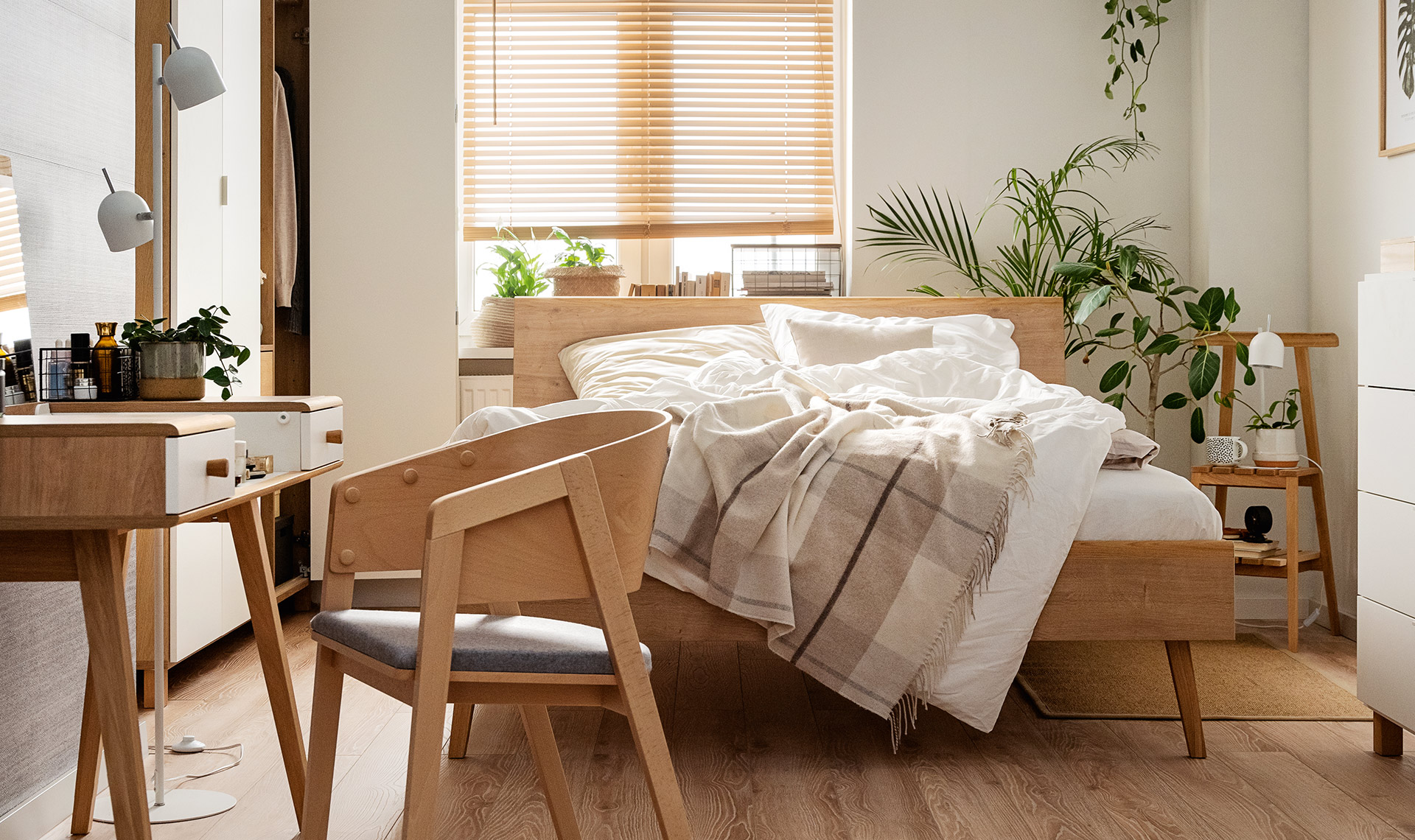 Jeżeli wybierzemy takie rośliny, jak skrzydłokwiat czy dracena, nie będziemy musieli poświęcać zbyt dużo czasu na ich pielęgnację. Pamiętajmy jednak, aby wystrzegać się trujących gatunków, zwłaszcza jeśli stałymi gośćmi w naszym pokoju snu są maluchy i zwierzaki. Zieloni lokatorzy mogą zagościć pod sufitem w wiszących osłonach Gora, zadomowić się na parapecie w jutowym koszu Bolsa lub stanąć na dębowym kamerdynerze, który po zdjęciu doniczki posłuży także jako siedzenie bądź podest, ułatwiający dostanie się do zawartości najwyższych półek w szafie.