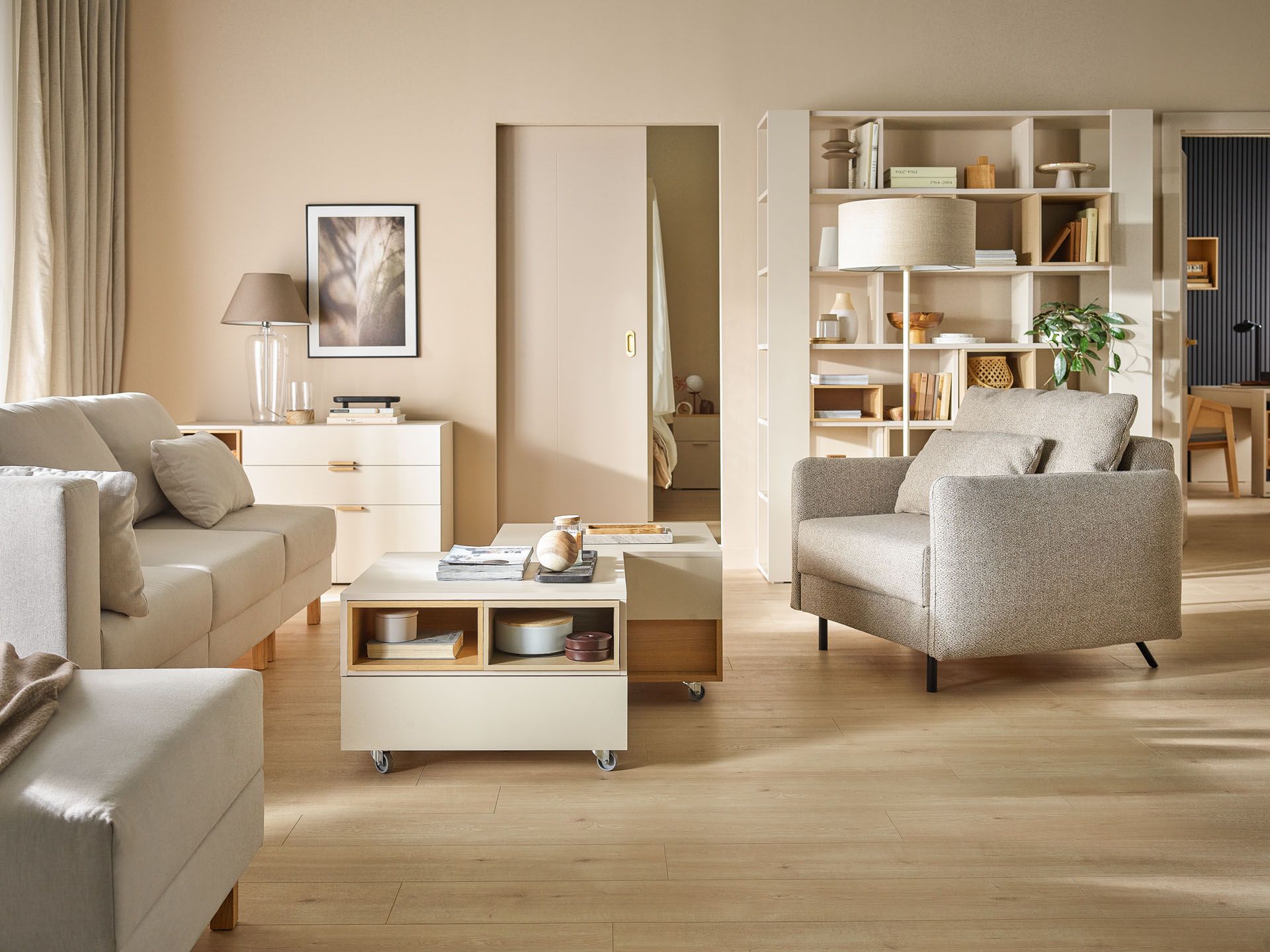 Do takiego mobilnego zestawu wystarczy dostawić stoliki kawowe Simple, aby nikt nie musiał się podnosić, gdy już wygodnie się ułoży. W szufladkach pod ich blatami ukryjmy przydatne drobiazgi, takie jak serwetki i dodatkowy komplet sztućców. Będą zawsze pod ręką, gdy ktoś nieopatrznie obleje się sokiem lub upuści widelec. Warto wybrać stoliki o różnej wysokości, dzięki czemu będziemy mogli wsunąć jeden pod drugi, gdy akurat nie będą potrzebne, i zyskać wolną przestrzeń.