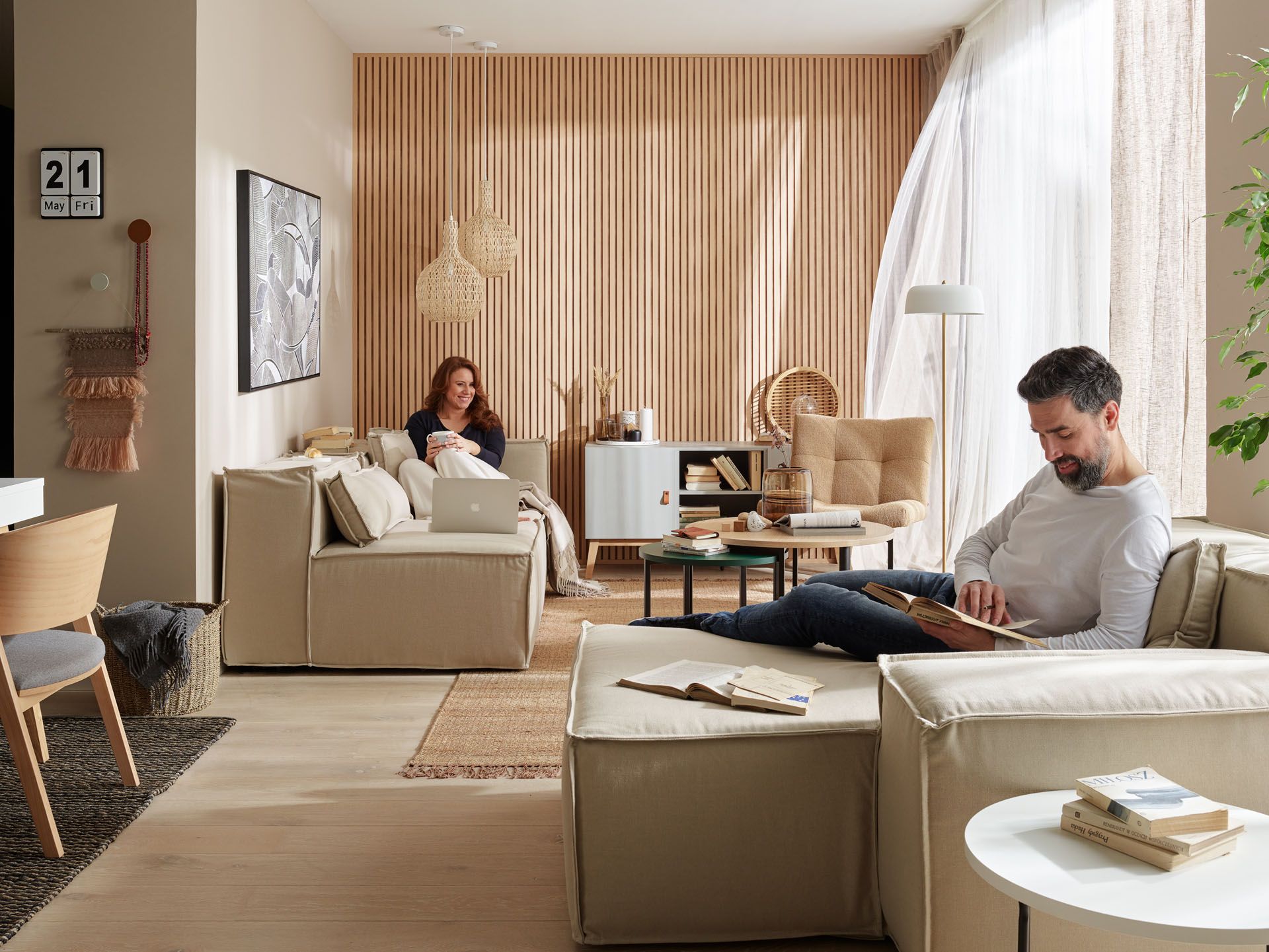 Ciekawym rozwiązaniem do salonu bez telewizora są modułowe meble. Na co dzień poszczególne elementy z kolekcji Chill czy Pelo mogą tworzyć duży narożnik bądź kanapę, idealną do popołudniowej drzemki. Gdy odwiedzą nas goście, będziemy mogli rozsunąć poszczególne siedziska, dostosowując ich układ do aktualnych potrzeb. Świeżo upieczona para może wówczas obejmować się na sofie, a przyjaciel ceniący osobistą przestrzeń relaksować się na pojedynczej otomanie. Dzięki szerokiemu wyborowi tkanin z łatwością dobierzemy idealną tapicerkę do wystroju salonu – od naturalnej wełny po odporny na kocie pazury welur.