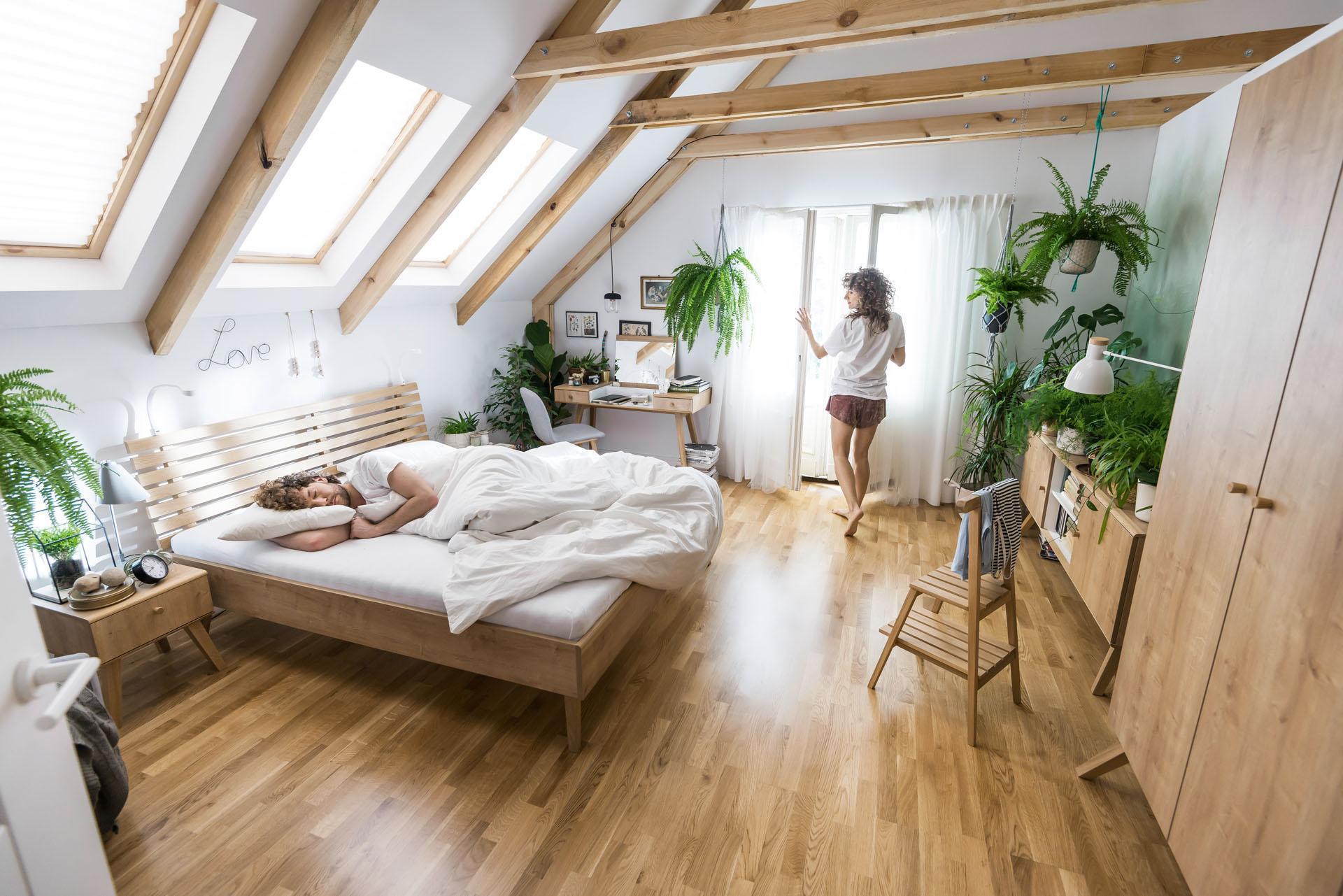 Sypialnia na poddaszu ma niepowtarzalny klimat. Widoczne więźby dachowe tworzą oryginalną dekorację, a to sprawia, że dzięki niewielkiemu wysiłkowi możemy urządzić to pomieszczenie w niezwykle efektowny sposób. Dodatkową zaletą jest możliwość obserwowania rozgwieżdżonego nieba. Taki widok pozwoli nam złapać oddech i wyciszyć emocje tuż przed snem.
