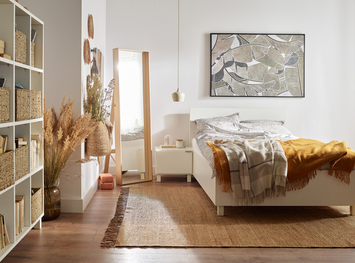O harmonię w aranżacji sypialni zadbają również inne tekstylia, takie jak niewielkie dywany. Te wykonane z wełny mogą dostarczyć naszym stopom przyjemnych bodźców dotykowych. Dodatkowo pomogą zadbać o czystość w pomieszczeniu (utrudniają wnikanie kurzu) oraz zachować odpowiedni poziom wilgotności w powietrzu.