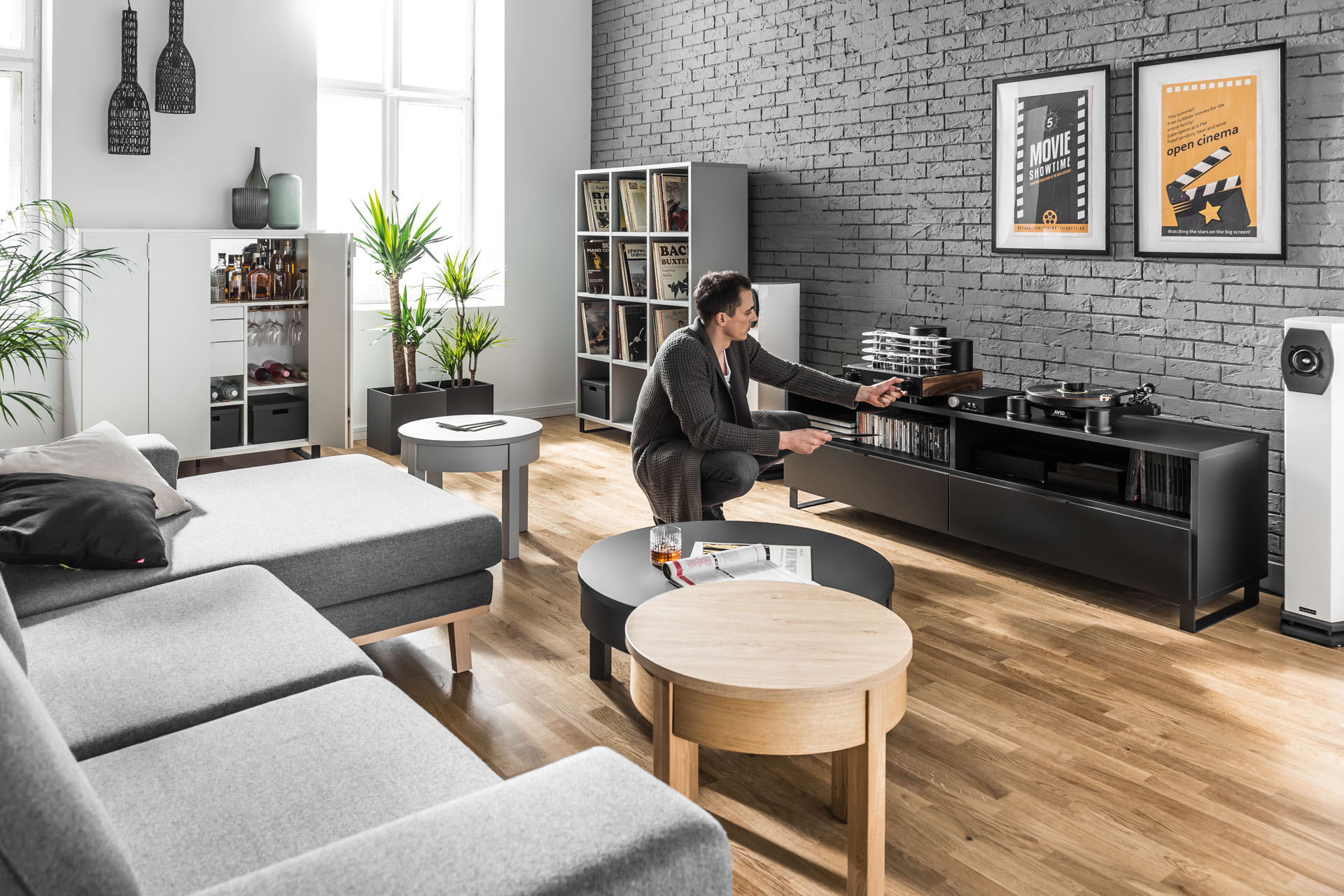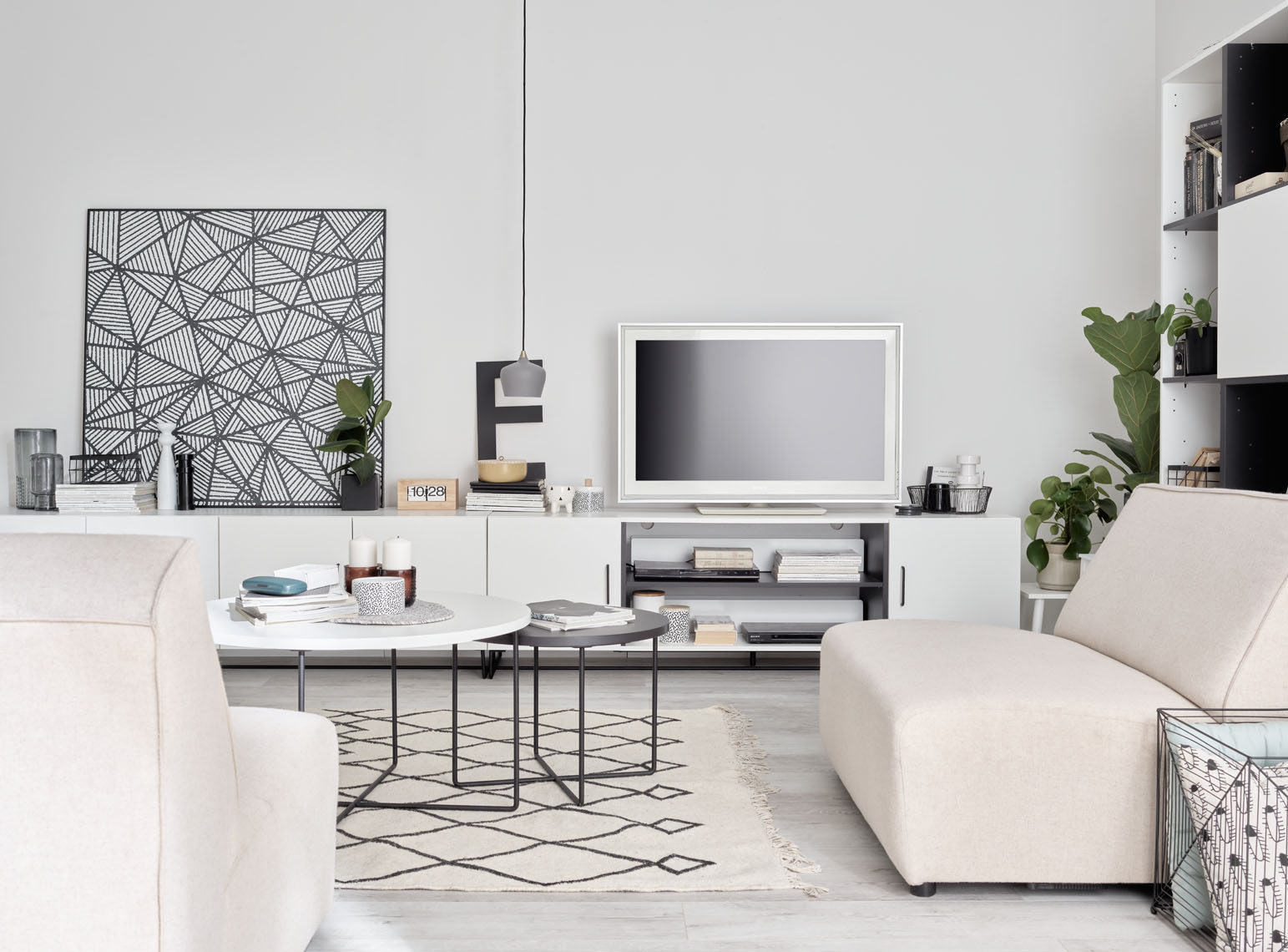 Przy tak zaaranżowanej ścianie swoje miejsce znajdą też geometryczne meble Ribbon. Szafka RTV z tej kolekcji nie tylko posiada oryginalną i lekką formę, ale jest też wyjątkowo prosta do złożenia – wystarczy, że do gotowego elementu dokręcimy nóżki. Do kompletu możemy dobrać do niej wysoki lub niski regał, a także półkę, na których ustawimy ulubione książki, figurki i inne drobne przedmioty warte wyeksponowania.