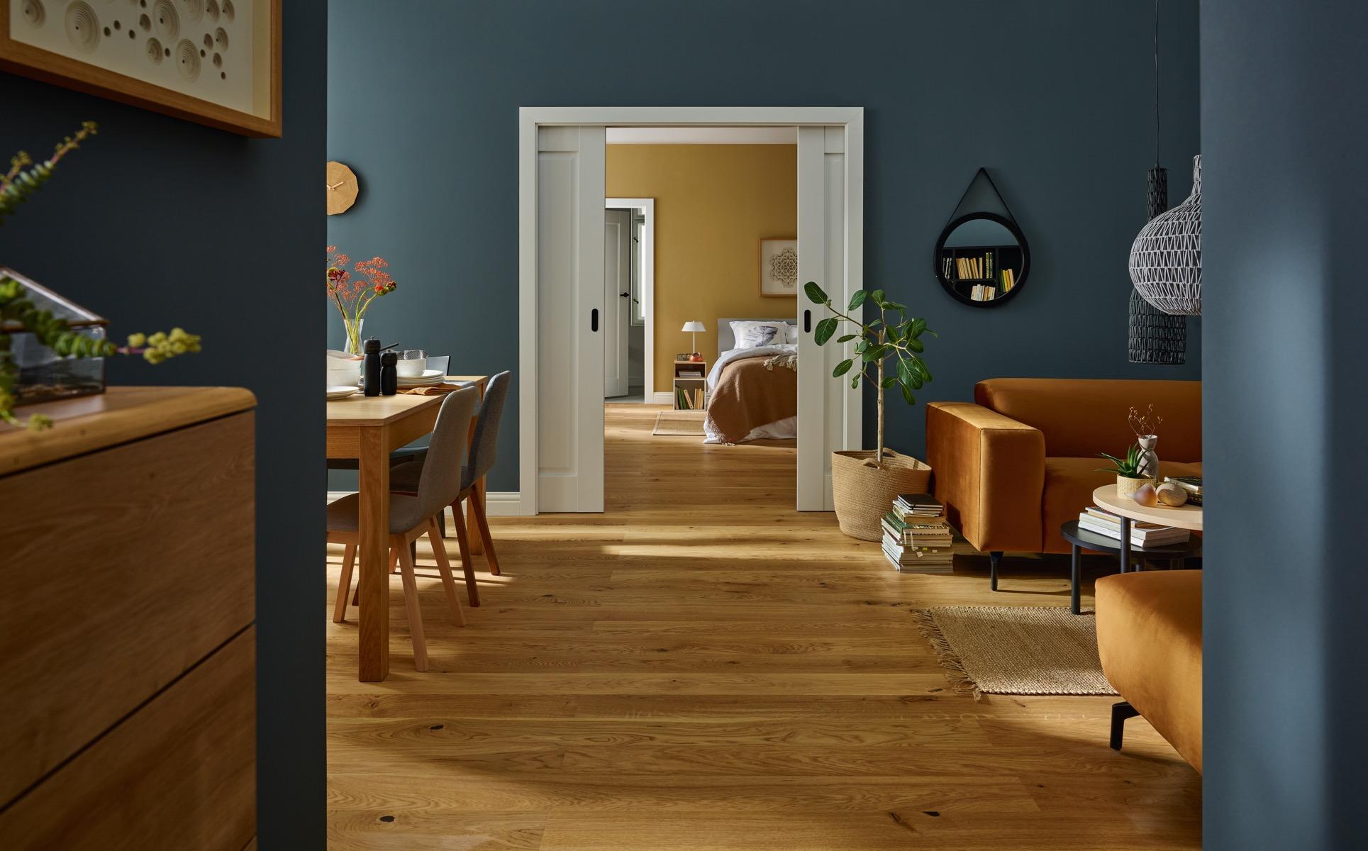 Do sypialni warto zaprosić klasyczne meble z drewnianymi elementami z kolekcji OMM. Jasna szafka, stolik czy łóżko zaprezentują się szczególnie ciekawie na tle przestrzennej dekoracji ściennej, stworzonej przy użyciu paneli lamelowych. Granat warto wprowadzić wtedy w formie dodatków, takich jak miękka poduszka oparciowa. Dzięki temu w razie potrzeby szybko odświeżymy aranżację, zmieniając akcent kolorystyczny.