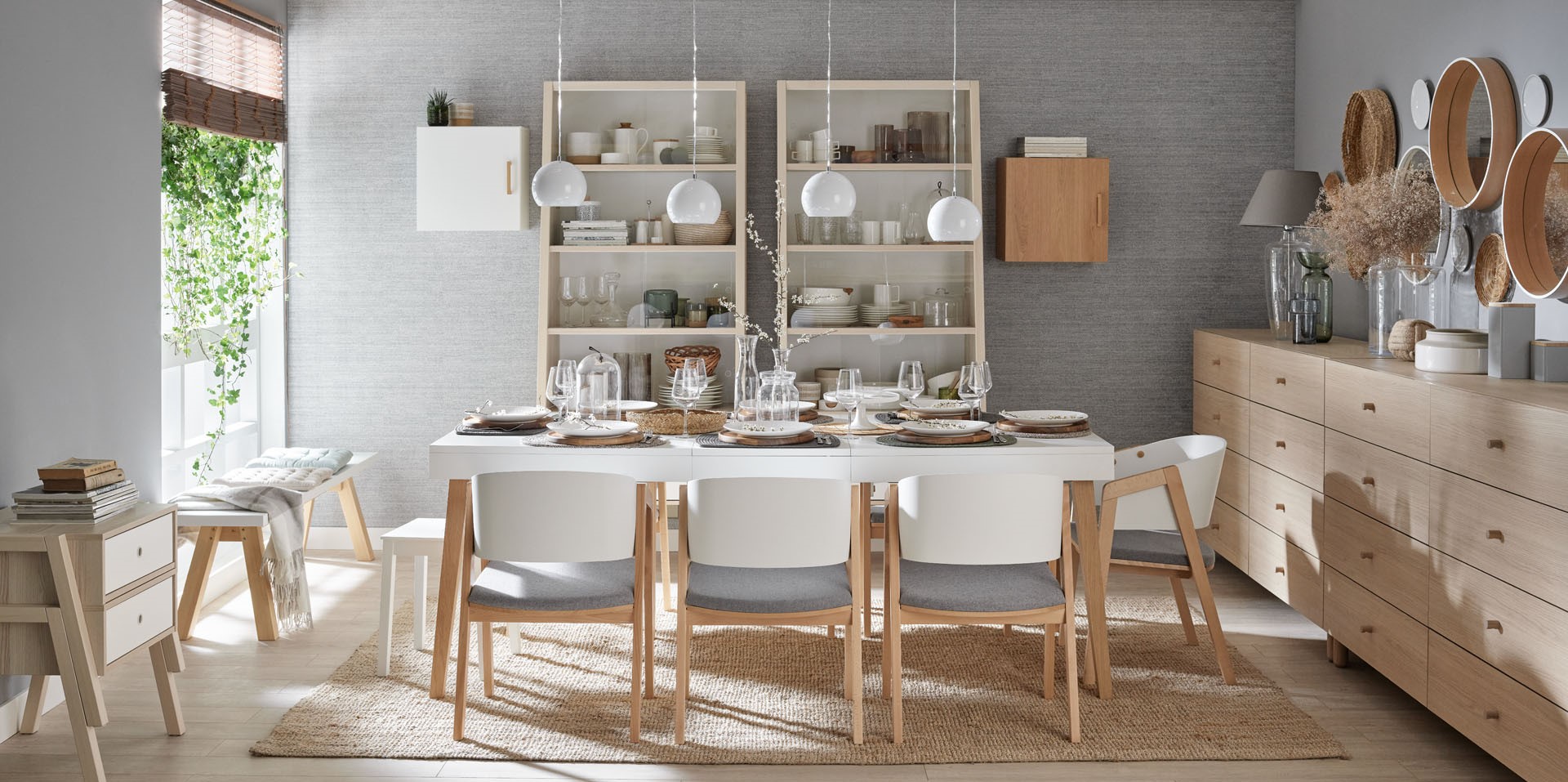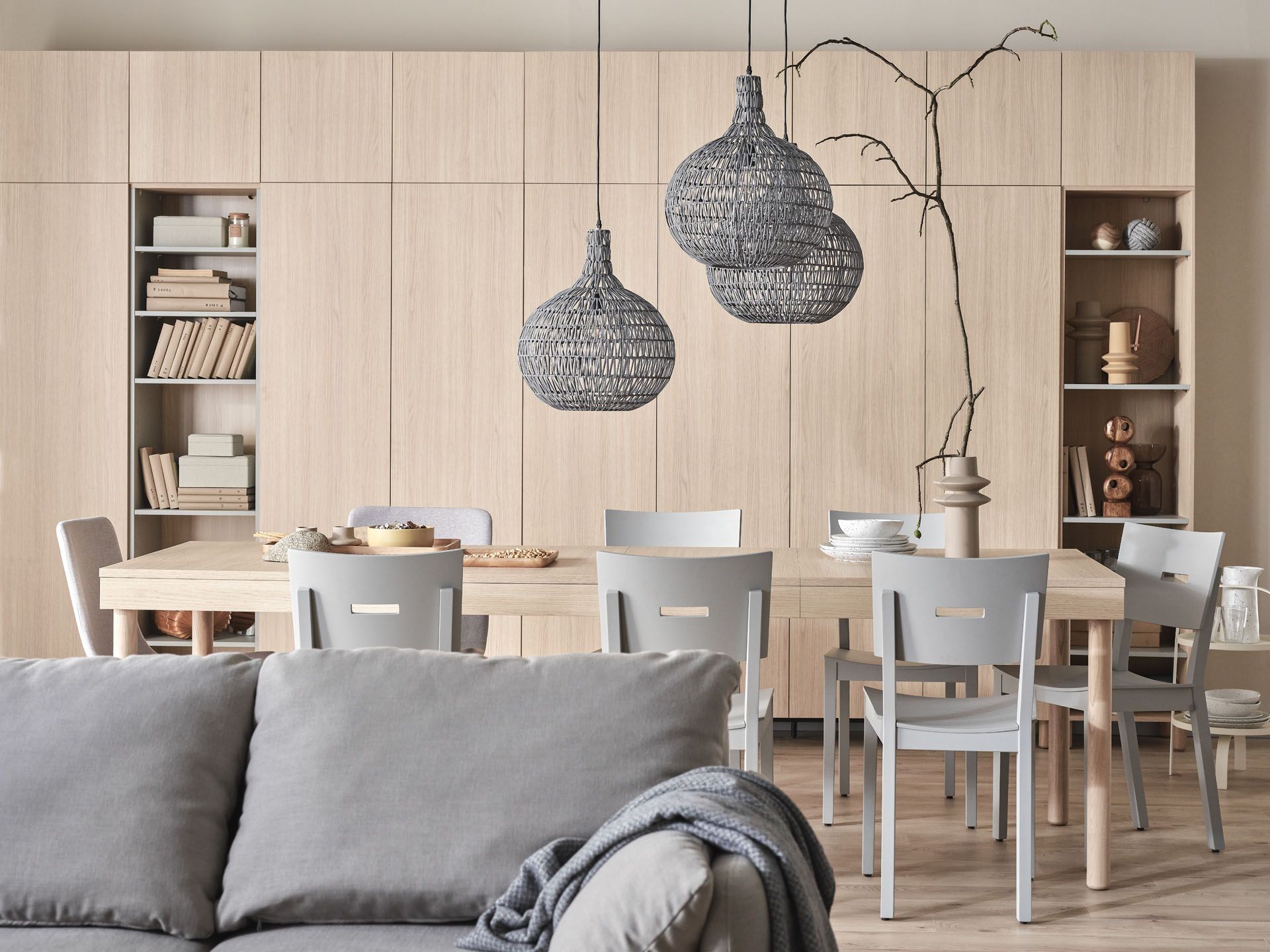 Kolejna uniwersalna kompozycja zakłada połączenie szarości z naturalnymi odcieniami drewna. Pozwólmy mu wybrzmieć w postaci dębowych regałów, komód, szafki RTV, czy stolika kawowego. Ożywią one kompozycję szarych paneli połogowych, sofy i zwiewnych zasłon w pokoju dziennym. Aby nadać naszemu pomieszczeniu charakter, uzupełnijmy aranżację o czarne dodatki. Do stolika kawowego Simple dobierzmy drugi – niższy i w ciemniejszym kolorze. Na komodzie postawmy szklaną lampę, a z sufitu niech zwisa oryginalna geometryczna lampa Ombra. Z czarnymi nóżkami mebli te wszystkie elementy stworzą spójny efekt.