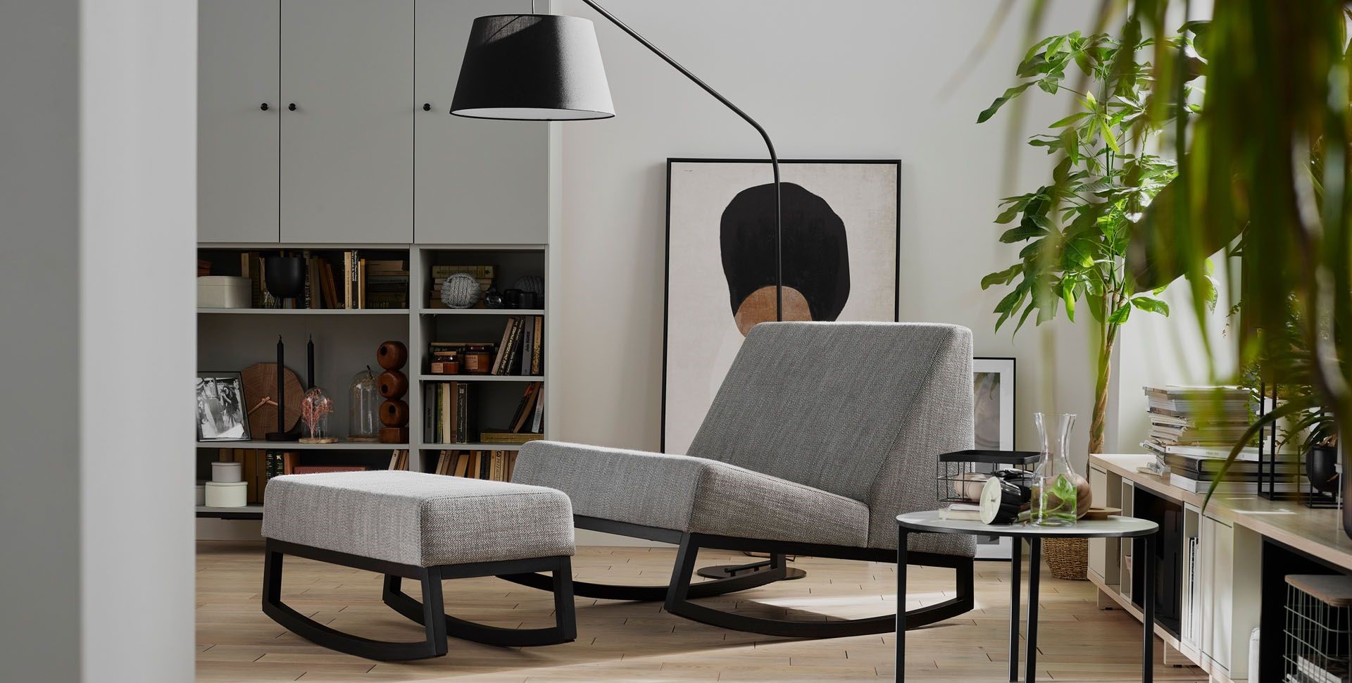 Monochromatyczne wnętrze? Czemu nie! Jaśniejsze i ciemniejsze odcienie szarości stworzą spójną mieszankę, która świetnie sprawdzi się w szarym salonie, sypialni lub przedpokoju. Taka spokojna i stonowana aranżacja wcale jednak nie musi być nuda. Wystarczy, że pobawimy się różnymi tonami i sprytnie przemycimy je w postaci mebli, szarej podłogi czy dodatków. By uzyskać odpowiednio elegancki, łagodny efekt, postarajmy się jednak dobierać je w taki sposób, by w jednej aranżacji spotkały się odcienie szarości o podobnej temperaturze. I tak na tle gołębiej ściany swoje miejsce znajdzie antracytowa sofa Slide w towarzystwie wygodnego podnóżka i mobilnego stolika kawowego 4 You. Całość ożywią rośliny i drewniane detale.