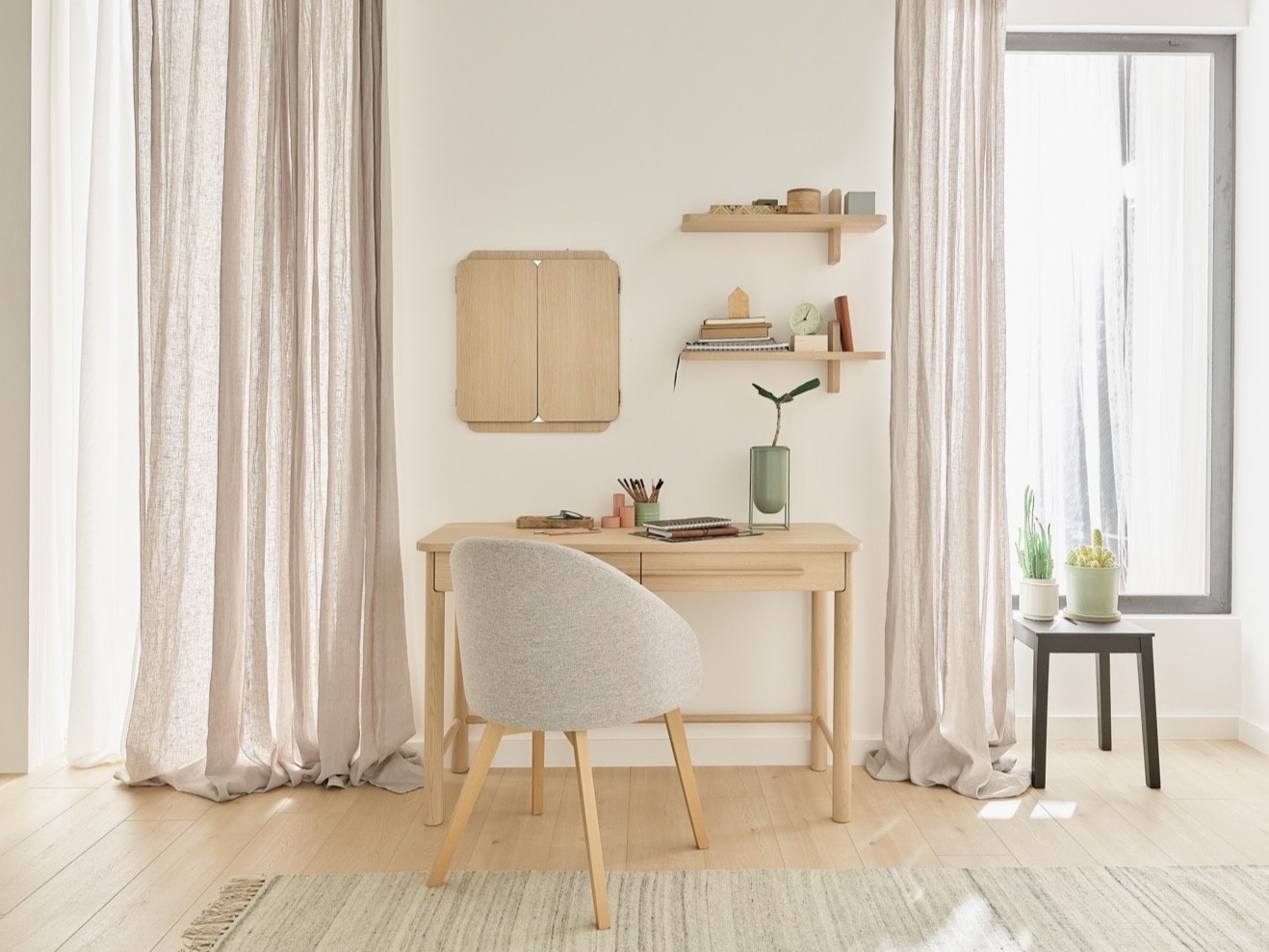 Toaletka Omm w kolorze jasnego drewna i krzesło Komm w miękkiej beżowej tkaninie to przepis na elegancki kącik pielęgnacyjny, pasujący do wystroju w stylu skandynawskim lub boho. Zawieszone nad blatem teatralne lustro można w razie potrzeby złożyć, by nie rozpraszało, gdy nagle przestrzeń zacznie pełnić funkcję domowego biura.