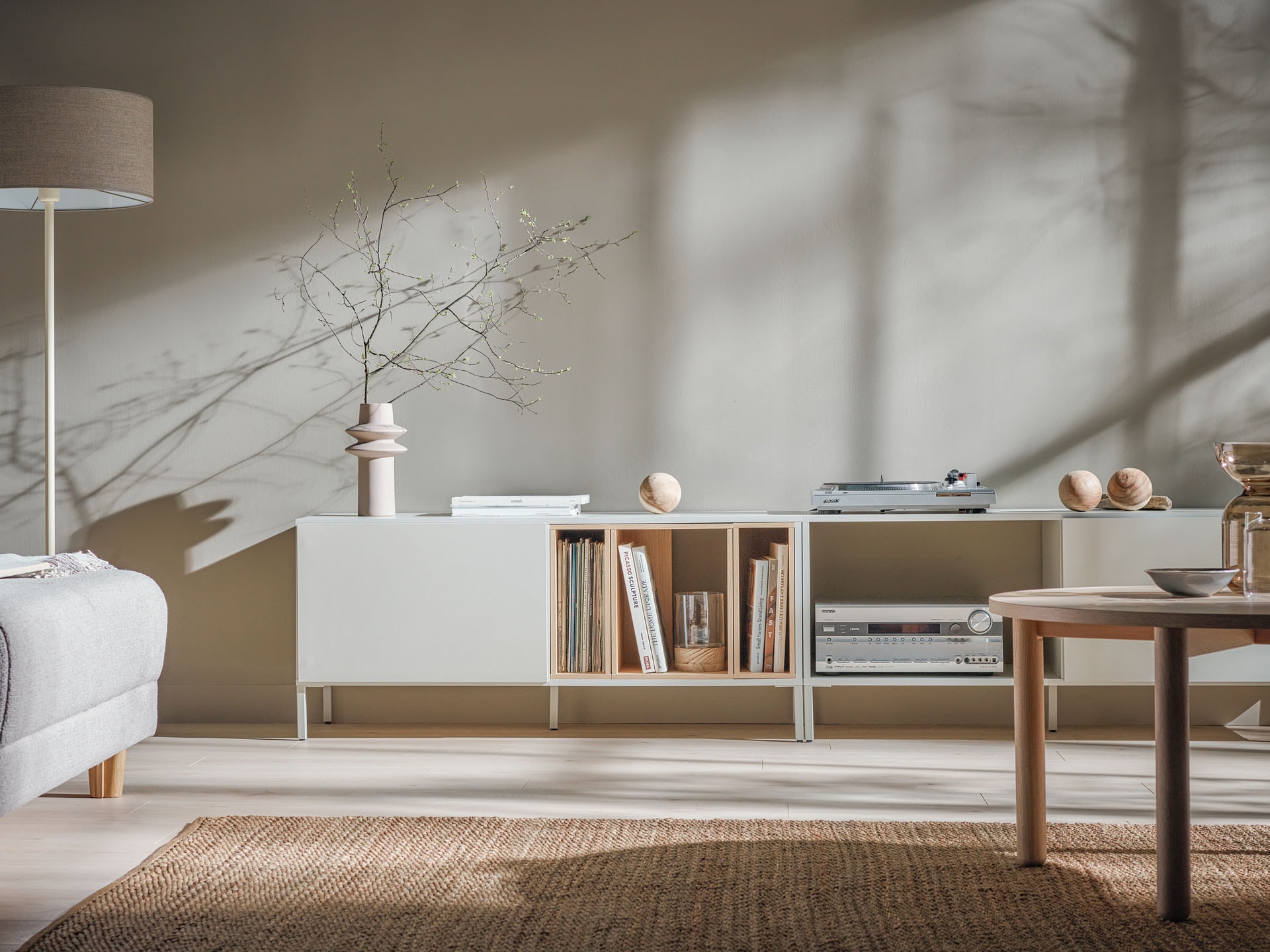 Nad komodą możemy zawiesić efektowną grafikę w ramie z serii Fiore, która wprowadzi botaniczny motyw w minimalistycznym wydaniu. Stworzy udaną kompozycję z komodową lampą Lou, której jasny materiałowy klosz miękko rozprasza światło, budując przytulny nastrój i wydobywając z otoczenia ciepłe tony kaszmiru.