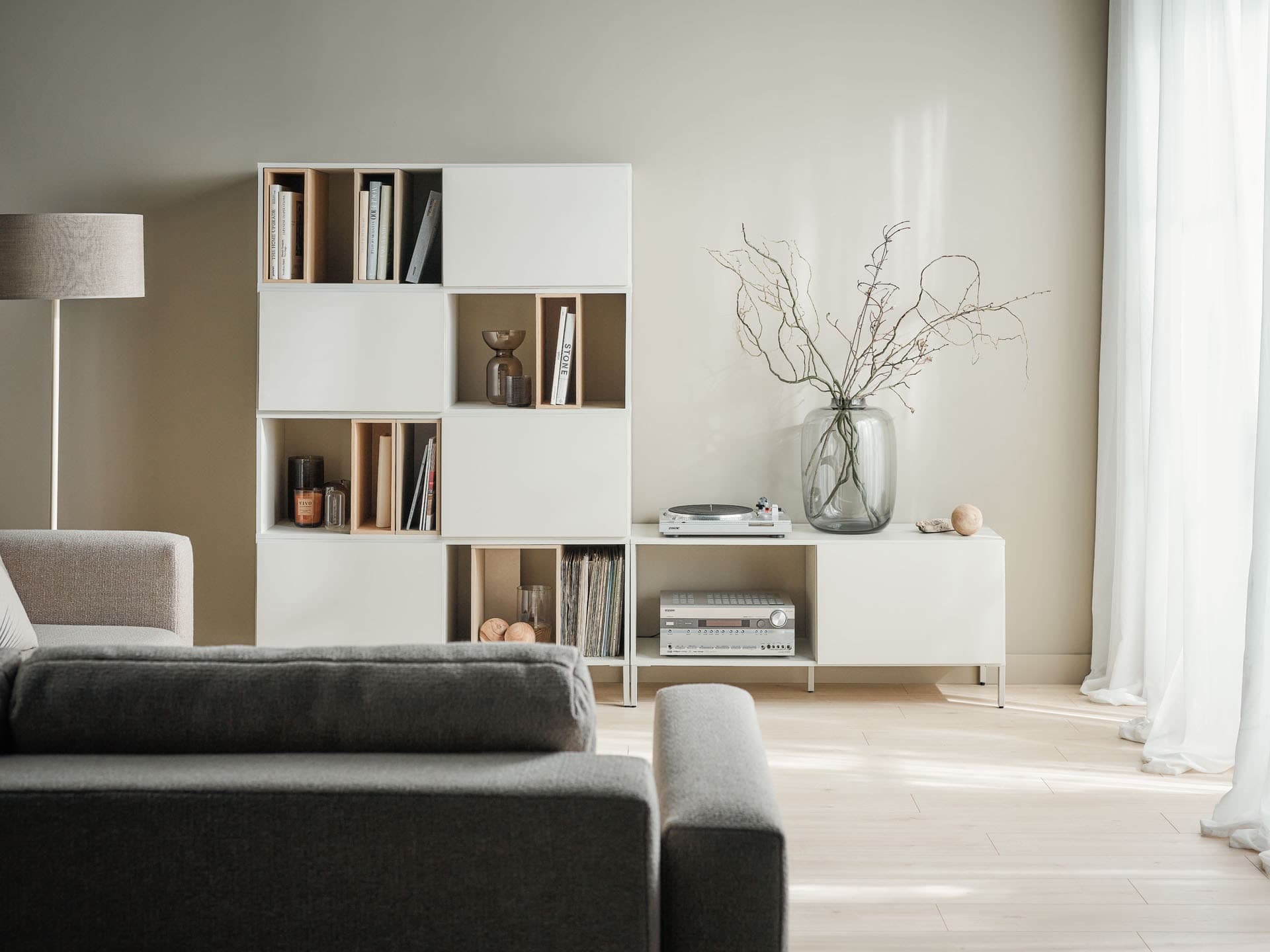 Kaszmirowy kolor wyjątkowo dobrze odnajdzie się w postaci mebli. Szafy, komody, regały czy stoliki w tym odcieniu łatwo wkomponować w zmieniające się trendy i gusta domowników. Na tle pastelowej ściany swoje miejsce odnajdzie półotwarty regał Into, który można urozmaicić skrzynkami w wybranym kolorze. Dzięki temu, że unosi się lekko na wysokich nóżkach, wnętrze zyskuje na przestronności, a codzienne sprzątanie jest łatwiejsze.