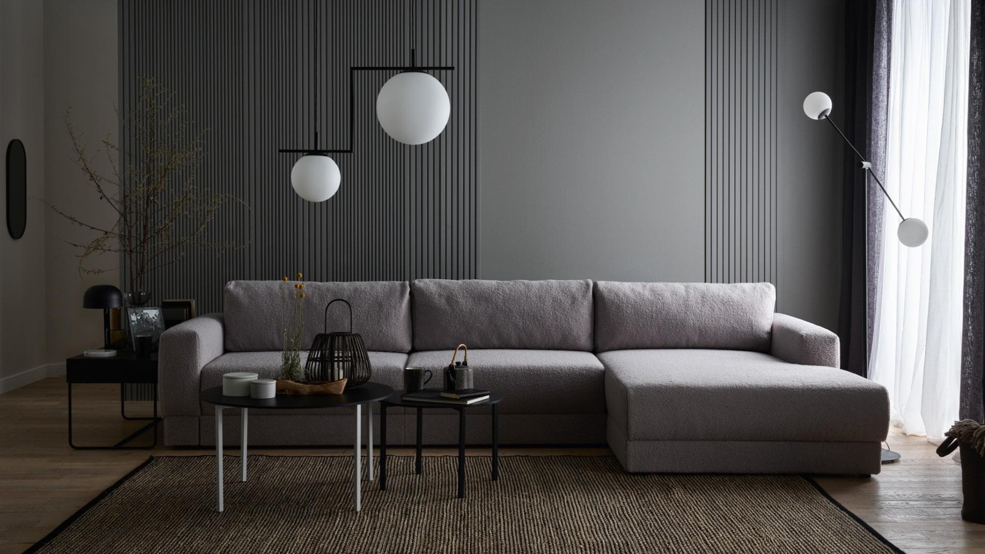 Grafitowy, monochromatyczny look to przepis na nowoczesny salon z nutą tajemnicy. Kompozycja lameli na ścianie za dużym narożnikiem Stello stworzy efekt trójwymiarowości, a różnorodna szerokość listew doda wnętrzu dynamiki. Dzięki temu ściana (mimo jednolitej kolorystyki) nie będzie monotonna. Całość wprowadzi harmonijny klimat, w którym każdy element idealnie ze sobą współgra.