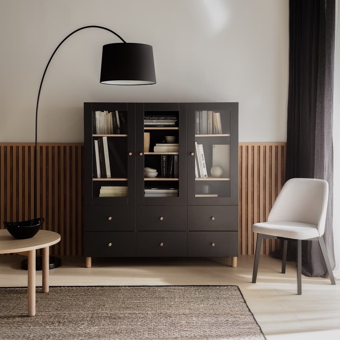 Kto powiedział, że lamele mogą stanowić jedynie dekoracyjny akcent? Równie dobrze montaż lameli możemy przeprowadzić na całej głównej ścianie, a kompozycję przedłużyć również o sufit. Lamele Linerio w rozmiarze XS, dzięki swojej strukturze, dodadzą wnętrzu głębi, a jednocześnie wprowadzą ciekawy rytm i fakturę, która ożywi przestrzeń. Te w kawowym kolorze połączone z komodą Creative w tej samej tonacji stworzą spójną i elegancką aranżację.