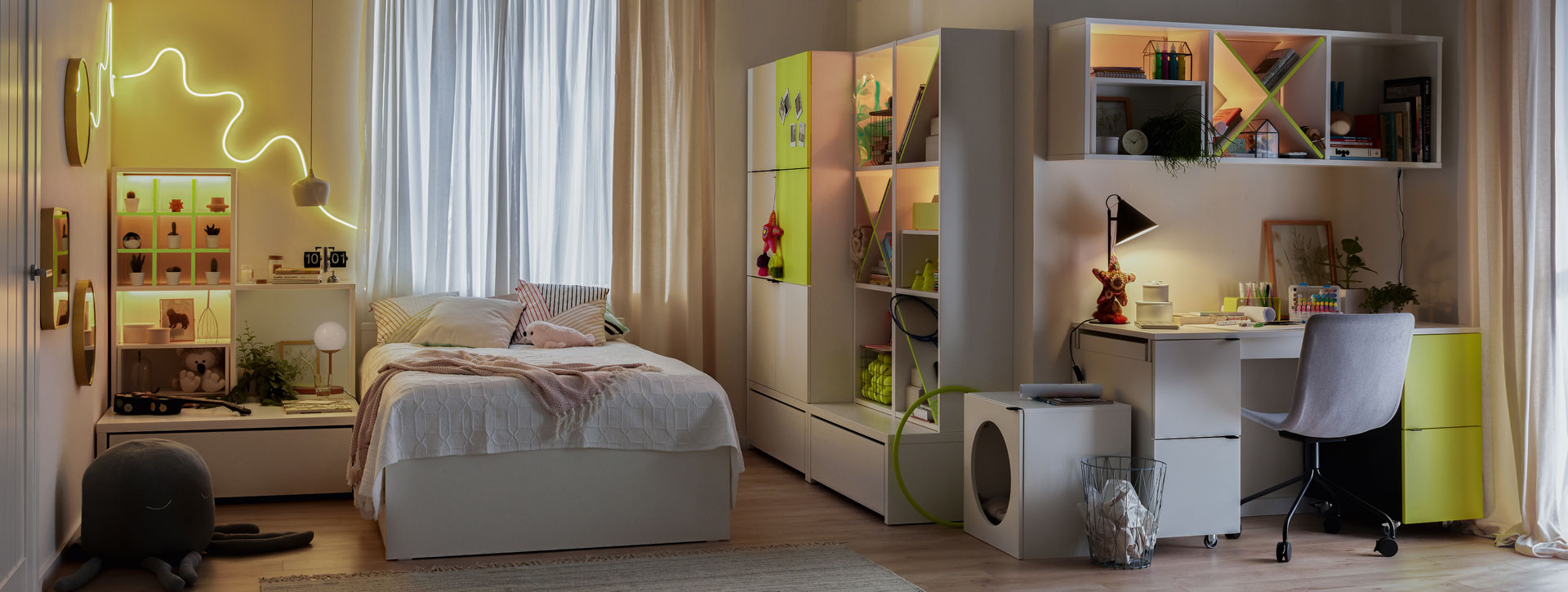 Za metamorfozę pokoju może również odpowiadać oświetlenie. Padające światło potrafi odmienić atmosferę, sprawiając, że przestrzeń wydaje się przytulna i tajemnicza lub wręcz przeciwnie – jasna i pełna energii. Chcąc odświeżyć wystrój wnętrza, wystarczy wprowadzić dodatkowe źródło światła w postaci podłogowej lampy Dream czy sznura kolorowych lampek Happy Lights. Zauważalną zmianę da nam także wymiana żarówek. Uzyskując inną barwę światła, stworzymy zupełnie nowy nastrój.