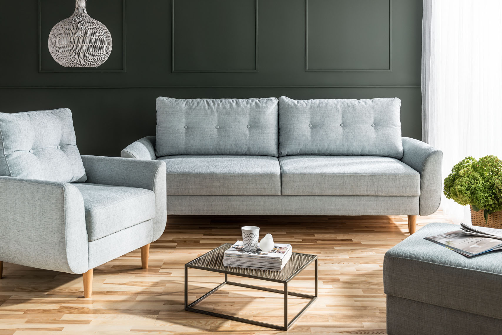 Na tle zielonej ściany swoje atuty zaprezentuje miękka trzyosobowa sofa Cotta z funkcją spania, idealne rozwiązanie dla właścicieli kawalerek. Za dnia służy jako wygodna kanapa, z kolei nocą z powodzeniem spełnia funkcję wygodnego łóżka. Pikowanie, w połączeniu z kolorem butelkowej zieleni, nadaje uroczysty charakter i przywodzi na myśl szykowne pałacowe sypialnie. Dobrym uzupełnieniem dla sofy będzie miły w dotyku pled np. biały lub ciemnoszary.