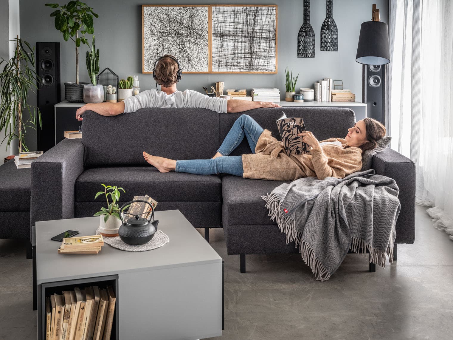 Minimalistyczny szary narożnik Repos otoczony bielą i dodatkami w ciepłych odcieniach umożliwi zachowanie wyważonego charakteru aranżacji. W tak urządzonej przestrzeni każdy będzie czuł się dobrze. Żeby przełamać surowość betonowej podłogi, warto przykryć ją puchatym dywanem, który stworzy przyjemne oparcie dla stóp. Na półkach dobrze sprawdzą sentymentalne drobiazgi, które nadadzą wnętrzu osobistego charakteru.
