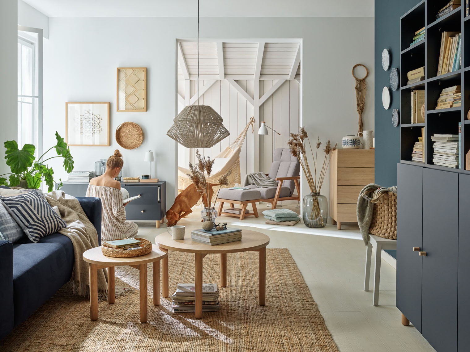 Granatowa kanapa w połączeniu z jasnymi ścianami i granatowymi meblami Creative stworzy elegancką i nowoczesną przestrzeń. Jeśli chcemy sprawić, że zyska ona nieco sielankowego sznytu – dodajmy jutowy dywan i stolik kawowy Creative w dębowym kolorze. Na ścianach odnajdą się drewniane ramki na zdjęcia czy botaniczne dekoracje.
