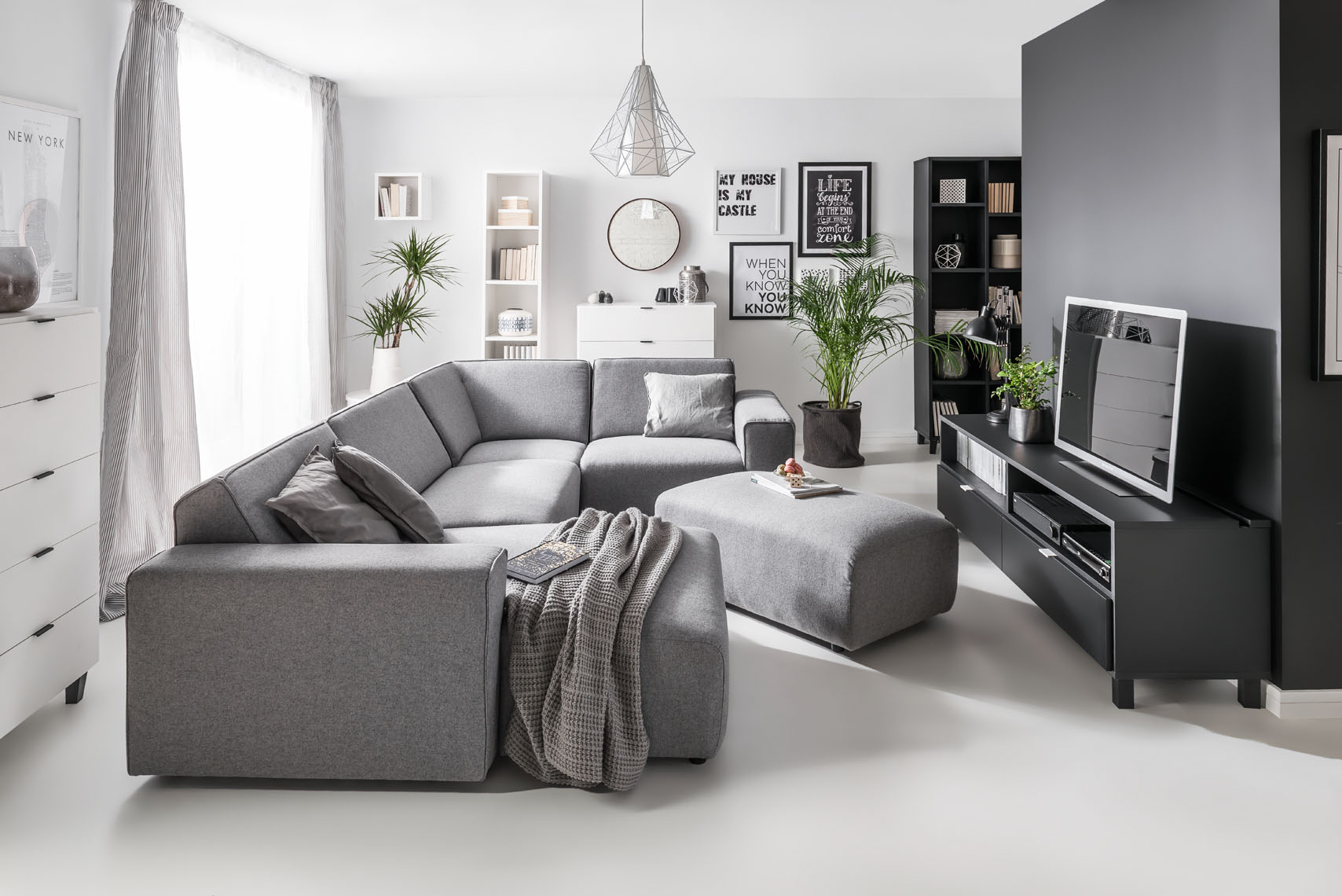 Gdy w aranżacji salonu postawimy na odcienie szarości, całość możemy uzupełnić jasnymi meblami. Stworzymy w ten sposób harmonijną kompozycję, w której kolorystycznie odznaczą się kolorowe grzbiety książek, wzorzyste koce i poduszki, osobiste pamiątki czy ramki ze zdjęciami, a nawet – tapicerka w ciepłym, wyrazistym odcieniu. Wystarczy podczas konfiguracji mebla wybrać tkaninę w jednym z kolorów, które pasują do szarego.