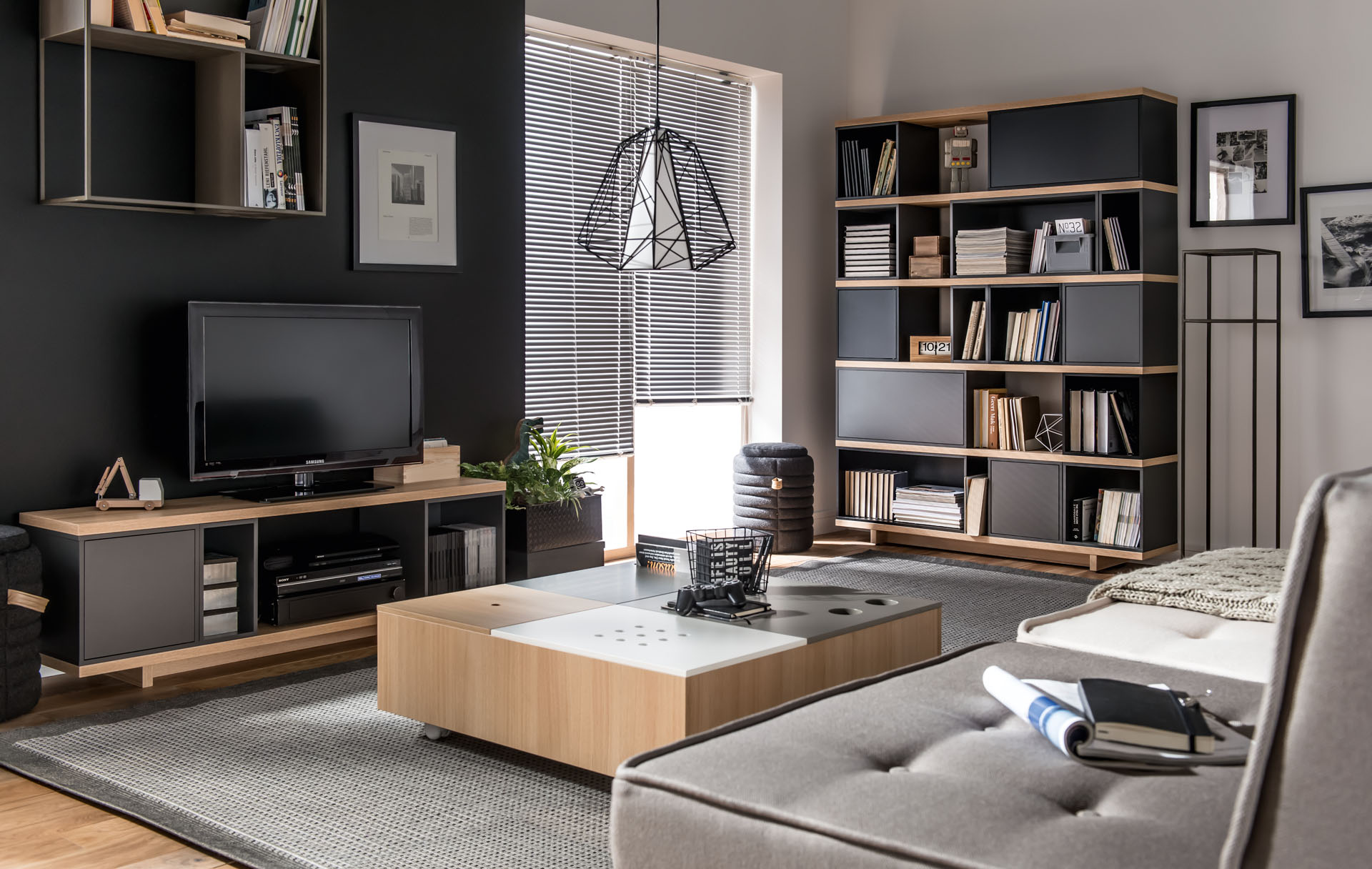 Przestrzenny rytm szarości, a także bieli i czerni możemy też skomponować sami, dowolnie konfigurując szafki, regał czy komodę z kolekcji Balance. Do wygodnych skrzynek, przyborników i organizerów z czasem możemy dokupić kolejne, a dzięki cokołom i półkom w ciepłym odcieniu jasnego dębu nasza wielofunkcyjna układanka zgrabnie dopasuje się do szarego salonu.