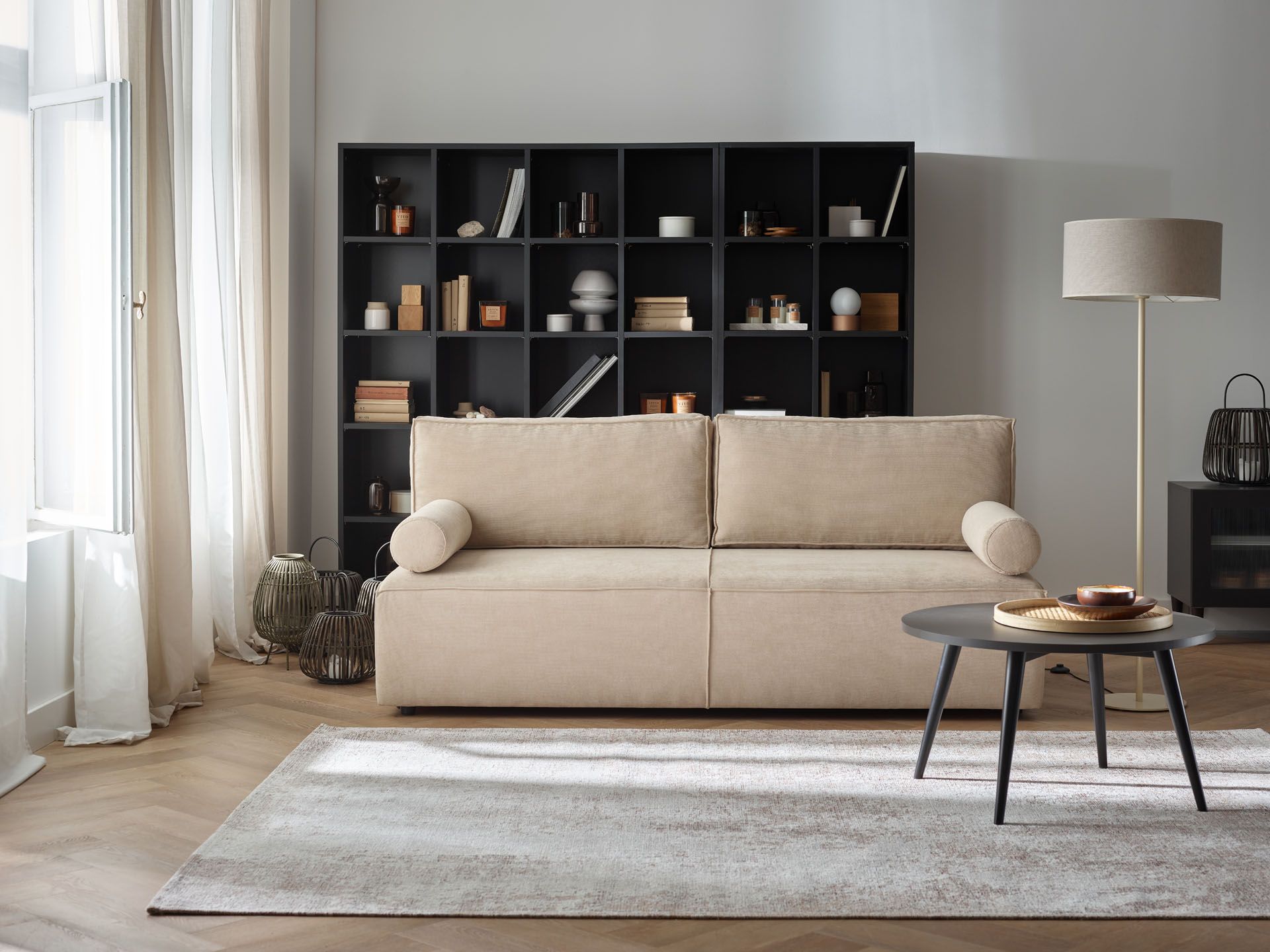 Z łatwością uzyskamy też miejsce do spania dla gości i dodatkową przestrzeń do przechowywania, korzystając z wbudowanych schowków. Uniwersalna konstrukcja wypoczynku ułatwi zaplanowanie ustawienia pozostałych mebli w salonie i zadba o minimalistyczny wystrój.