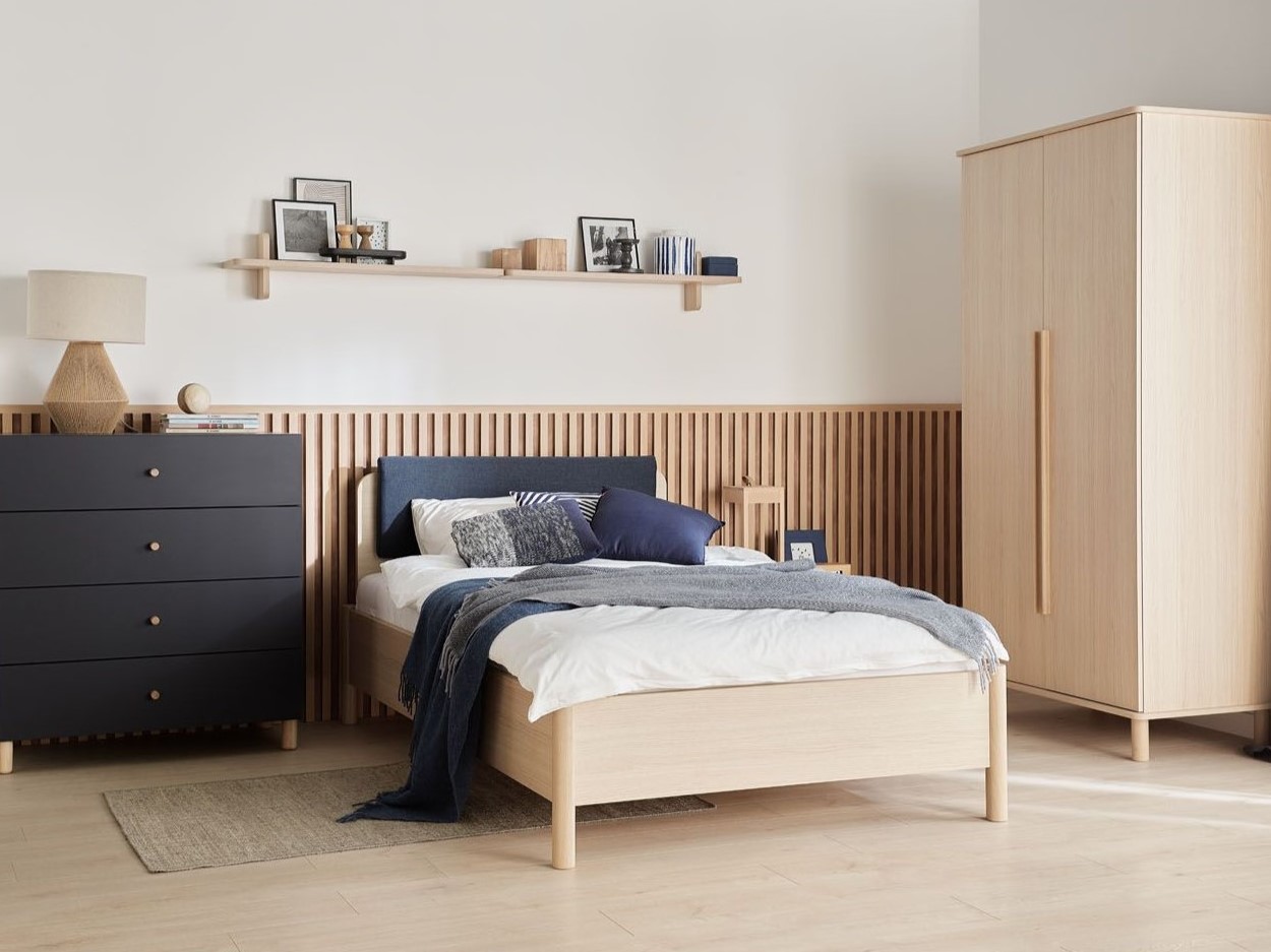 Zagłówek stanowi dodatkową warstwę izolacyjną, osłaniającą głowę przed chłodną ścianą. Ociepli sen i wnętrze: łagodne, geometryczne wzory i miękko wykończona subtelnie podkreślą intymny charakter pomieszczenia.