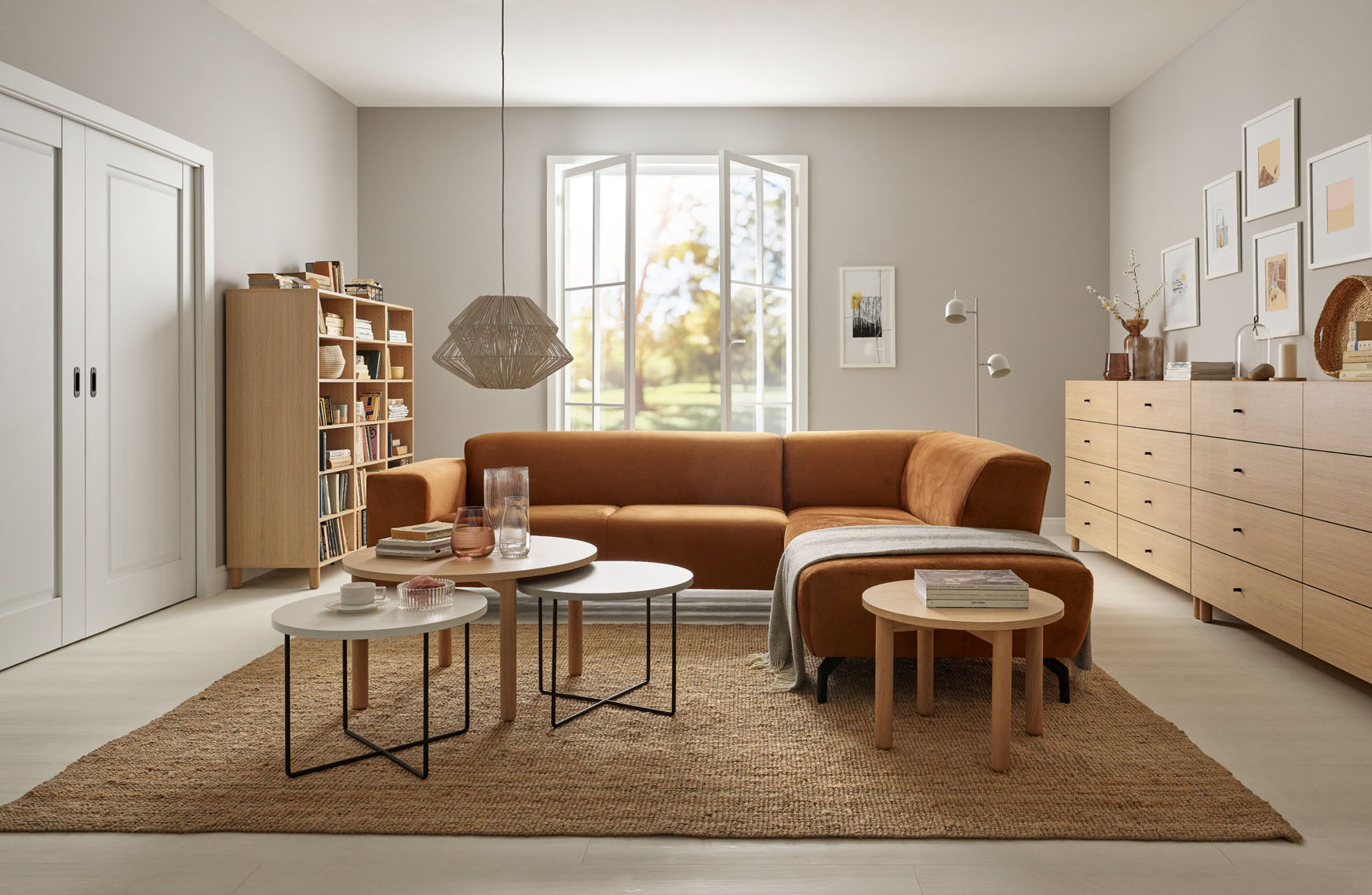Przytulność salonu podkreśli duet stolików Simple o dębowym dekorze z małymi szufladkami na podręczne drobiazgi. Jeśli dobierzemy do nich pleciony pojemnik Pajo i przydymiony wazon Bulbe, stworzymy beztroski, wakacyjny klimat, dzięki któremu łatwiej nam będzie się odprężyć. Możemy zaprojektować również zestaw różnych stolików kawowych wraz z systemem Creative. Eksperymentując, warto trzymać się palety odcieni dominujących w salonie, a surowce obecne w wykończeniach mebli powtórzyć na przykład w ramach obrazów na ścianie. Dzięki temu uzyskamy harmonijną aranżację, bazującą na ulubionych motywach przewodnich.