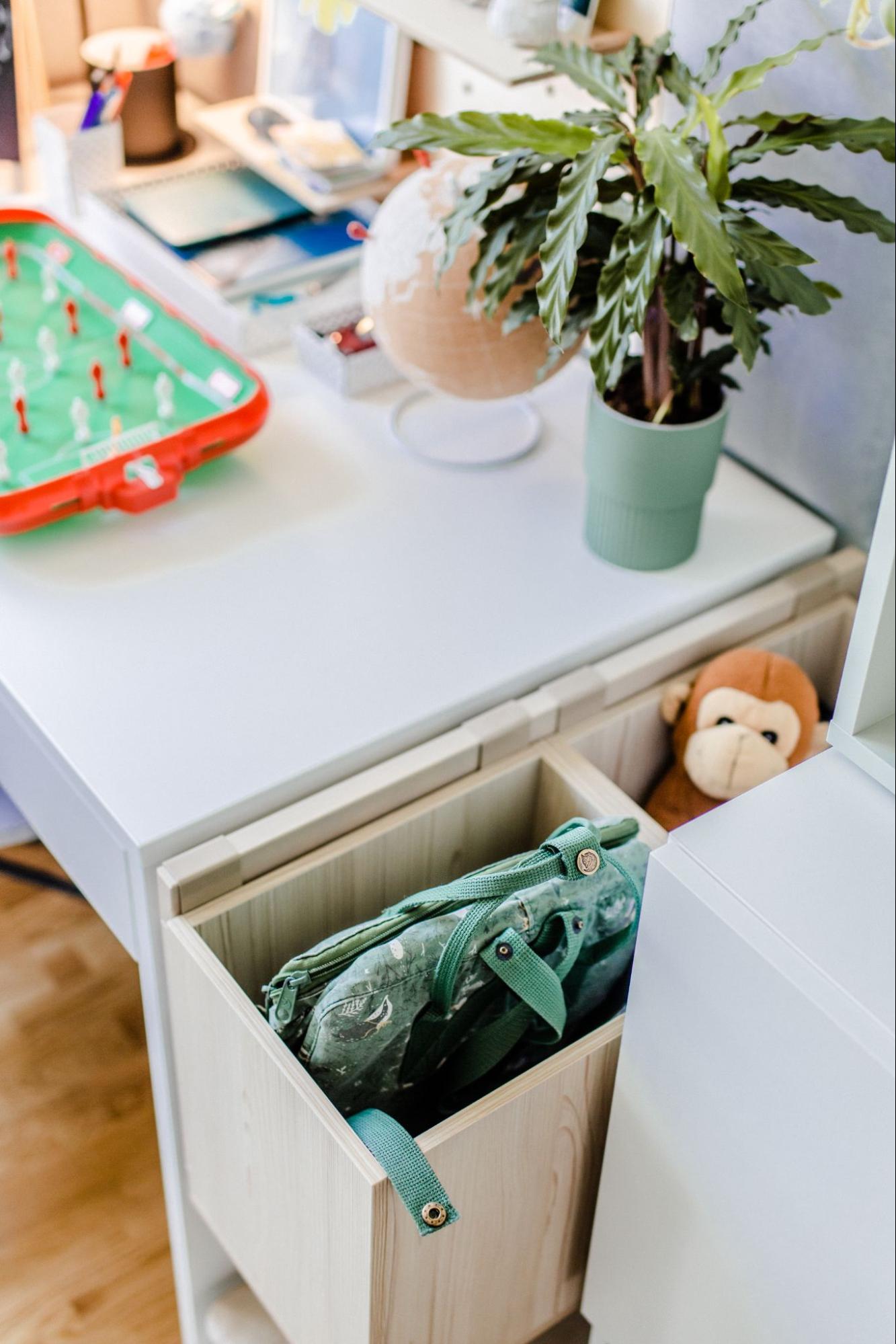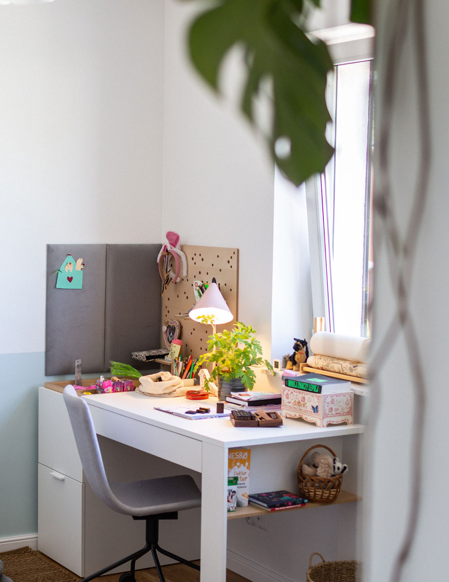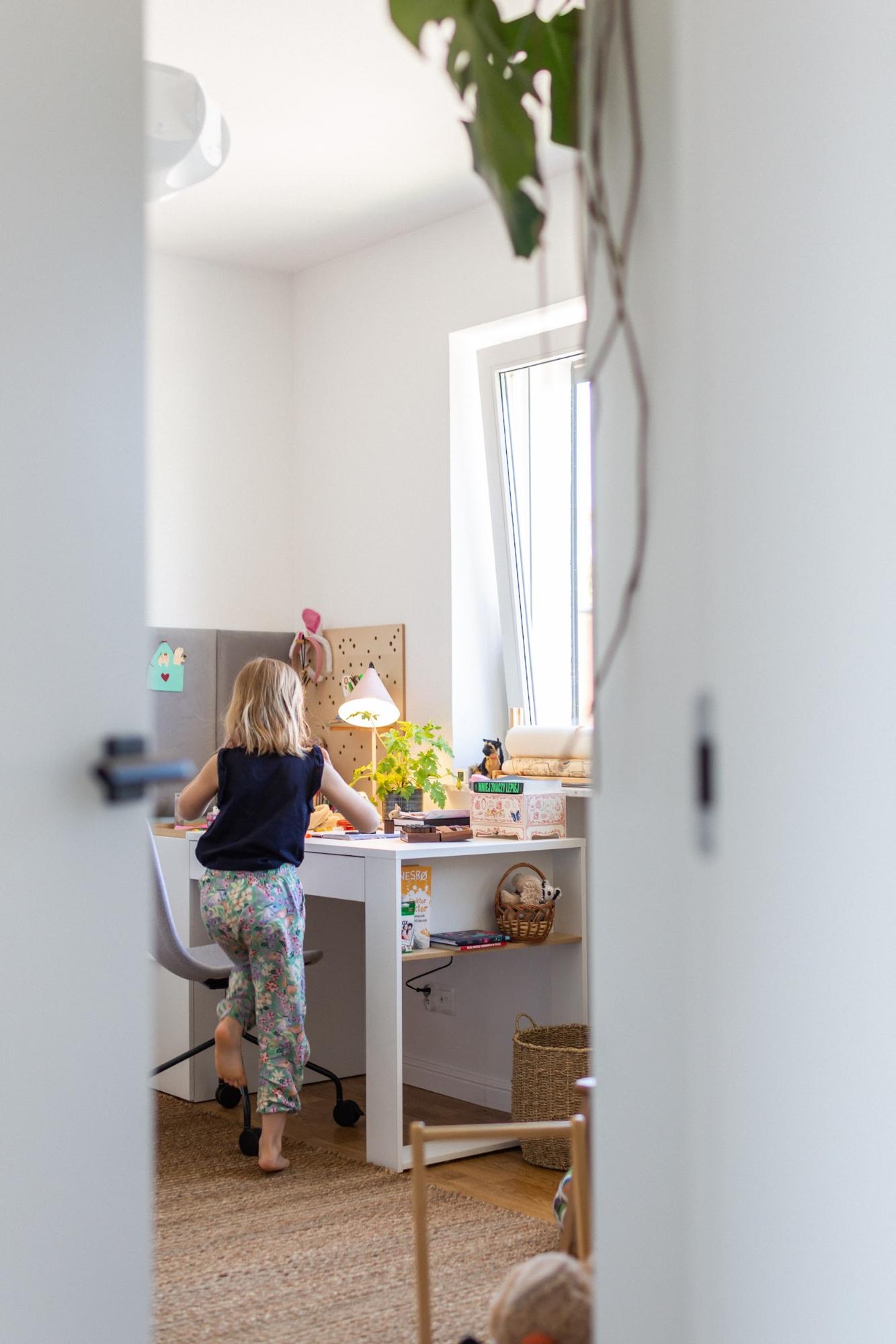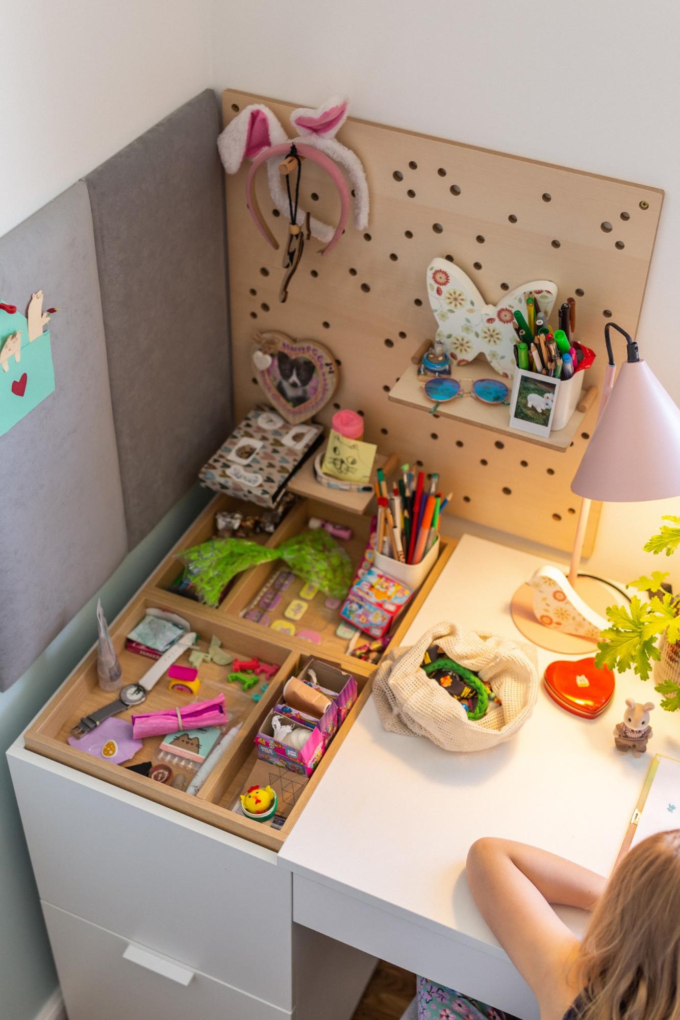 Po drugiej stronie znalazło się duże biurko z wbudowanym organizerem i pojemną skrzynką z przegrodami, w której Ada może przechować ostatnio wykonane prace. Jeśli będzie potrzebować więcej miejsca na blacie, wystarczy, że odwróci przybornik do góry nogami i w ten sposób zwiększy przestrzeń roboczą. Nad biurkiem zamontowaliśmy tablicę Slot z drewnianymi półkami i kołkami. Akcesoria pozwolą dziewczynce wyeksponować różne drobiazgi i dekoracje na ścianie.