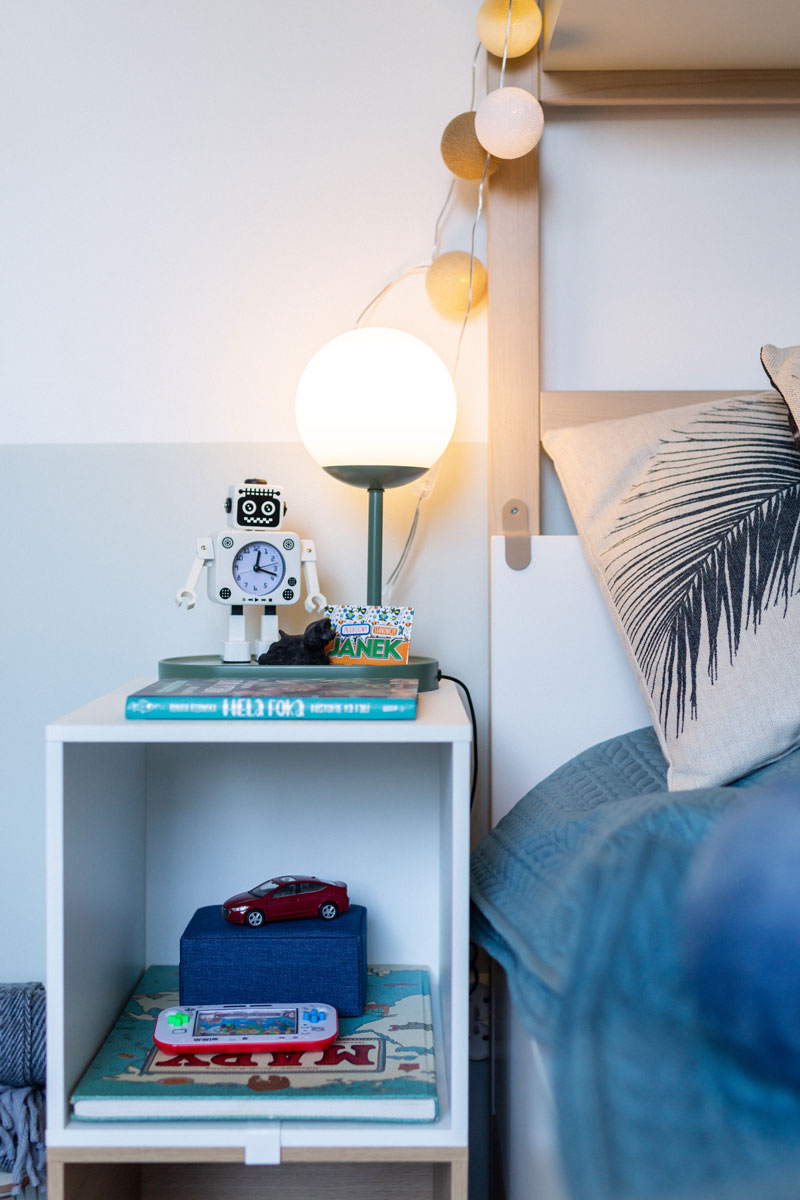Projekt pokoju dziecięcego dopełniła strefa do odpoczynku, w której znalazła się funkcjonalna kanapa z pojemnikiem na pościel i zabawki. Jasną ścianę przyozdobiła drewniana drabinka – po zamontowaniu skrzynek i pojemników zapewniła przestrzeń do przechowywania. Dzięki temu Janek może mieć zawsze pod ręką aktualnie czytane komiksy. Wieczorną lekturę umożliwią mu nastrojowe światełka oraz lampka z wbudowanym wejściem USB, które pozwala naładować telefon lub przenośną konsolę do gier.