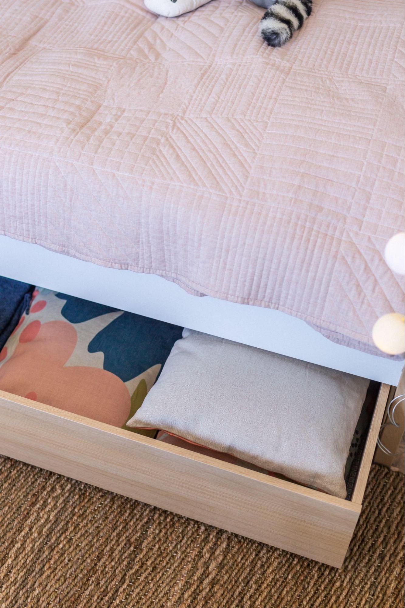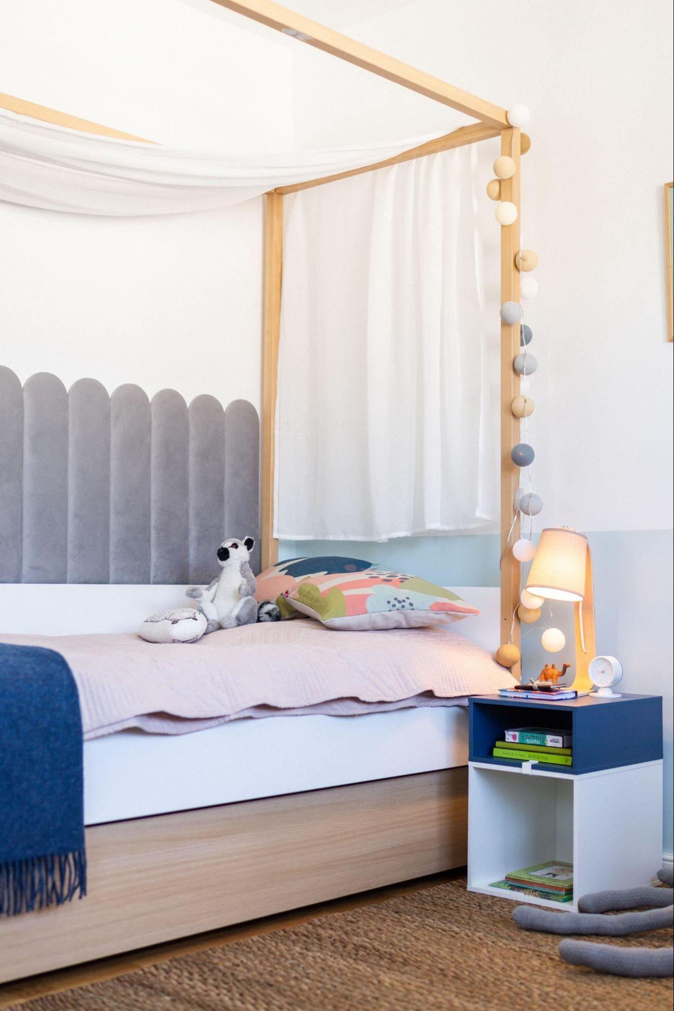 Kolejna strefa to wygodna przestrzeń do odpoczynku. Tworząc projekt pierwszego pokoju dziecięcego, ekspertka VOX wykorzystała oryginalne łóżko z baldachimem i dodatkową szufladą, która ułatwia przechowywanie pościeli. Wbudowany stelaż umożliwił zawieszenie zasłony, która pomaga wyznaczyć strefę odpoczynku i tym samym sprzyja wyciszeniu. Przytulną aranżację dopełnił sznur kolorowych lampek Happy Lights.
