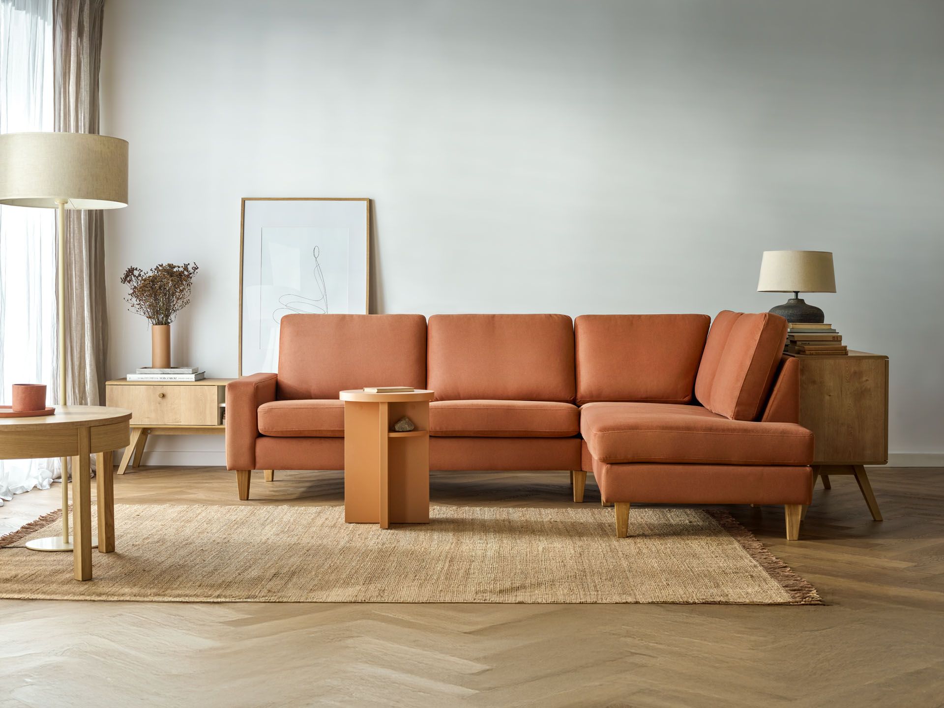 Bezpiecznym tłem dla rudej sofy, takiej jak Fika czy Arlo, będą zwiewne zasłony w odcieniu neutralnego beżu. Dobrze wydobędą kontrasty i nieco ostudzą ognisty temperament rudej tkaniny, jednocześnie dodając wnętrzu lekkości. Idealnie będą komponować się z lekkimi firanami i dekoracjami w kolorach drewna. Dopełnieniem wystroju będzie ciepła, drewniana podłoga we wzór jodełki.