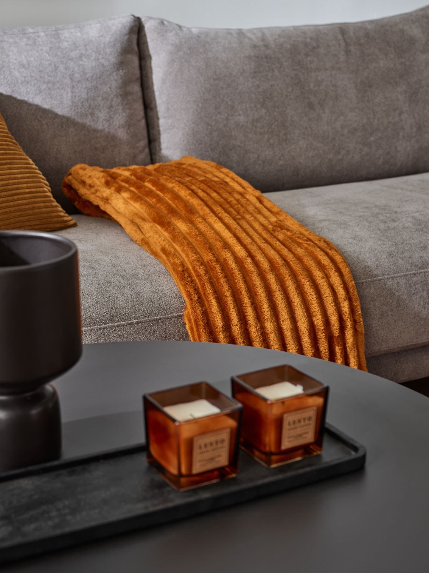 Doskonałą przeciwwagą dla rudej sofy będą zasłony w ciemnym kolorze grafitu. Dobrze jeśli swoim kolorem będą nawiązywać do innych elementów wyposażenia. Przy sofie lub narożniku warto postawić duet szarych stolików kawowych Talvo, a na podłodze rozłożyć duży szary dywan.