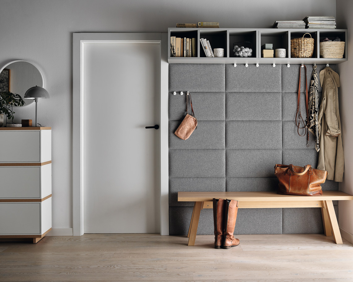 W przedpokoju z szarą podłogą warto znaleźć miejsce na wygodną ławkę. Siedzisko z dębowym dekorem zaprezentuje się szczególnie efektownie na tle paneli ściennych, wykończonych popielatą tkaniną na bazie wełny.