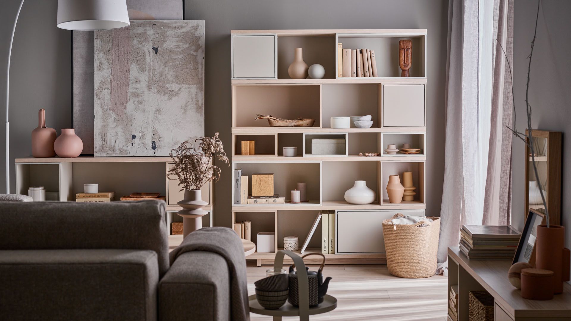 W podkreśleniu charakteru kompozycji pomogą ozdoby, umieszczone na regale w salonie tuż obok książek. Naturalne dodatki w jasnych barwach wprowadzą kojące ciepło do aranżacji i sprawią, że nowoczesny mebel stanie się bardziej przyjazny