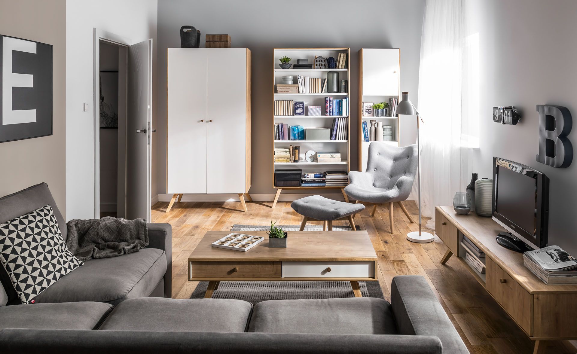 Bazą dla domowej biblioteczki może być zarówno kilka wąskich mebli, jak i jeden duży. Jeśli wybierzemy szeroki regał Balance, będziemy mogli swobodnie dostosować liczbę i układ wnęk do indywidualnych potrzeb. Zyskamy tym samym pewność, że zmieści się każda lektura. Dedykowane skrzynki i przyborniki pomogą maksymalnie wykorzystać potencjał wolnej ściany w pokoju dziennym. Oprócz ulubionych powieści i magazynów, zorganizujemy wraz z nimi również wszelkie dokumenty i akcesoria papiernicze. Do stworzenia kącika do pracy wystarczy wówczas małe biurko i fotel.