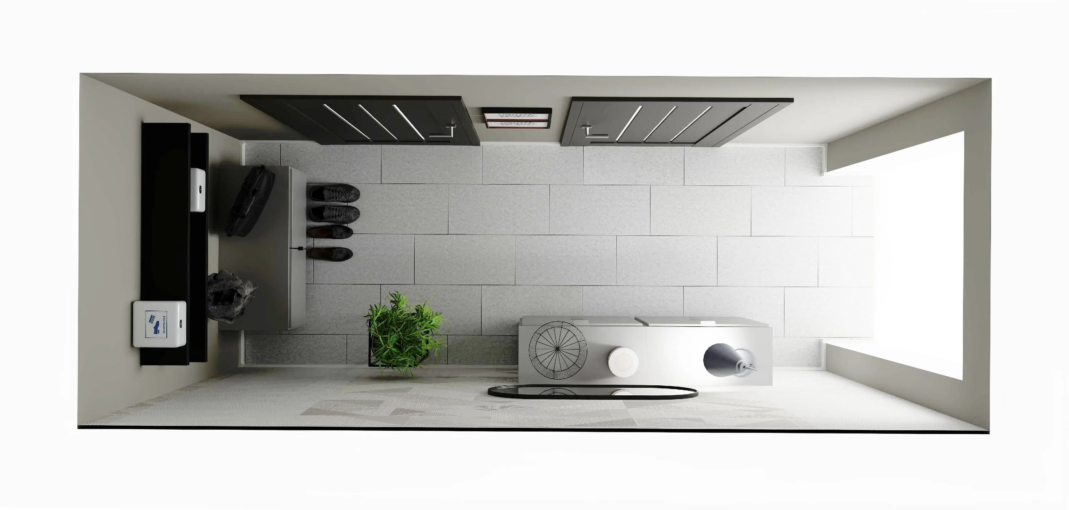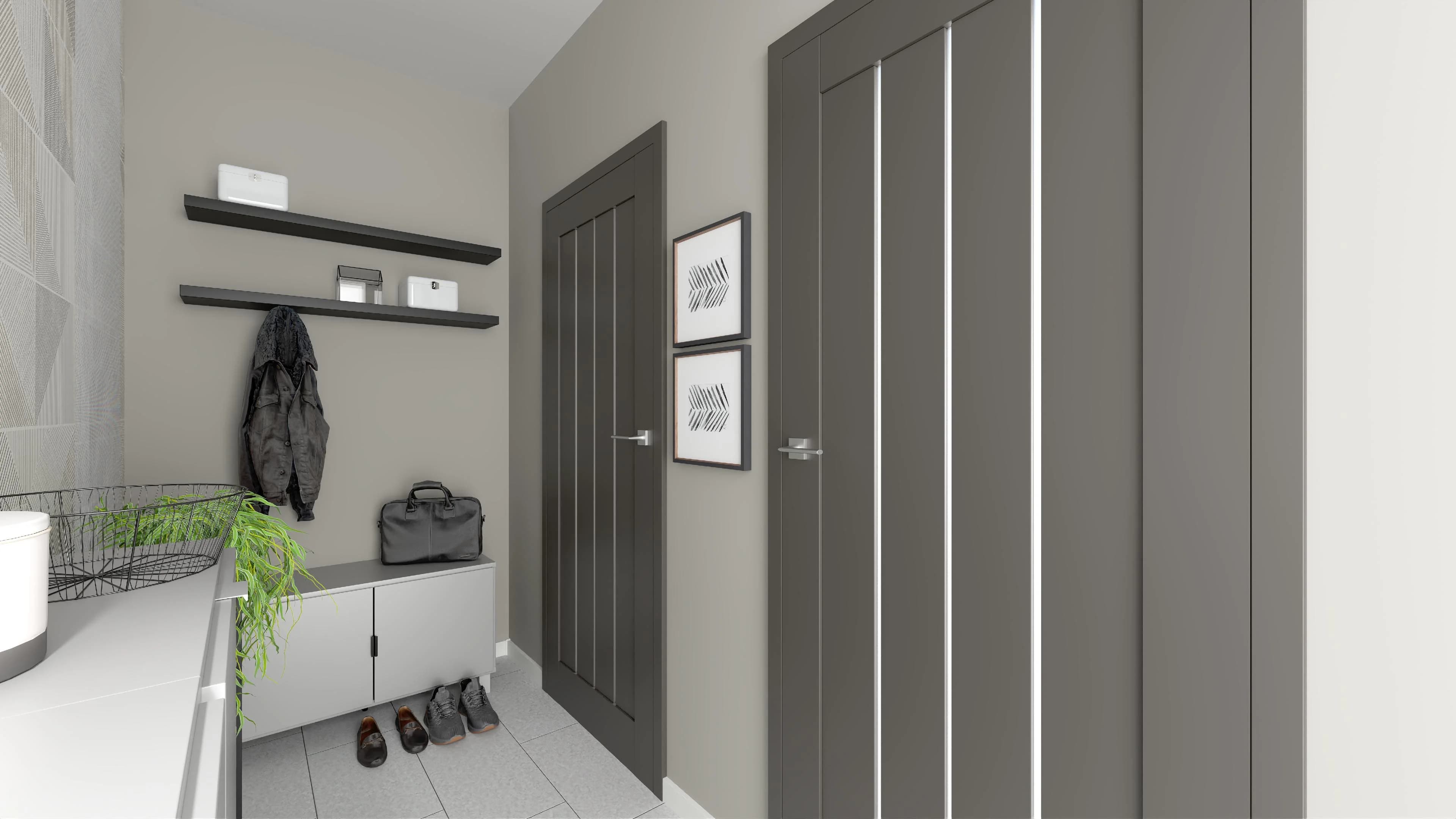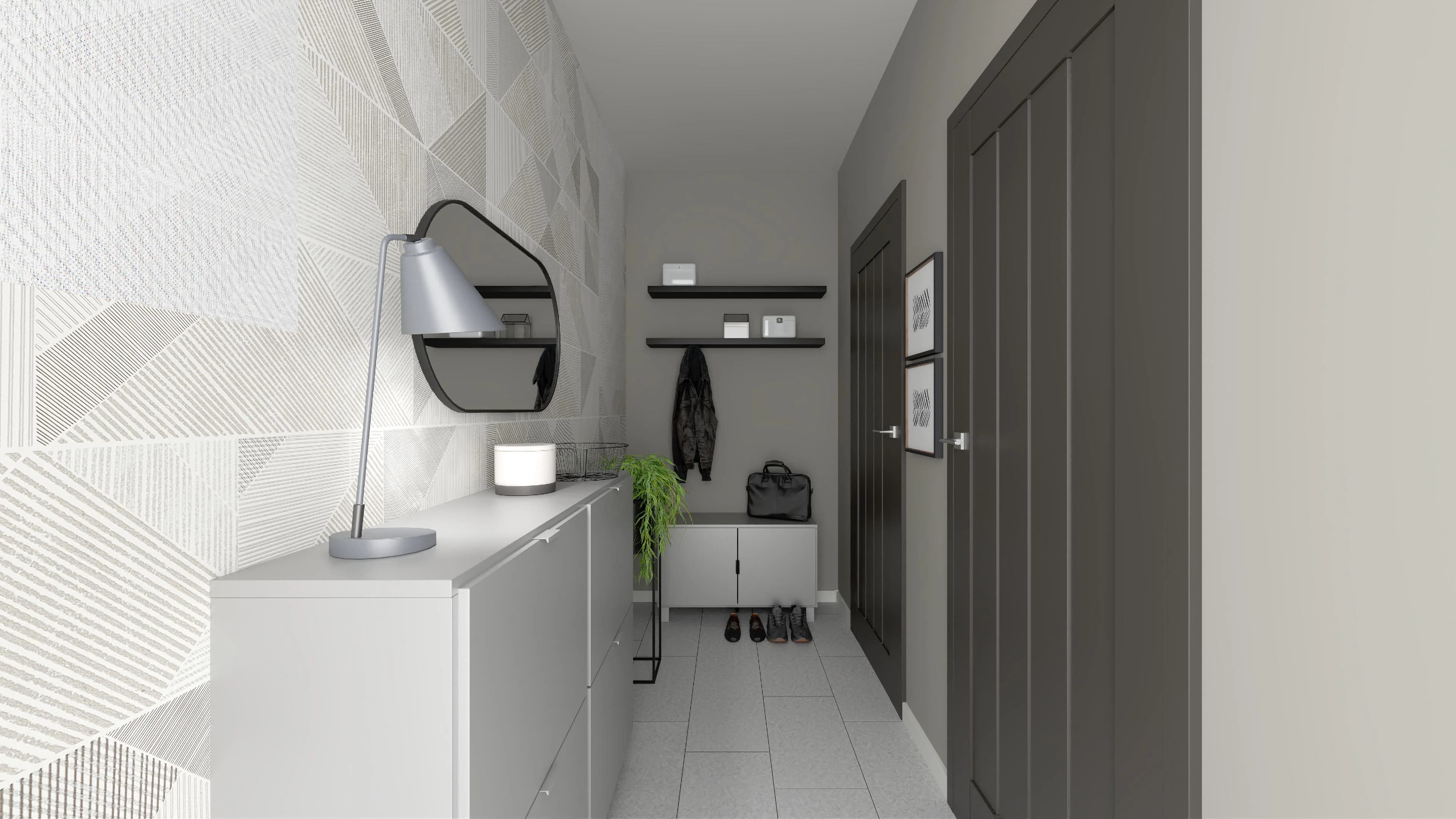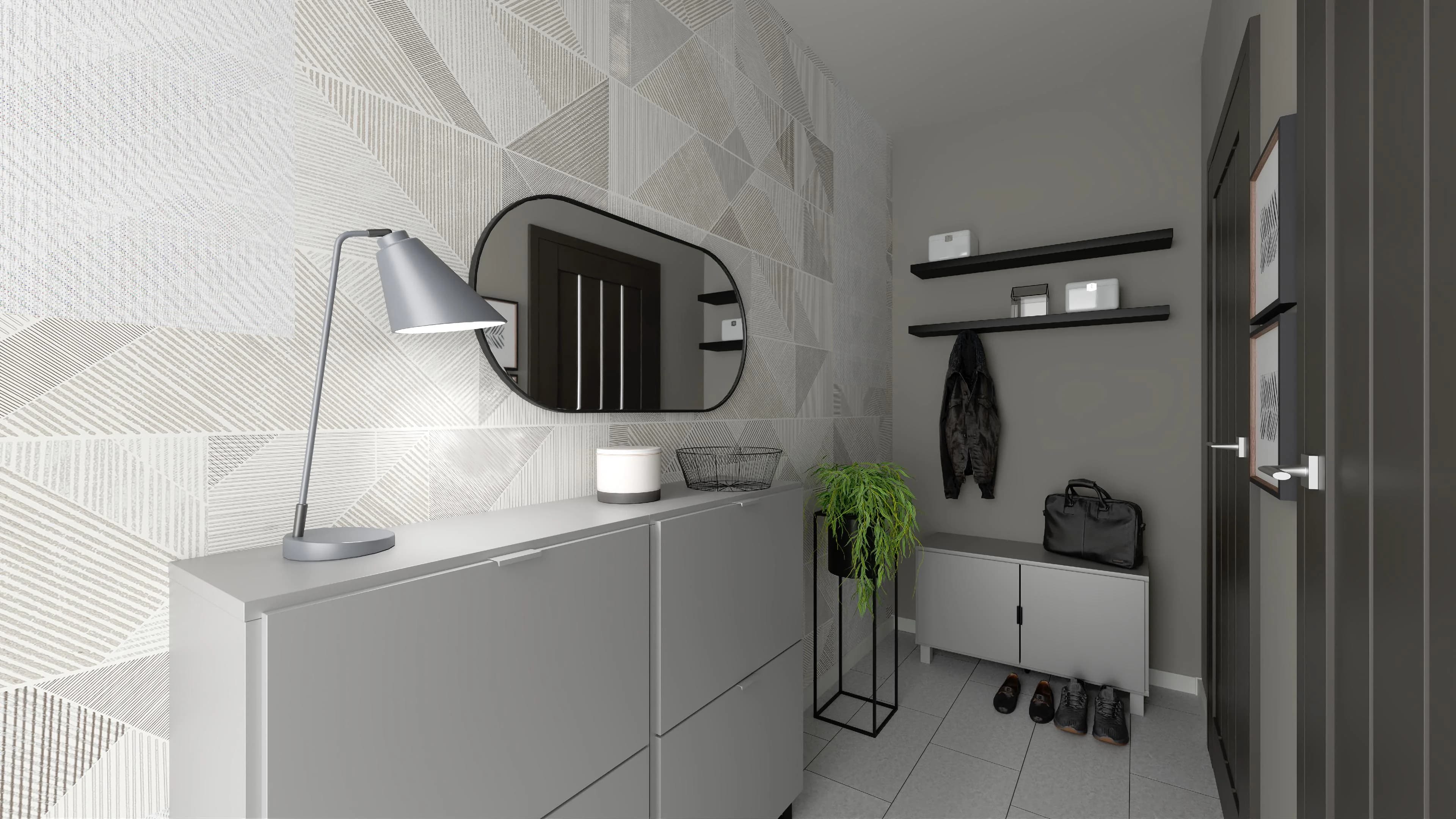 Wąski i mocno ograniczony metrażowo przedpokój jest wygodny i praktyczny. Duże lustro na ścianie oraz jasne kolory sprawiają, że przestrzeń wydaje się większa. Utrzymaniu porządku sprzyjają szafki na buty i niska komoda na drobne akcesoria, a także łatwa w czyszczeniu podłoga. Monochromatyczną paletę kolorów przełamuje zieleń żywej rośliny.