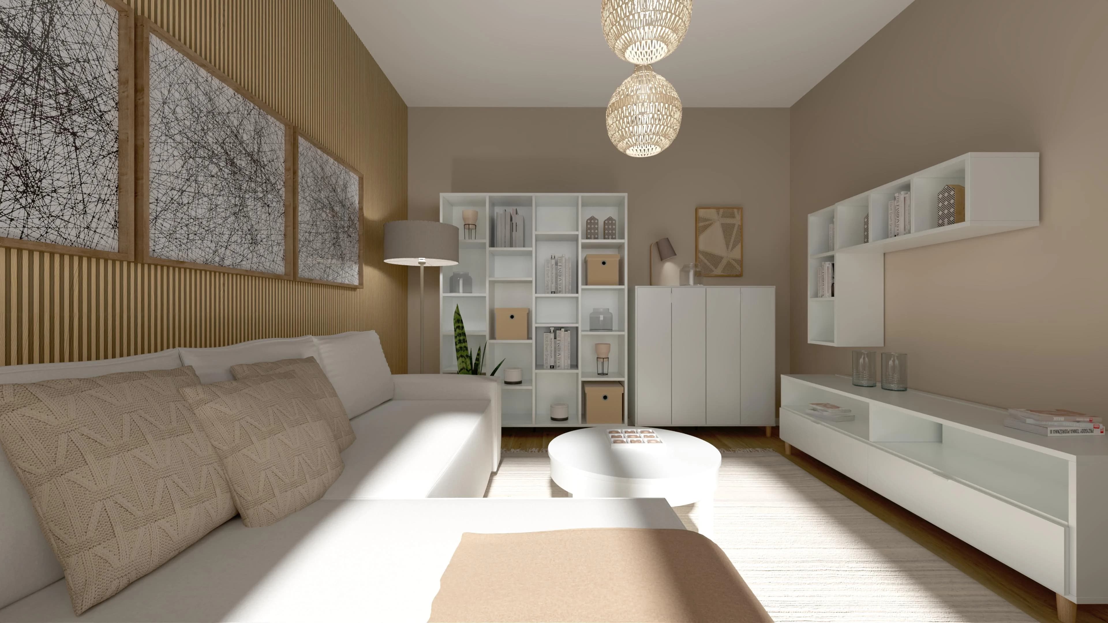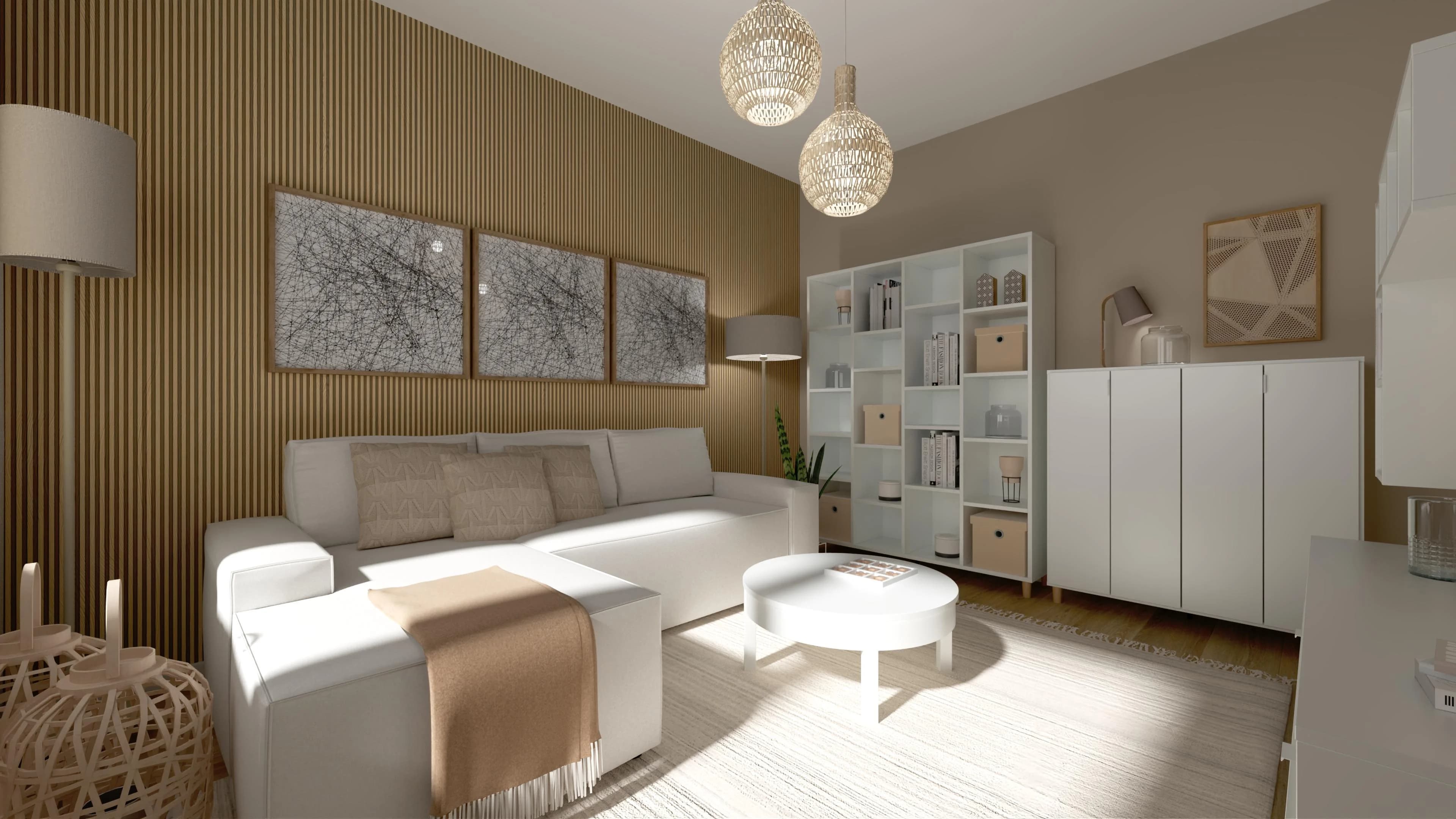 Mały salon urządzony jest w beżowej tonacji, która nadaje mu przytulny charakter. Ściana za narożnikiem wykończona lamelami w kolorze drewna wprowadza naturalny akcent i optycznie dodaje głębi. Jasny narożnik z miękkimi poduchami tworzy wygodną strefę relaksu, a obrazy na ścianach podkreślają domowy klimat. Całość dopełniają przytulne lampy i lampiony.