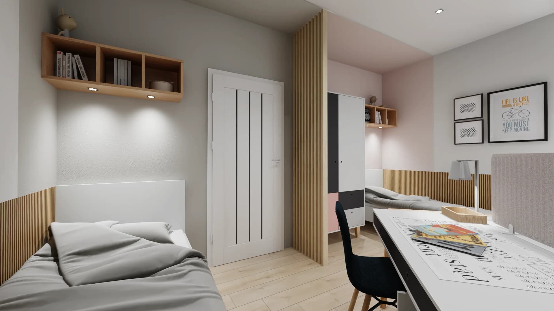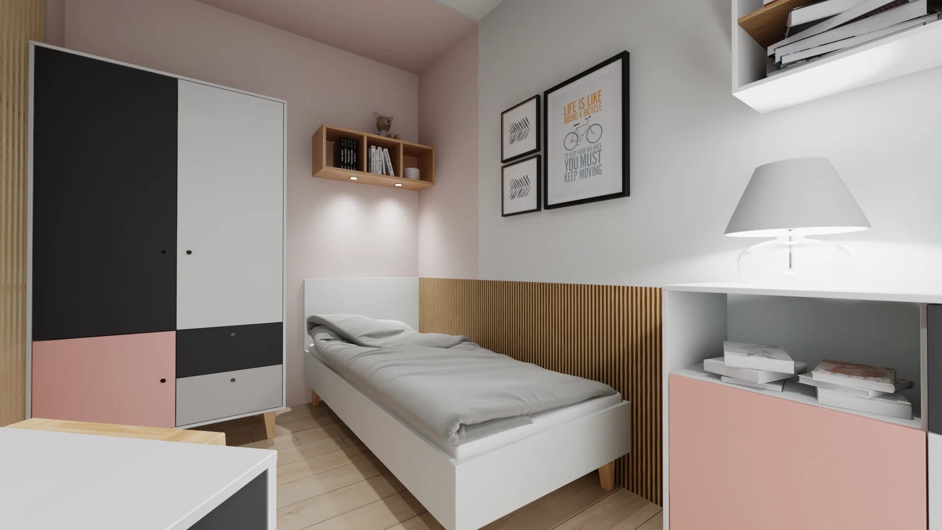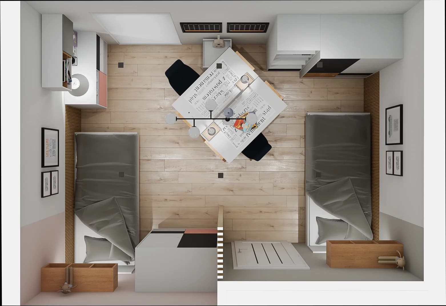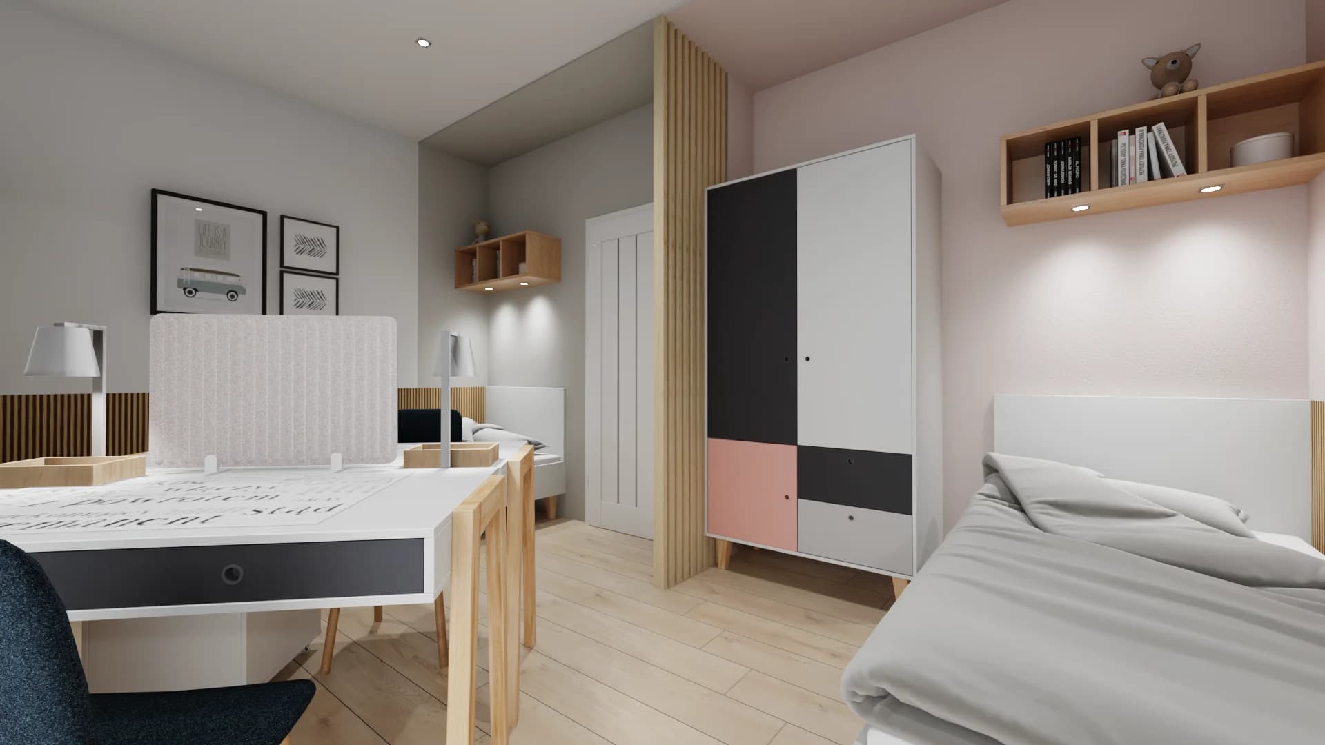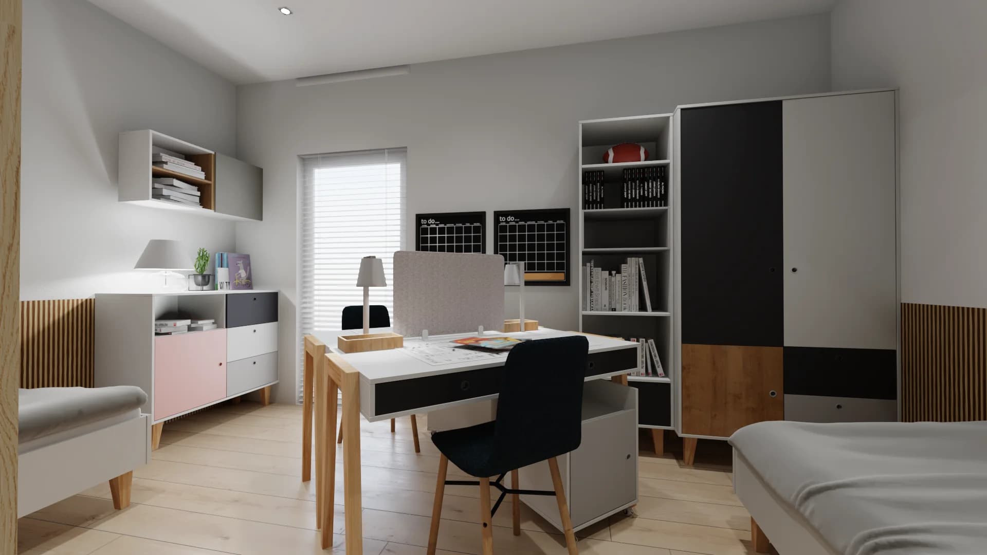 W nowoczesnym pokoju dla dwojga nastolatków panuje pozytywna energia. Każde z dzieci ma swój własny kąt, wydzielony kolorem ściany i efektownym przepierzeniem z lameli. Fronty mebli można wymieniać z biegiem lat, aby odświeżyć wystrój. Kreatywnej pracy sprzyjają dwa bliźniacze biurka, których blaty dla zachowania większej prywatności oddzielone są parawanem.