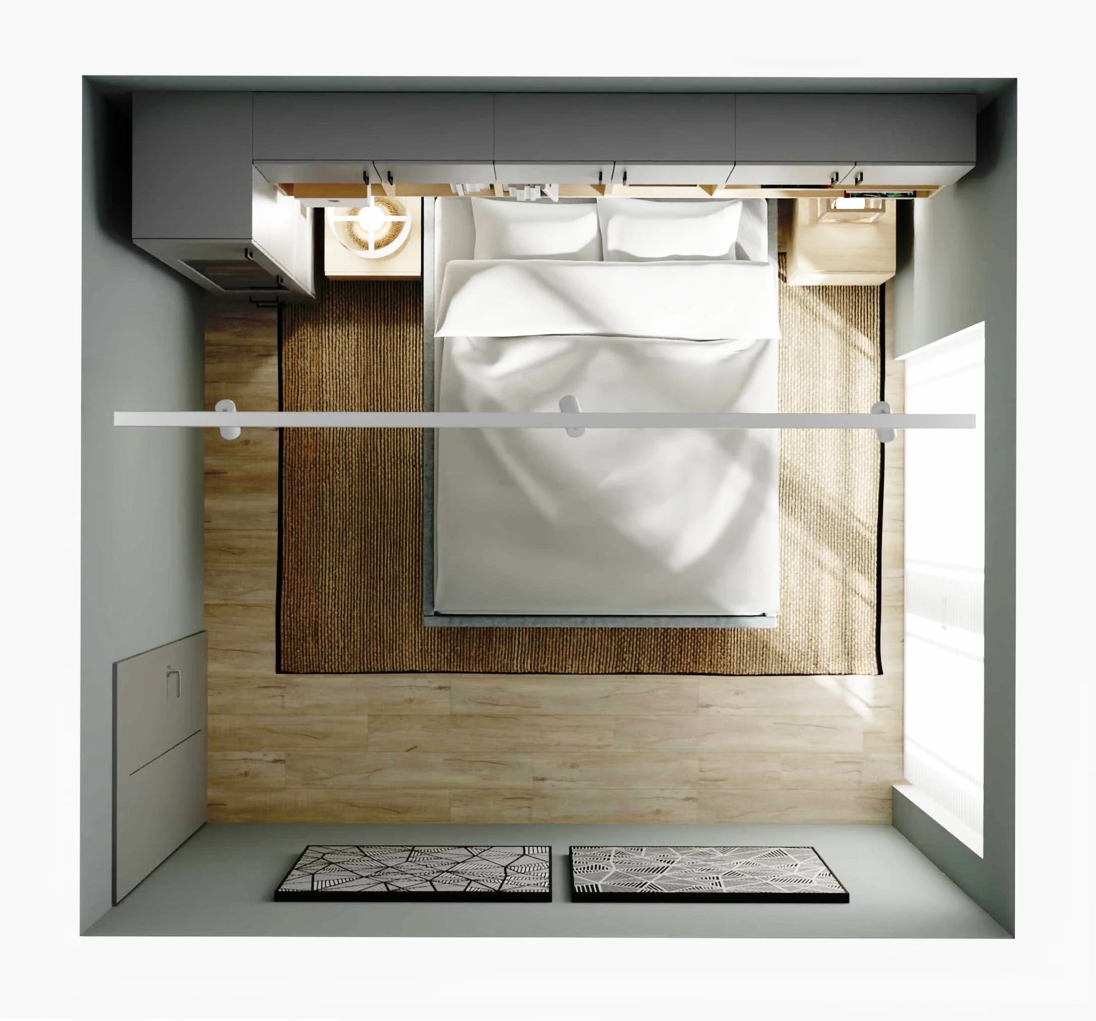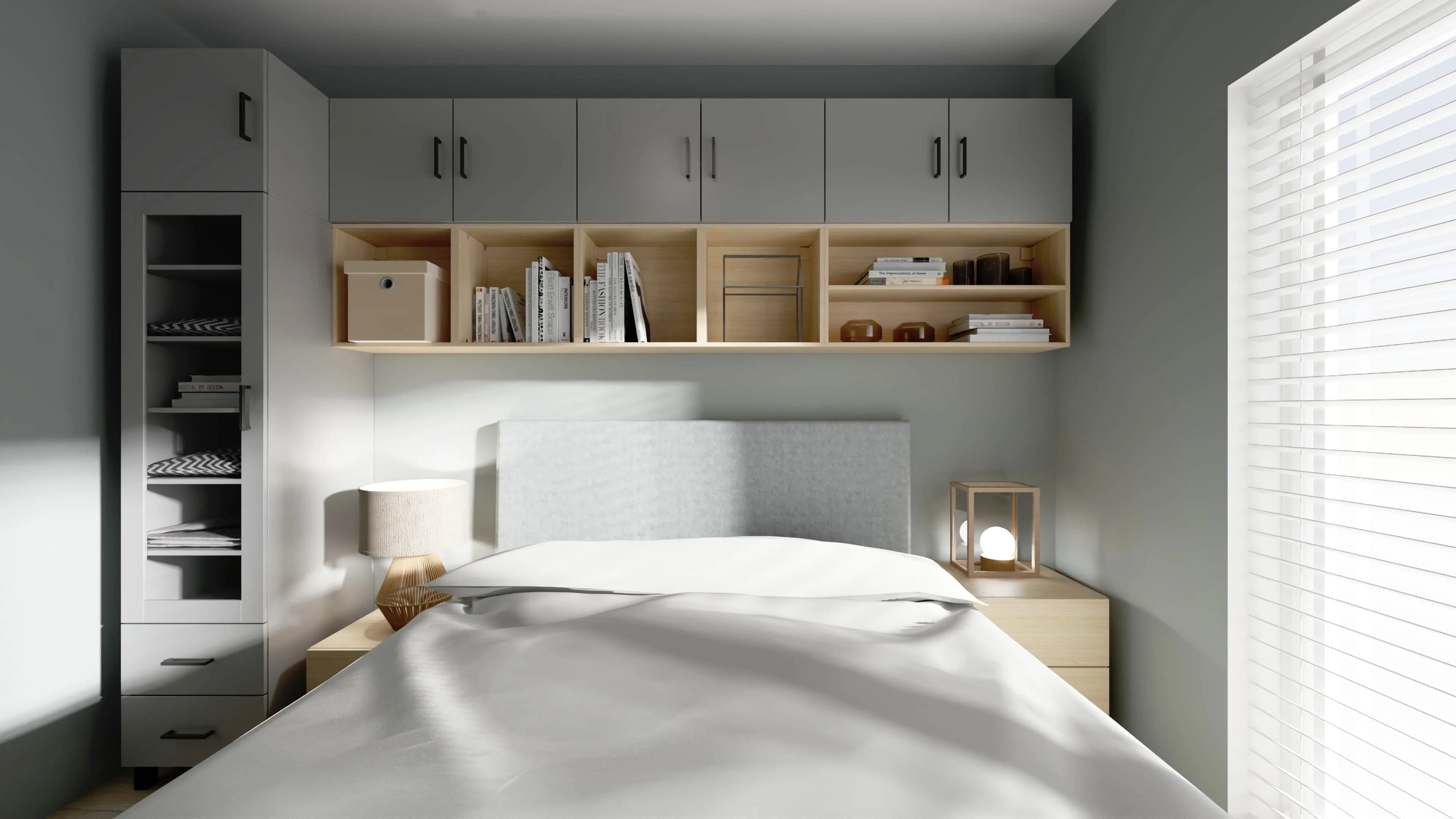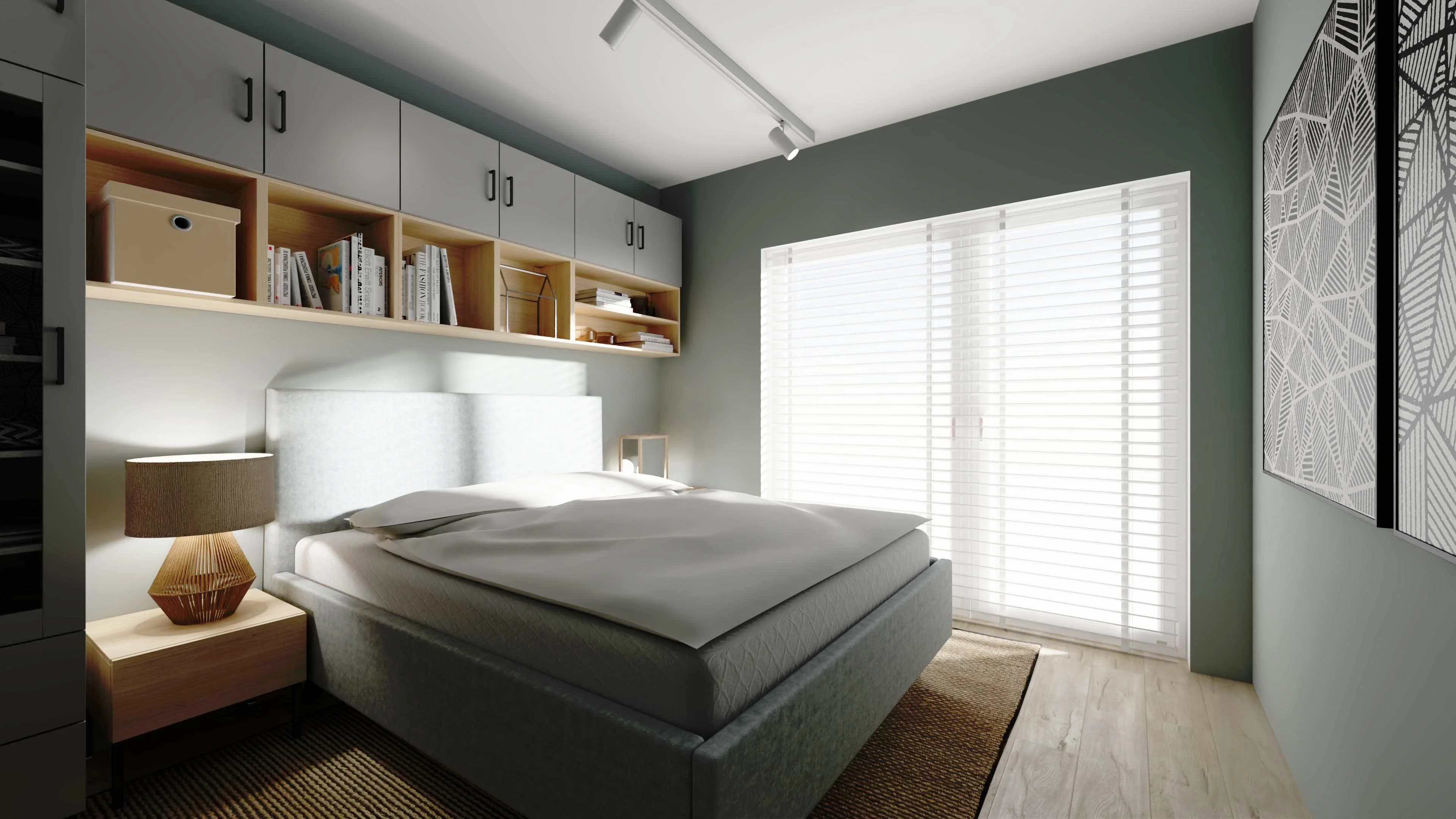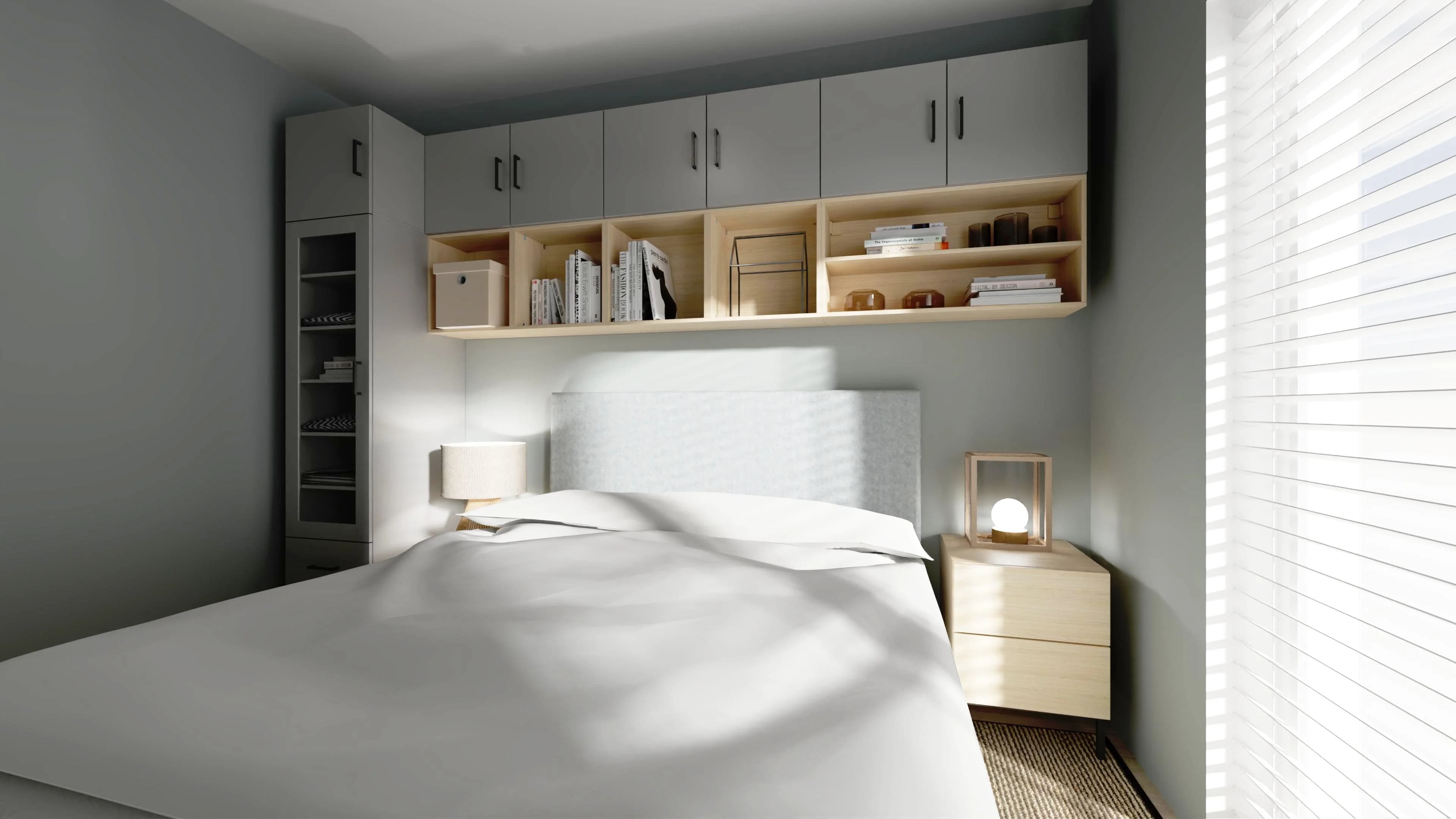 Jasna, szara sypialnia z dużym łóżkiem to idealne miejsce odpoczynku dla dwojga. We wnętrzu panuje spokojna, harmonijna atmosfera, którą budują ponadczasowe kolory i dobrze zaplanowane miejsca do przechowywania w postaci zabudowy wokół łóżka. Wystrój ciekawie przełamuje naturalny dywan, który koresponduje ze stylistyką oświetlenia.