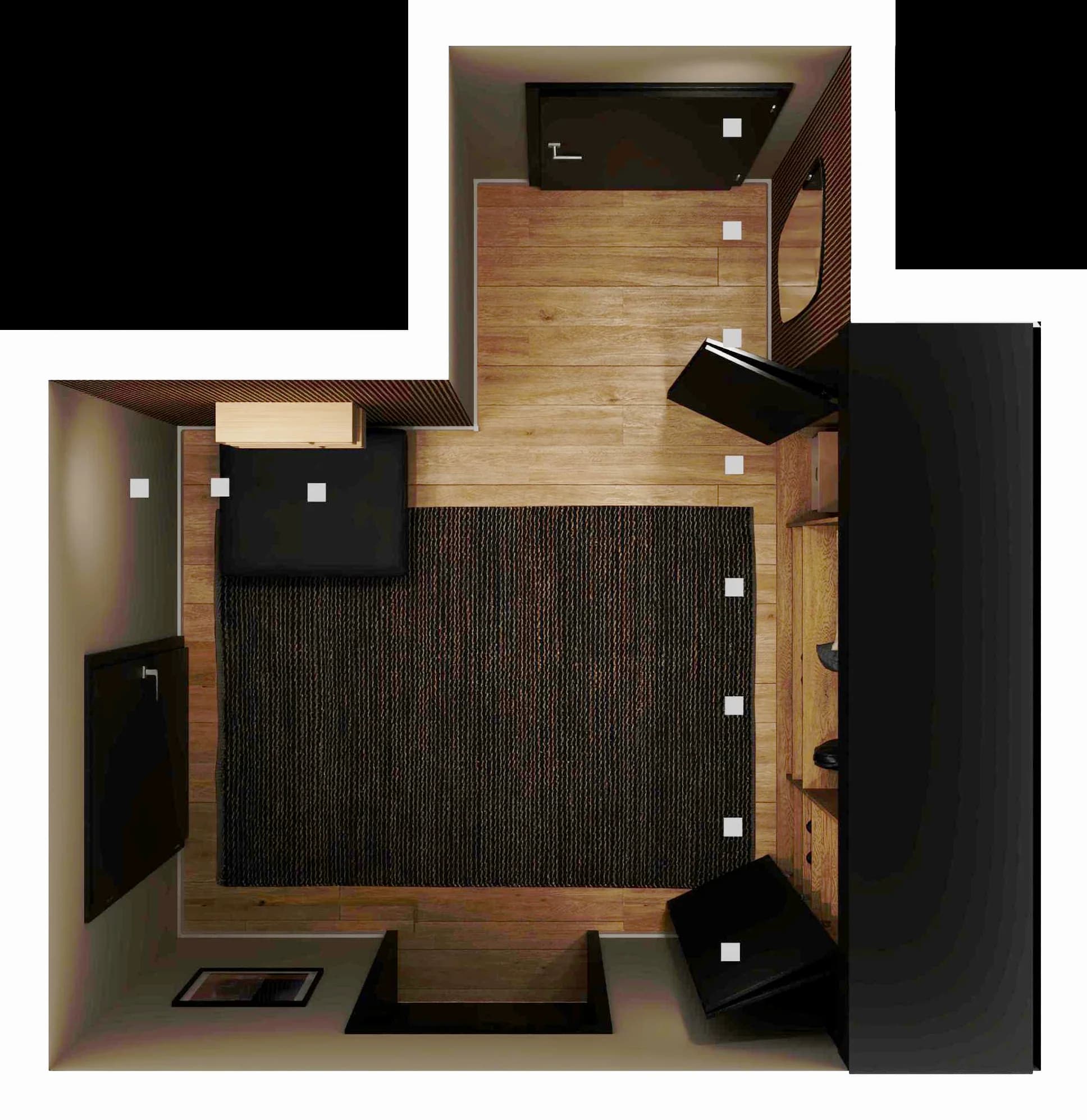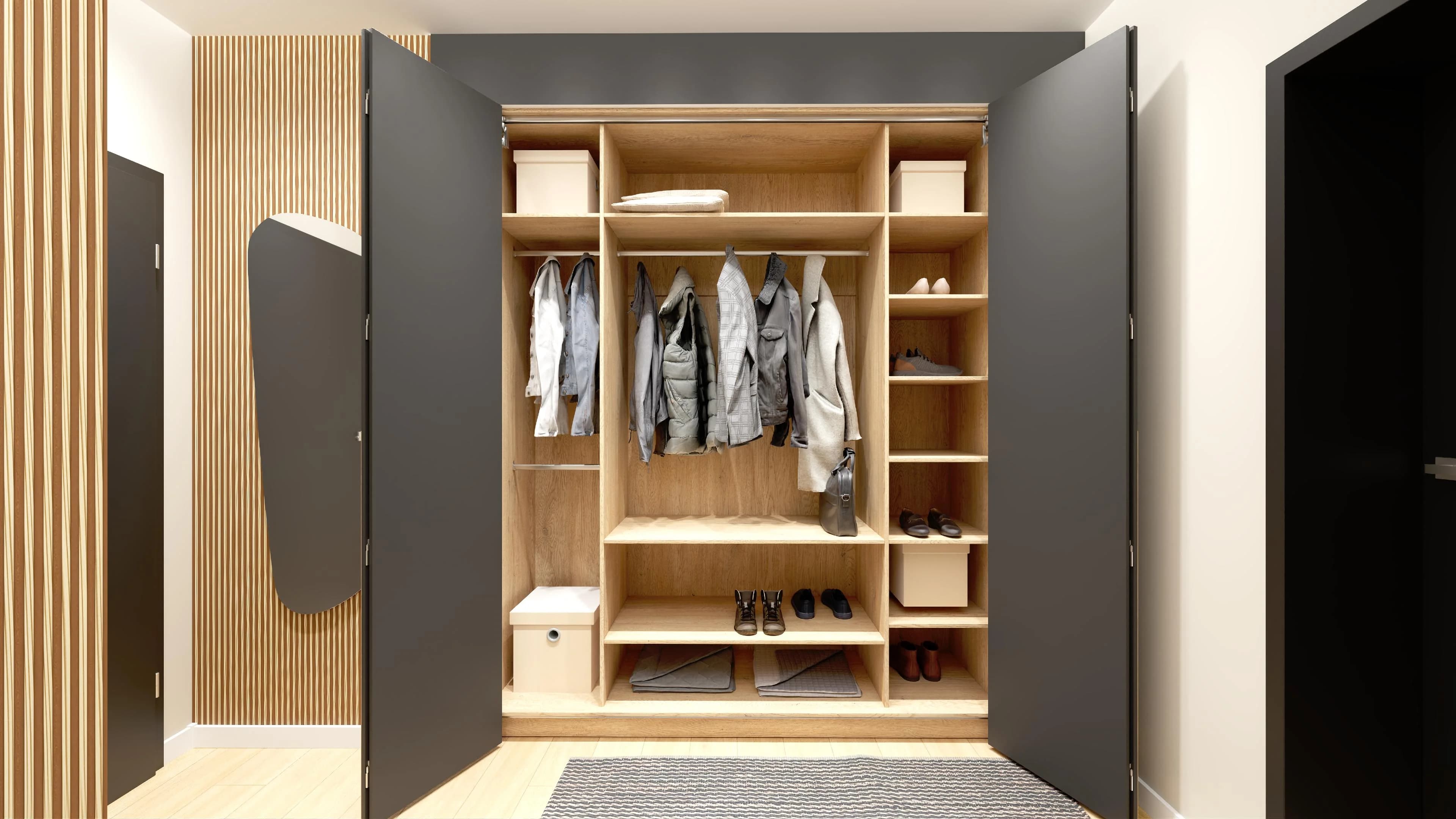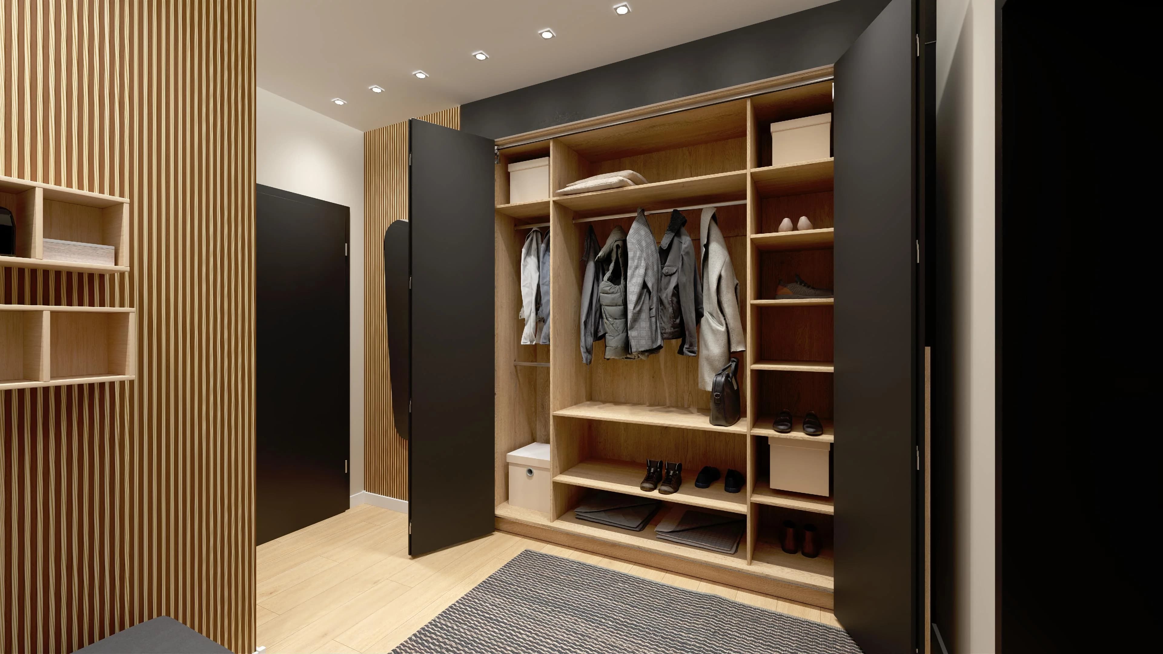 Elegancki przedpokój z czarną 4-drzwiową szafą