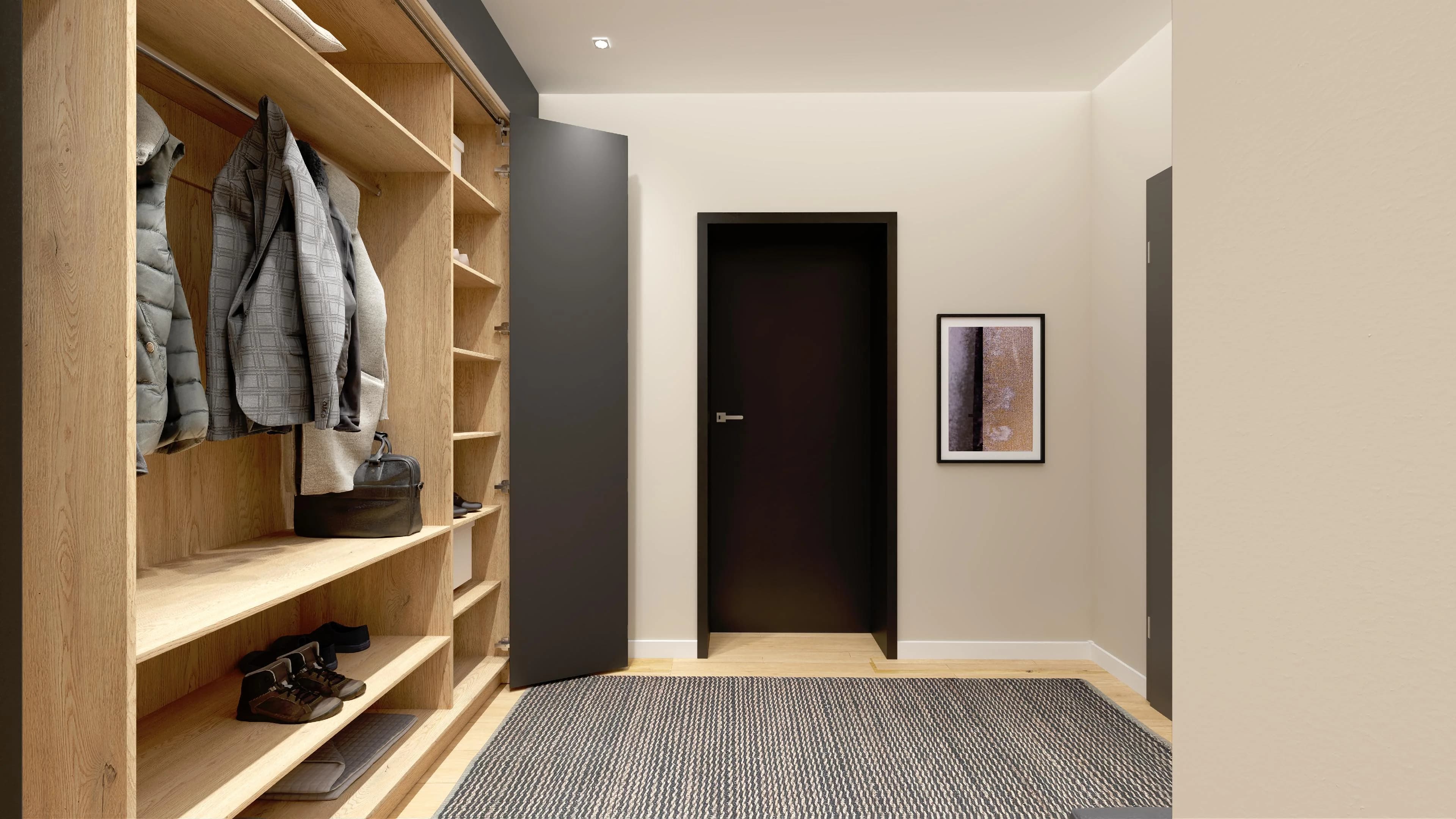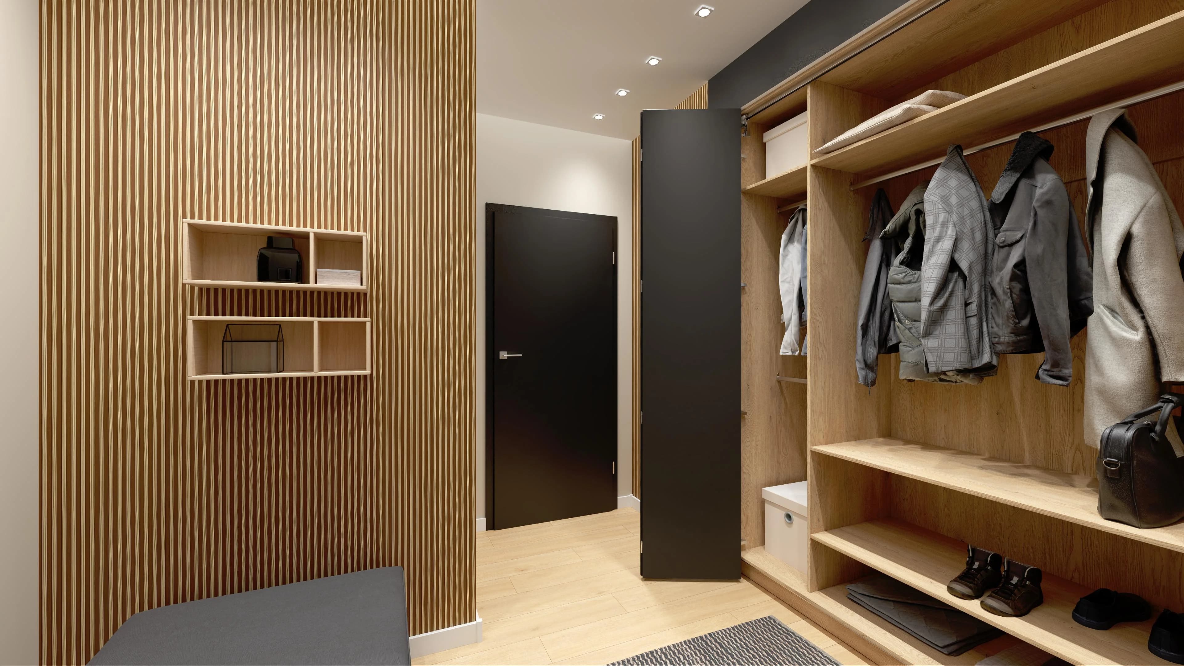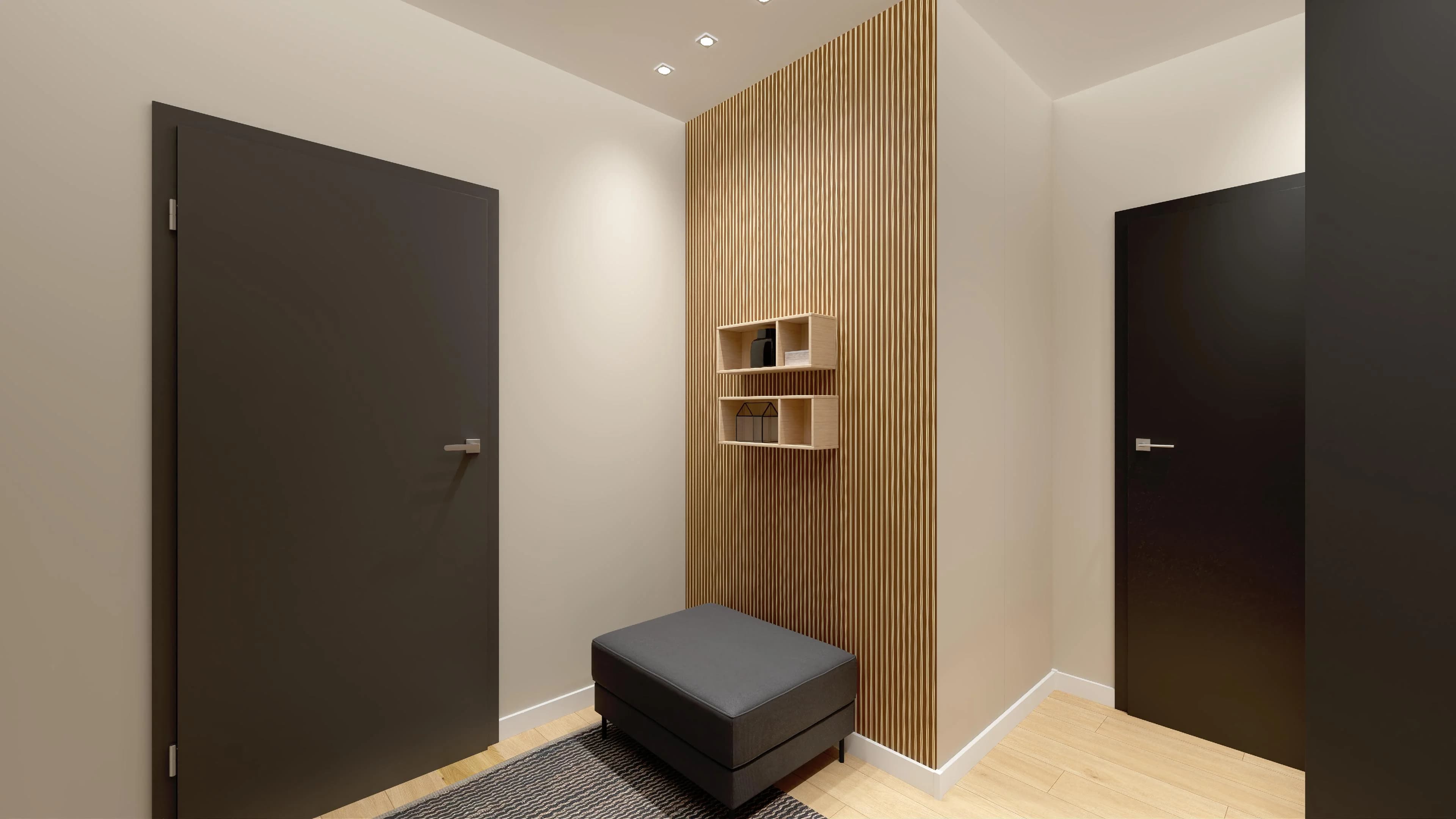 Funkcjonalny przedpokój stanowi wizytówkę domu. Wnęka o szerokości 240 cm mieści pojemną szafę z przesuwno-składanymi drzwiami, która pozwala utrzymać porządek i zorganizować wszystkie drobiazgi. Miękki puf zapewnia wygodne miejsce do wkładania butów. Przytulność wnętrza podkreślają ciepłe odcienie drewna, beżowe ściany i smukłe lamele.