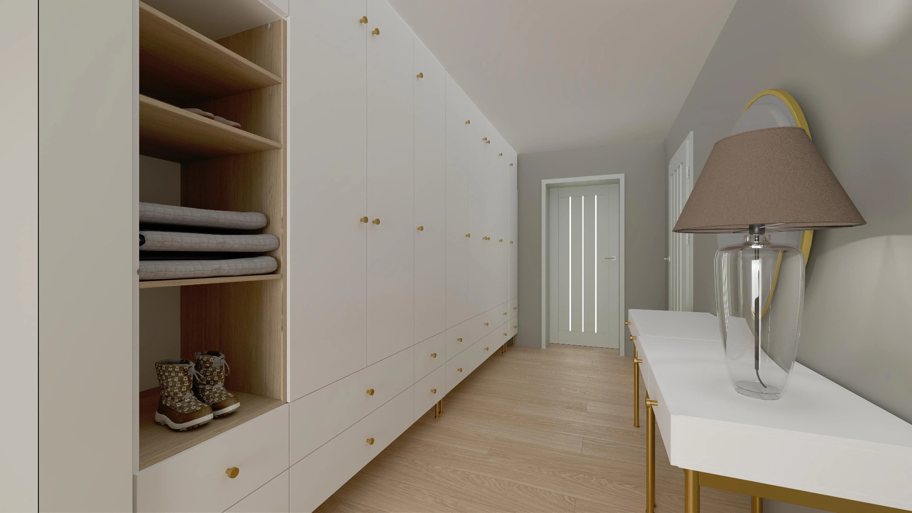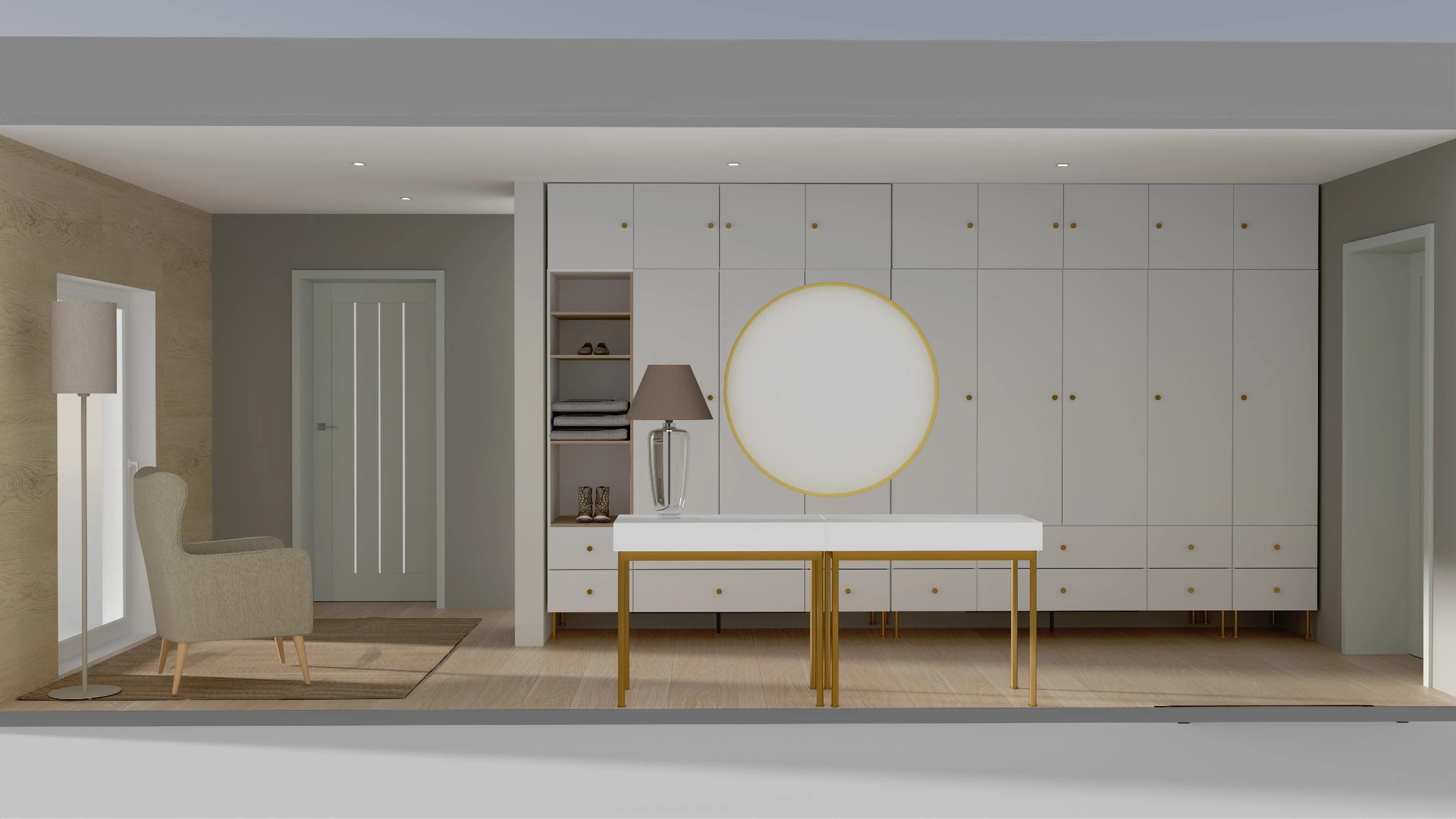 Dzięki estetycznej zabudowie ściany długi korytarz stał się bardzo praktyczny. Pakowne szafy zapewniają wiele przestrzeni do przechowywania odzieży, a w otwartych wnękach można poukładać przedmioty, które chce się mieć pod ręką. Przy eleganckiej toaletce znajdzie się miejsce na portfel i klucze. Luksusowy akcent stanowią nóżki i uchwyty mebli w złotym kolorze.
