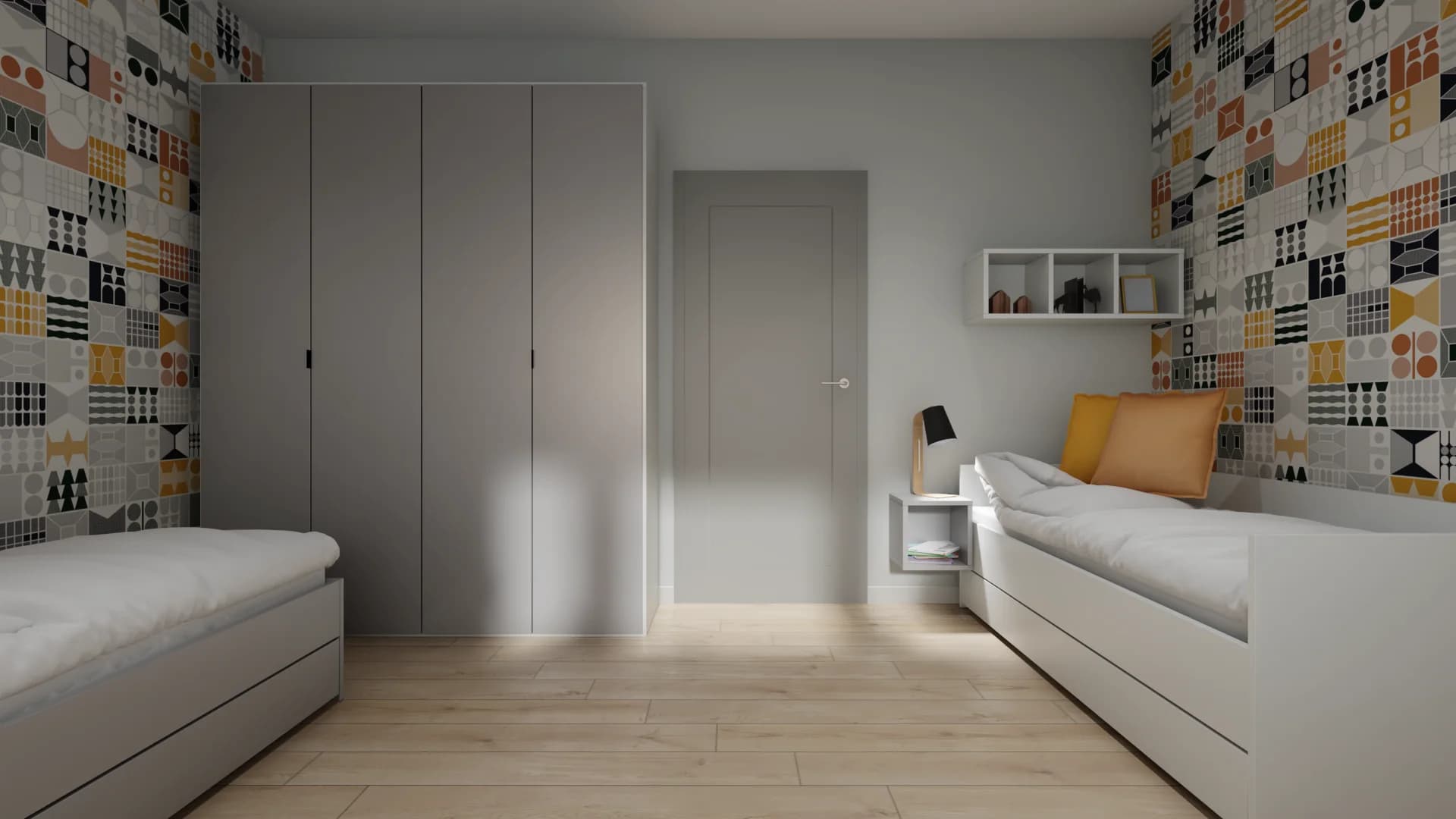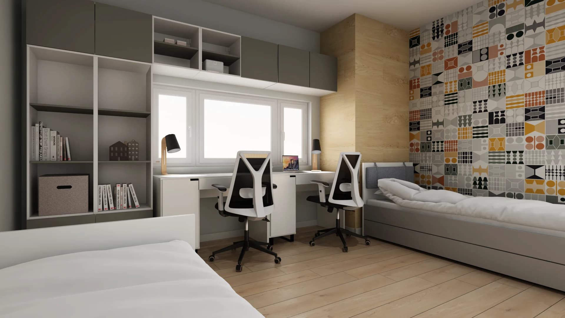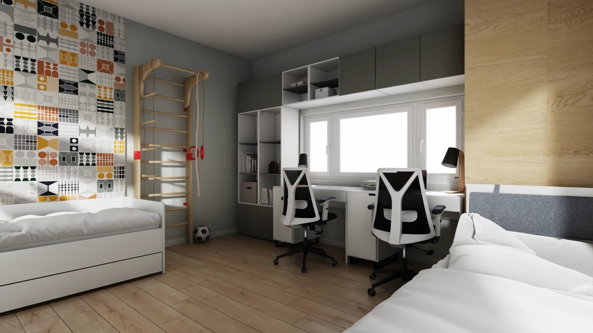 Kwadratowy pokój dla rodzeństwa jest wygodny i praktyczny. Przy biurkach znajdzie się wiele przestrzeni do nauki. Pojemne szafki pomieszczą podręczniki i zabawki. Na dwóch niezależnych łóżkach można wygodnie wypocząć, a nadmiar energii spożytkować, używając sportowej drabinki. Charakteru szarej aranżacji nadają panele z geometrycznym wzorem.