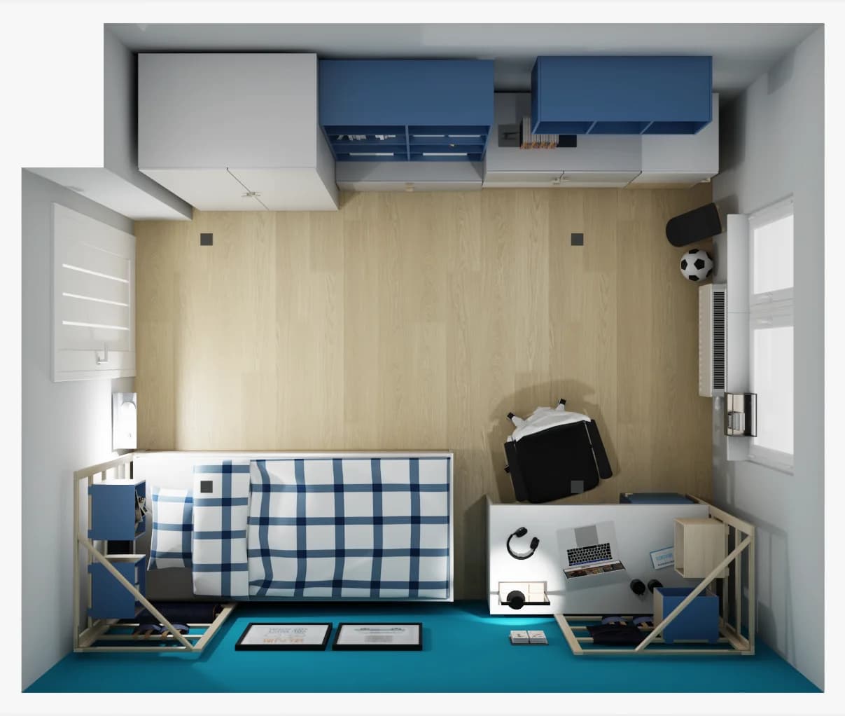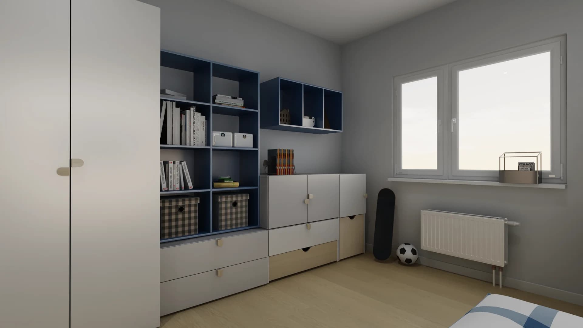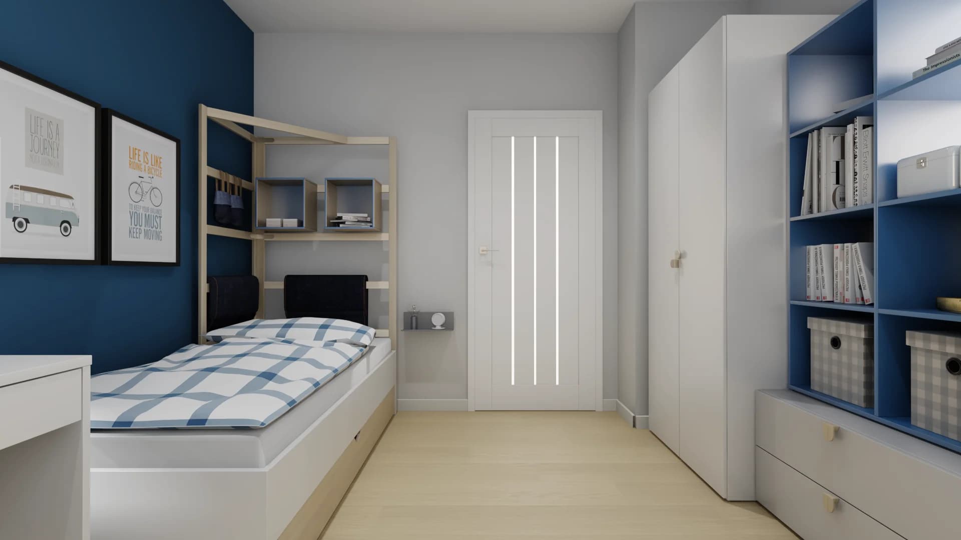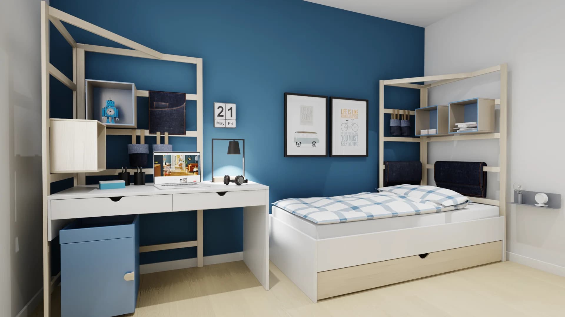 Granatowo-biały pokój nastolatka to fuzja nowoczesnego stylu i praktycznych rozwiązań. Porządek pozwalają utrzymać uniwersalne modułowe meble, które z czasem można rozbudować. Aby przestrzeń zyskała na funkcjonalności, zarówno biurko, jak i łóżko posiadają drewniane drabinki, wzbogacone o skrzynki i organizery na książki i osobiste drobiazgi.
