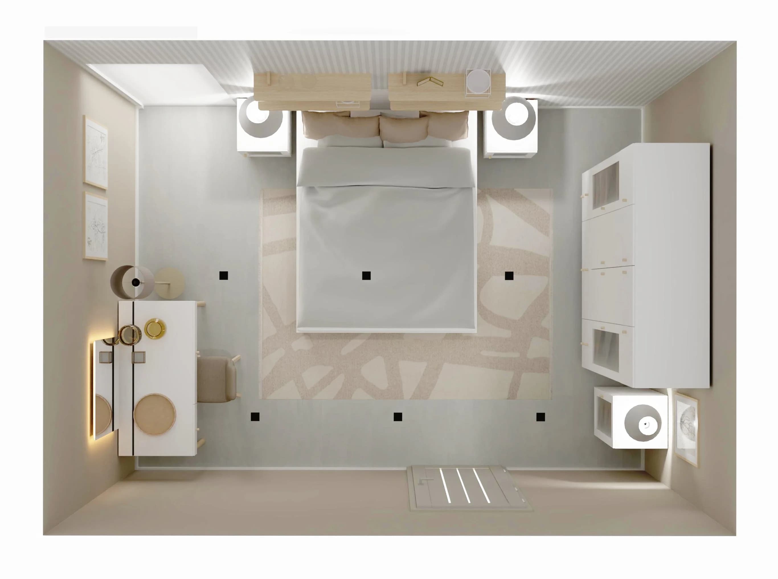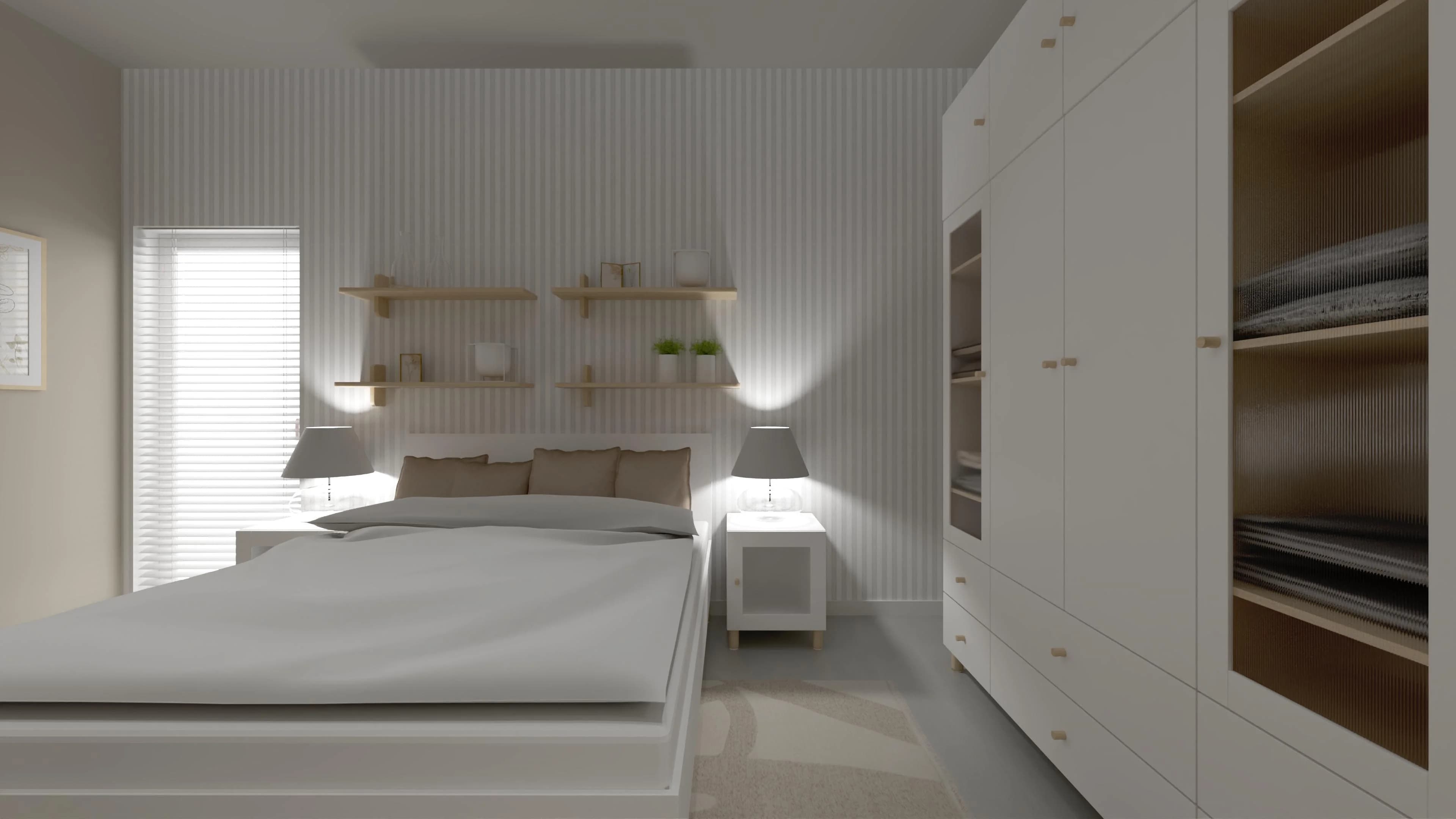 To wnętrze koi zmysły i sprzyja wyciszeniu. Duże łóżko z prostą ramą otoczone jest minimalistycznymi meblami: pojemną szafą, stolikami nocnymi i toaletką, która może pełnić też rolę biurka. Ścienne półki dodają przestrzeni lekkości, a stonowane oświetlenie dba o przyjemny nastrój. Wrażenie przestronności potęgują jasne kolory ścian i dodatków.