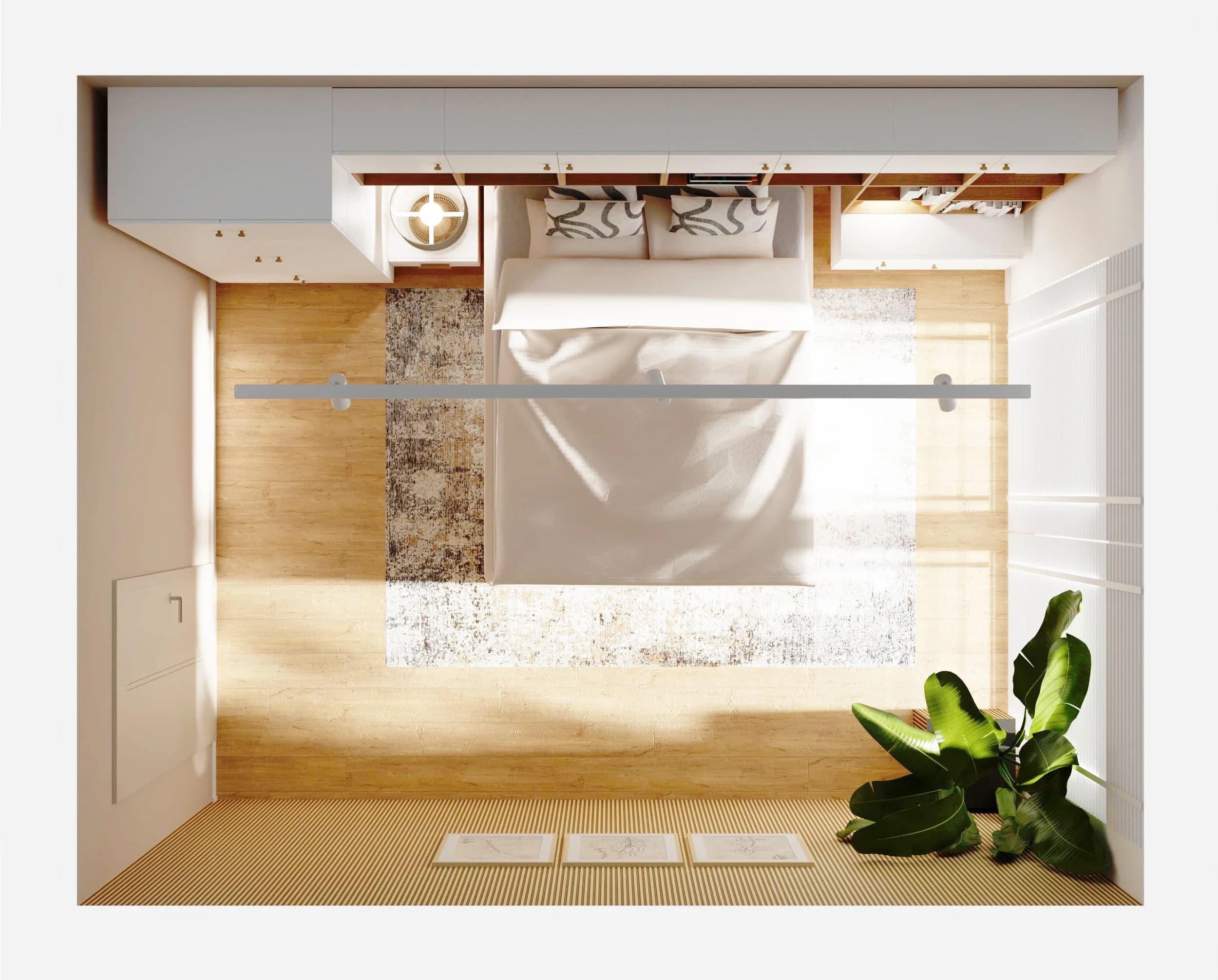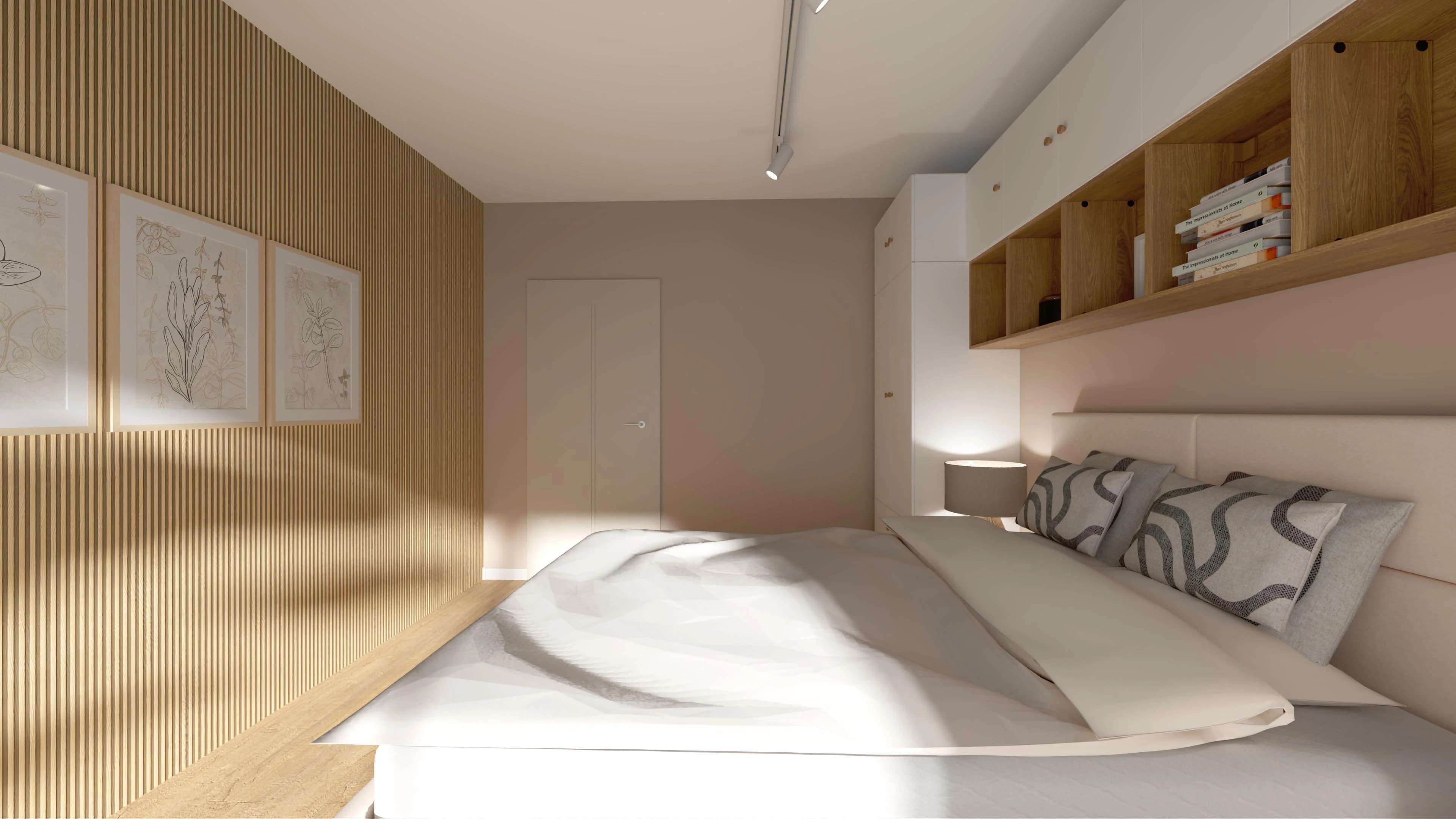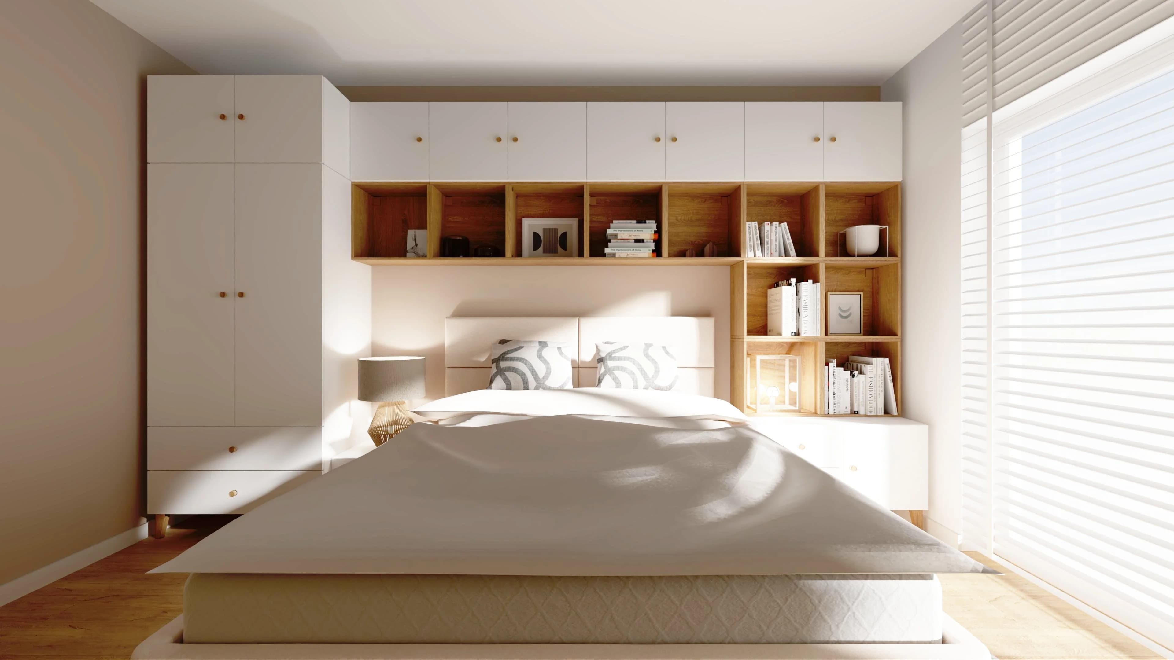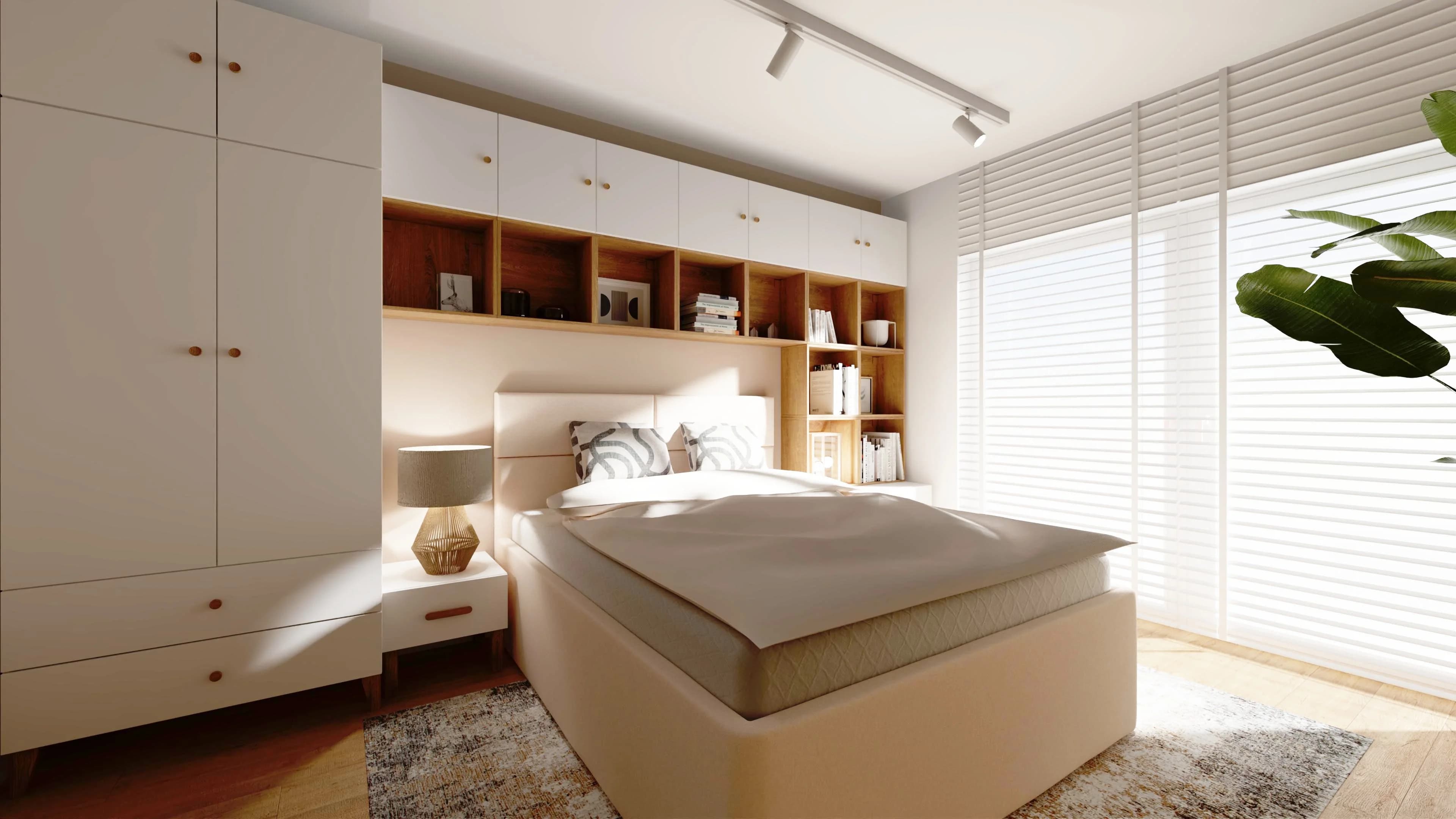 Jasna sypialnia z dużym oknem i zabudową wokół łóżka