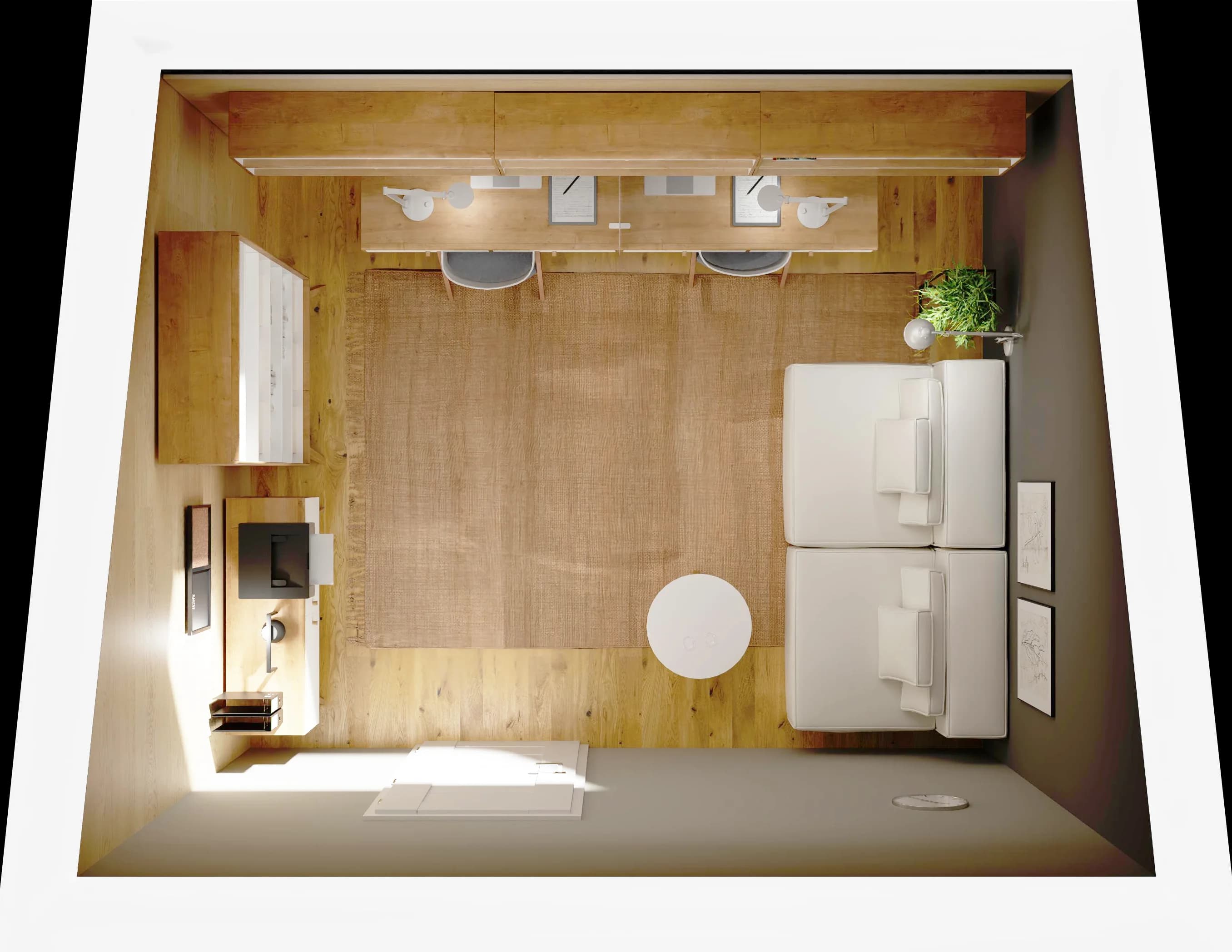 Centralny punkt tej aranżacji stanowią eleganckie biurka z szufladami i wygodnymi krzesłami. Na wiszących nad nimi półkach można zorganizować potrzebne rzeczy. Prywatność zapewnia dyskretny parawan. W stojącym tuż obok regale znajdzie się miejsce na ważne dokumenty. Po skończonej pracy wystarczy przenieść się na modułową sofę z miękkimi poduszkami.