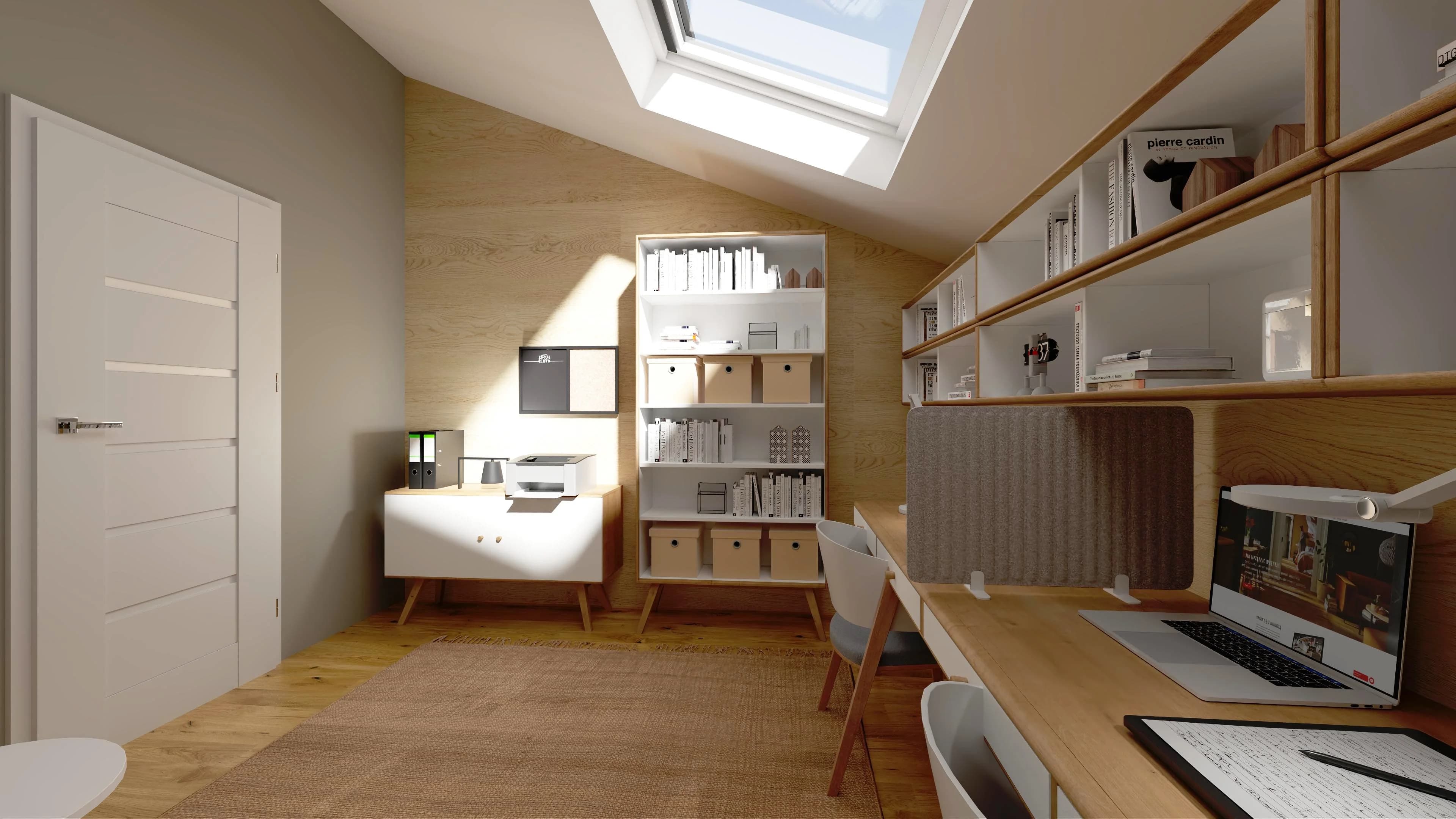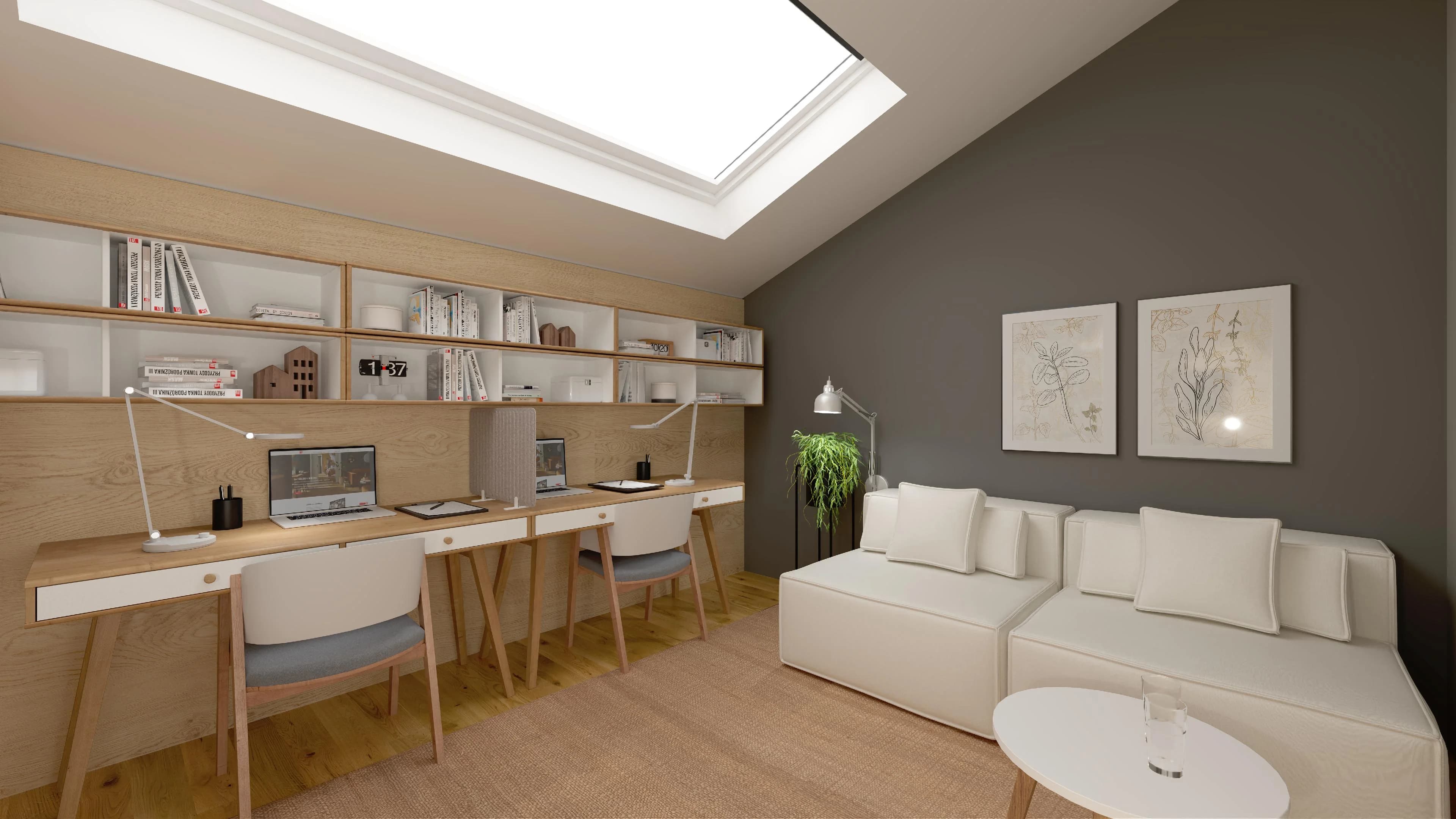 Jasny gabinet na poddaszu z dwoma biurkami