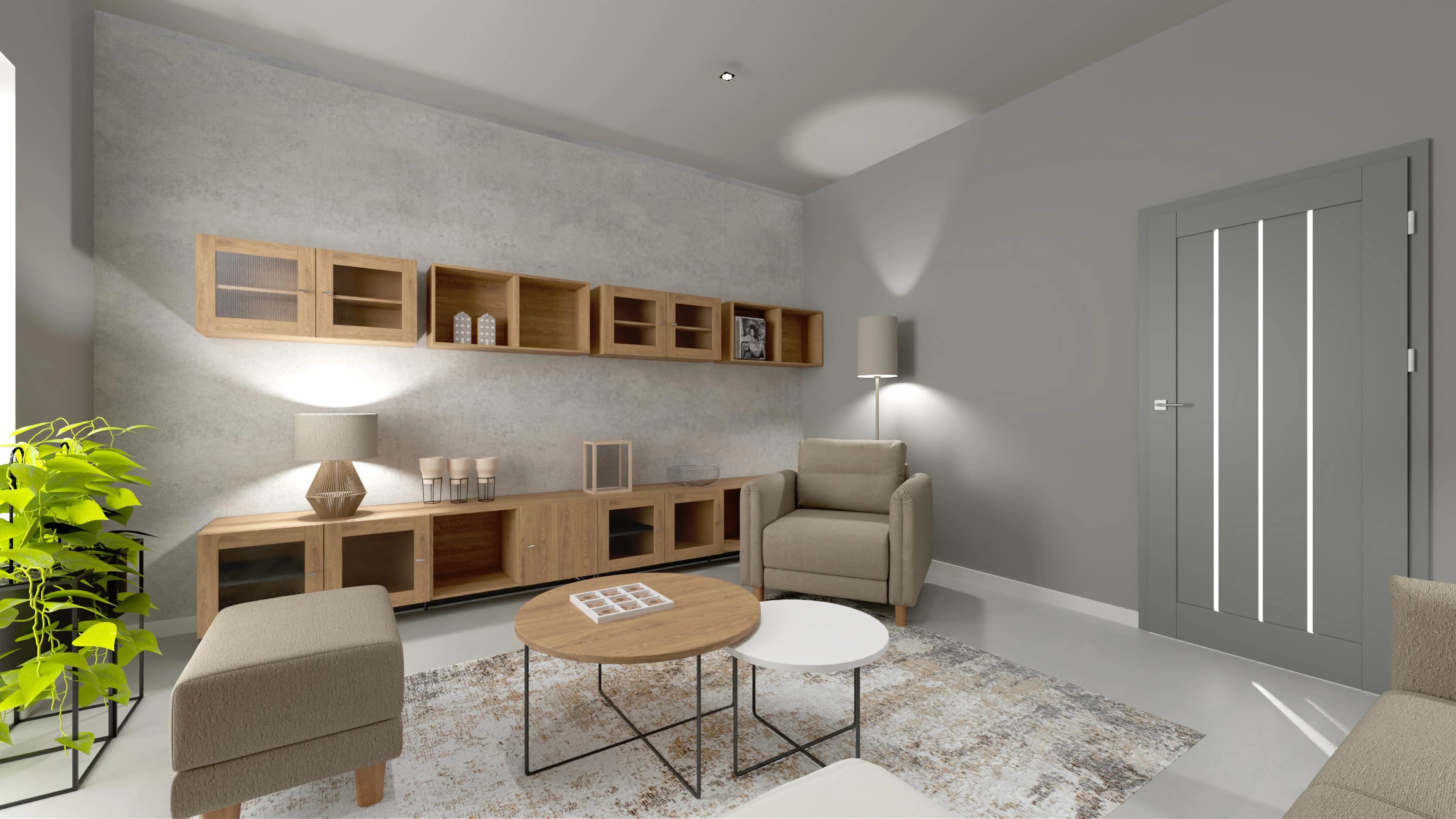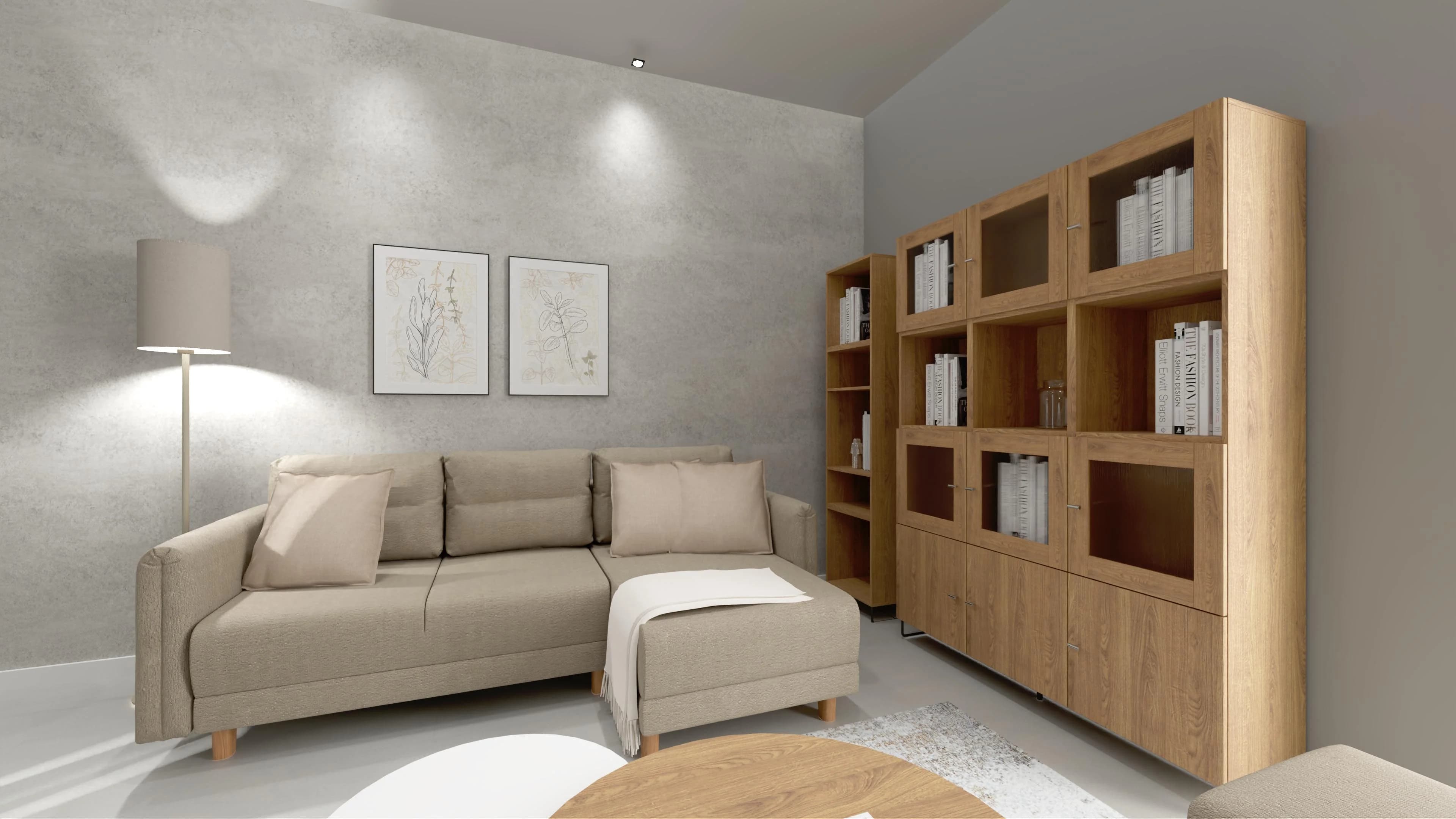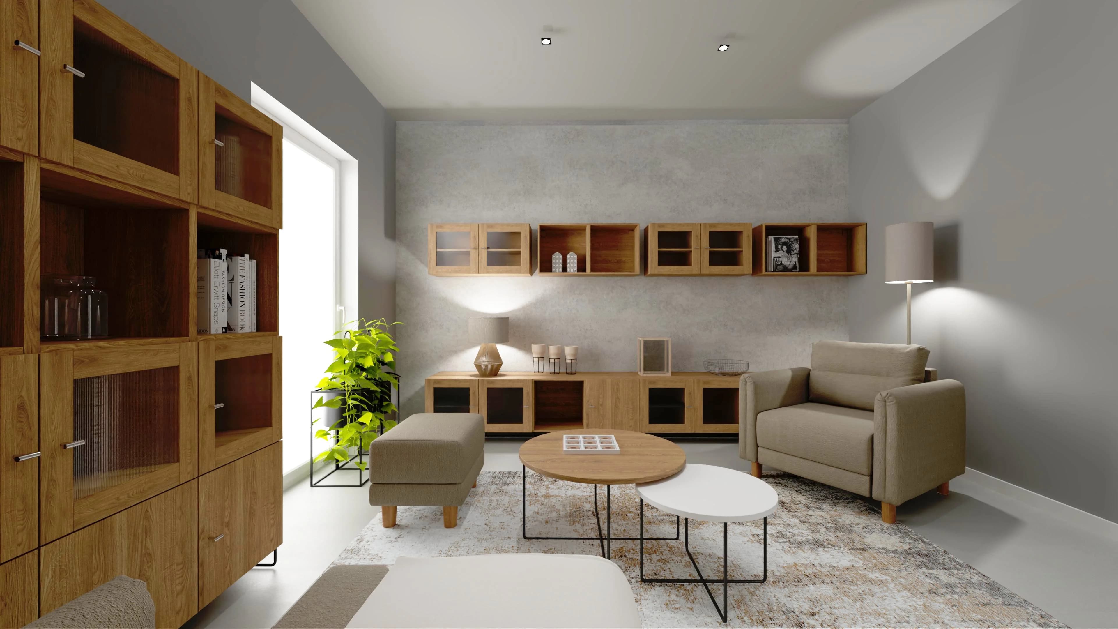Przestronna i komfortowa przestrzeń zaprasza do odpoczynku. Duży narożnik i towarzyszące mu fotel, puf i stoliki kawowe tworzą idealne miejsce wspólnych spotkań. Liczne szafki oferują wiele przestrzeni do przechowywania i pozwalają wyeksponować pamiątki. Nowoczesnego charakteru nadają wnętrzu betonowe ściany i minimalistyczne dodatki, takie jak miękki dywan.