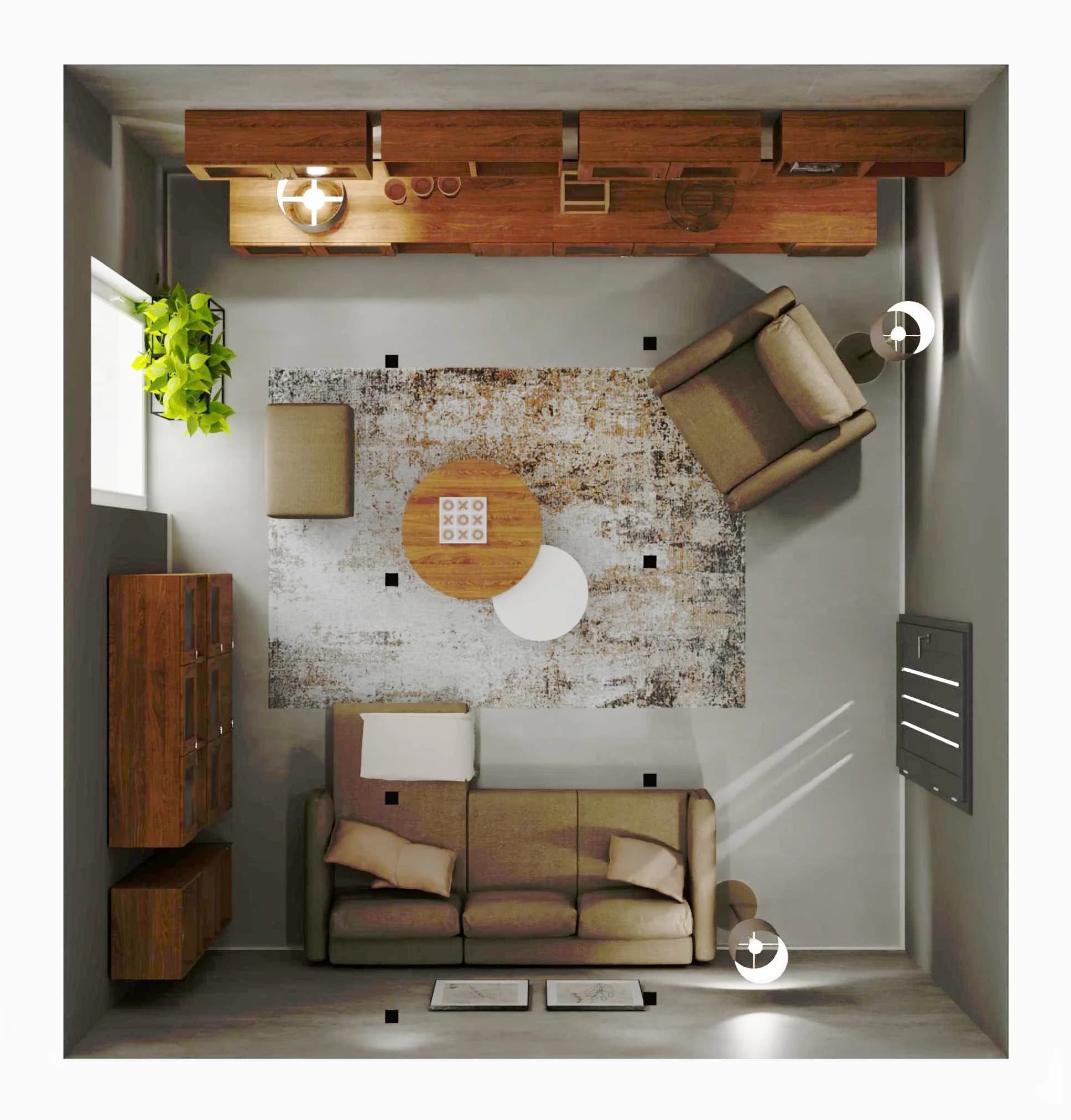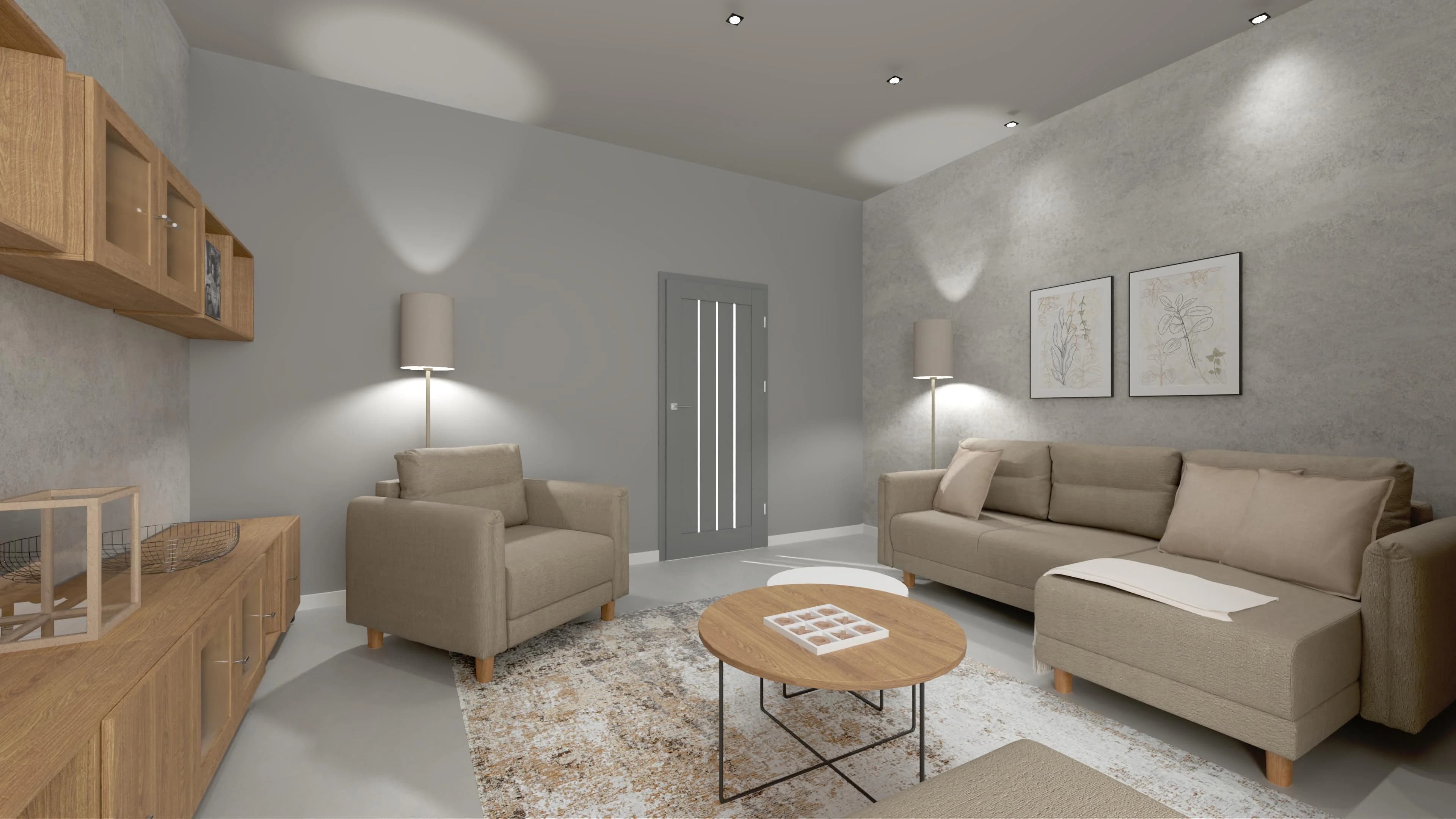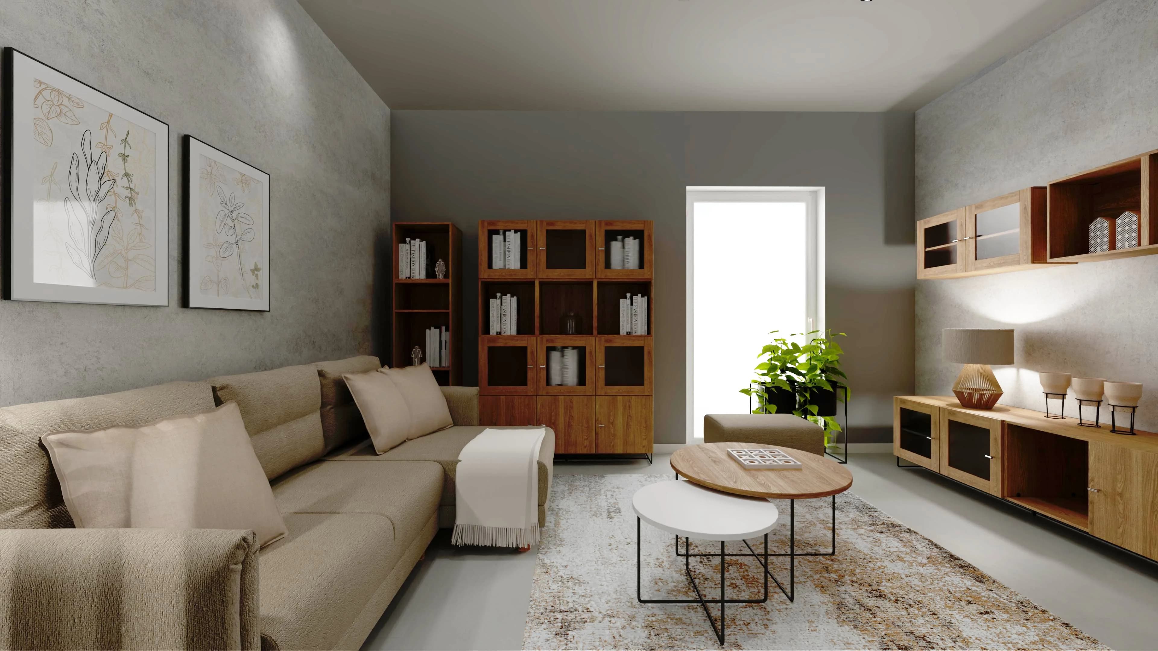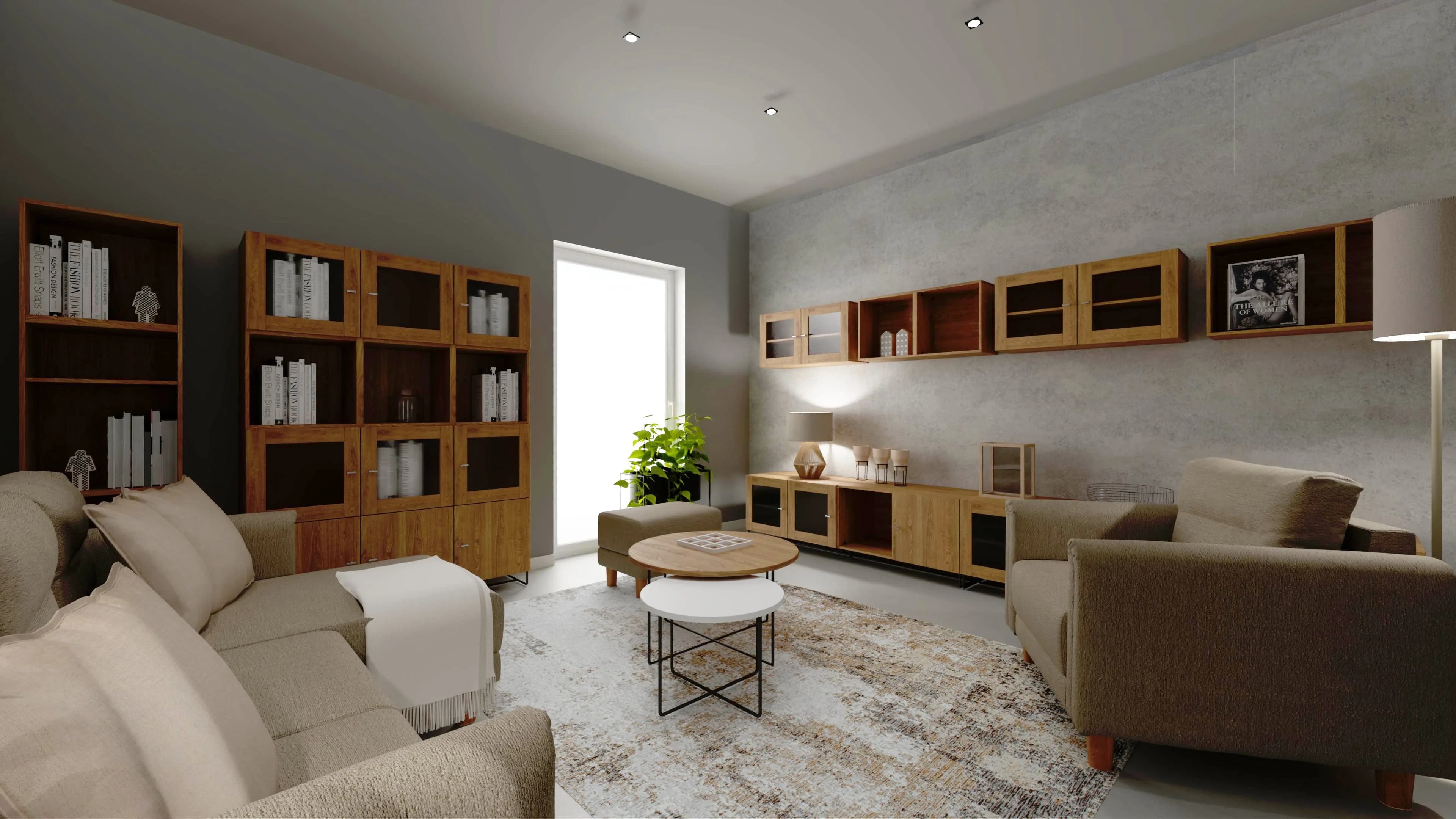 Przestronna i komfortowa przestrzeń zaprasza do odpoczynku. Duży narożnik i towarzyszące mu fotel, puf i stoliki kawowe tworzą idealne miejsce wspólnych spotkań. Liczne szafki oferują wiele przestrzeni do przechowywania i pozwalają wyeksponować pamiątki. Nowoczesnego charakteru nadają wnętrzu betonowe ściany i minimalistyczne dodatki, takie jak miękki dywan.